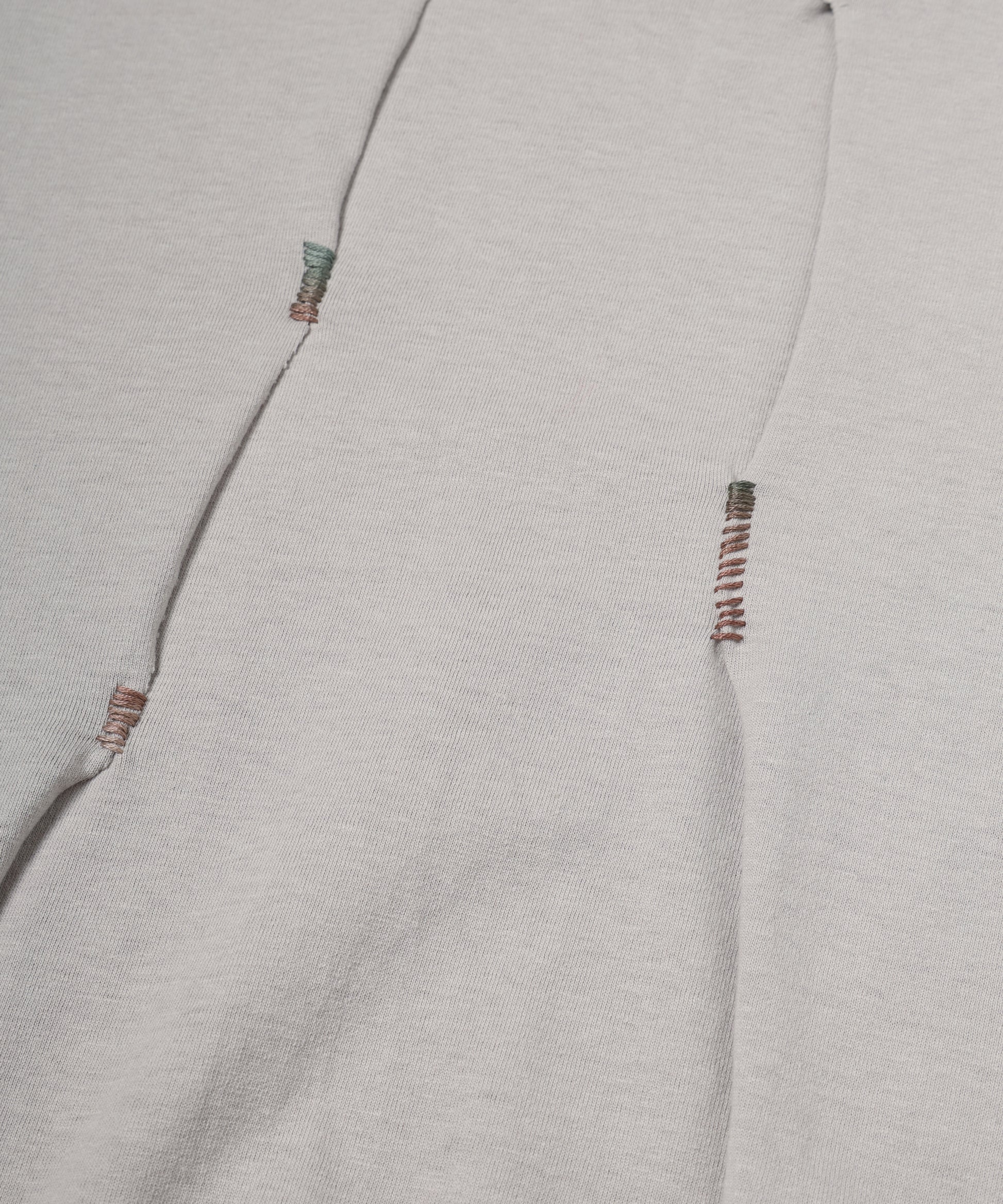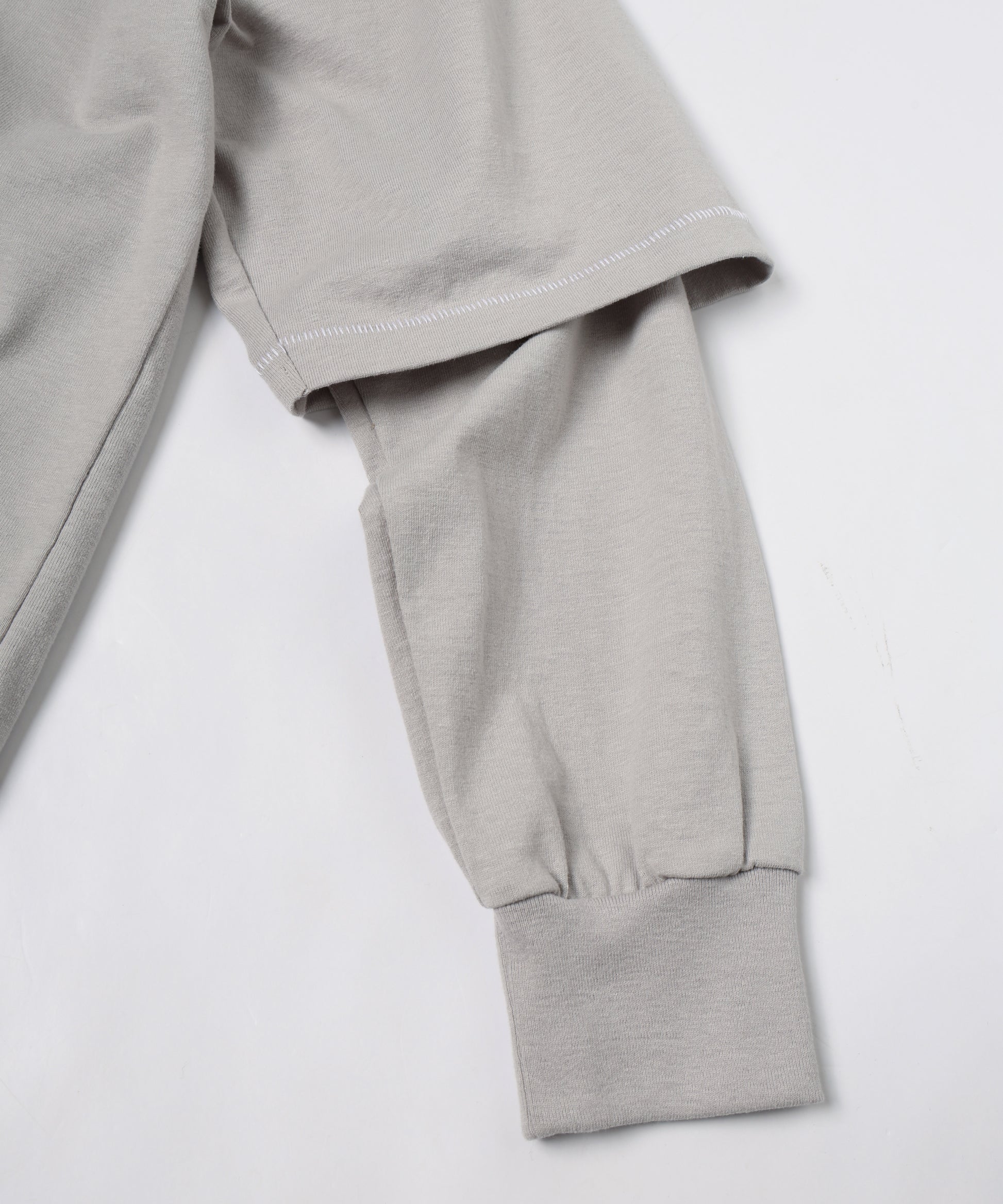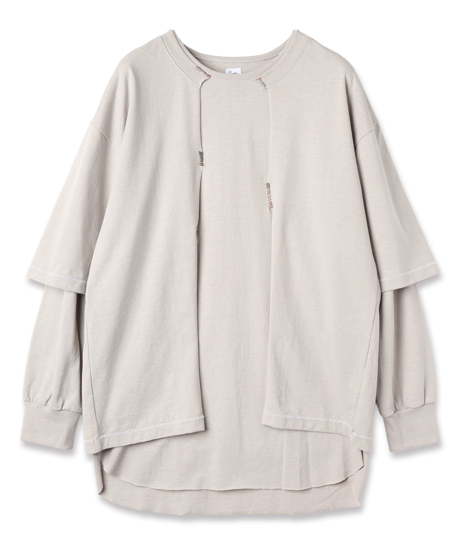 長袖カットソーの上から重ねた半袖は、デザイナー自身の手によって一点一点刺繍糸で縫い止められ、ボディとドッキングされています。