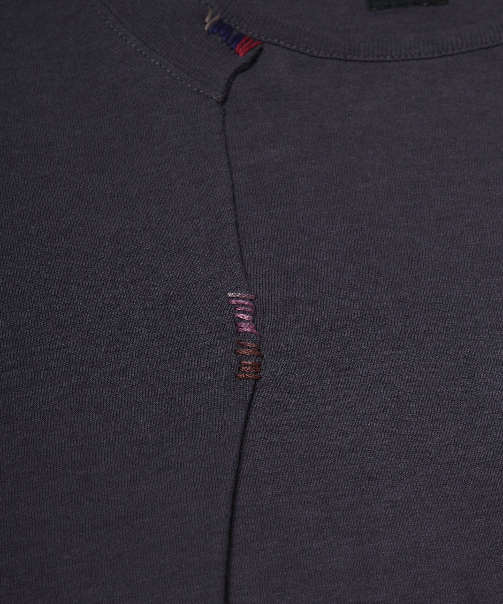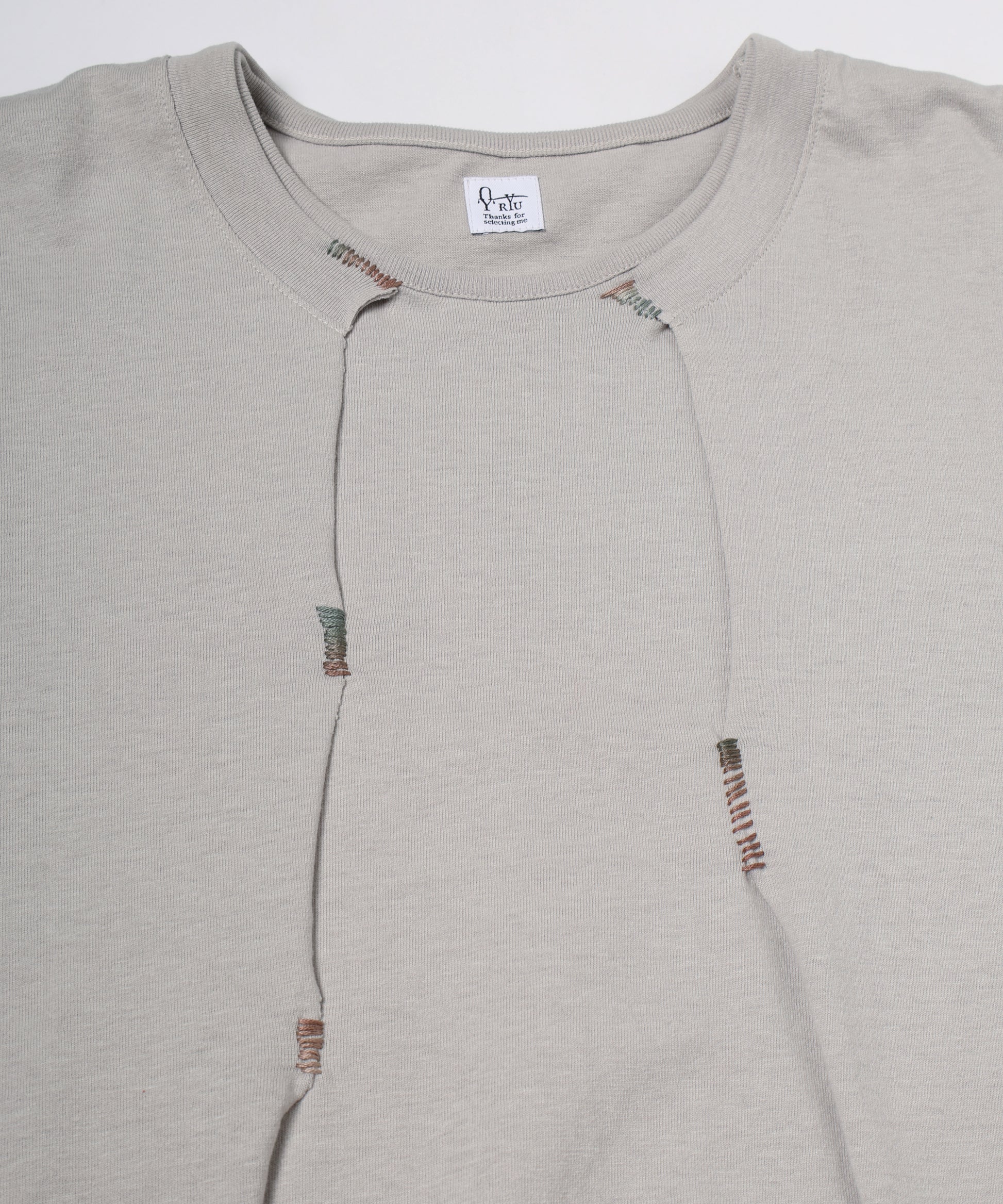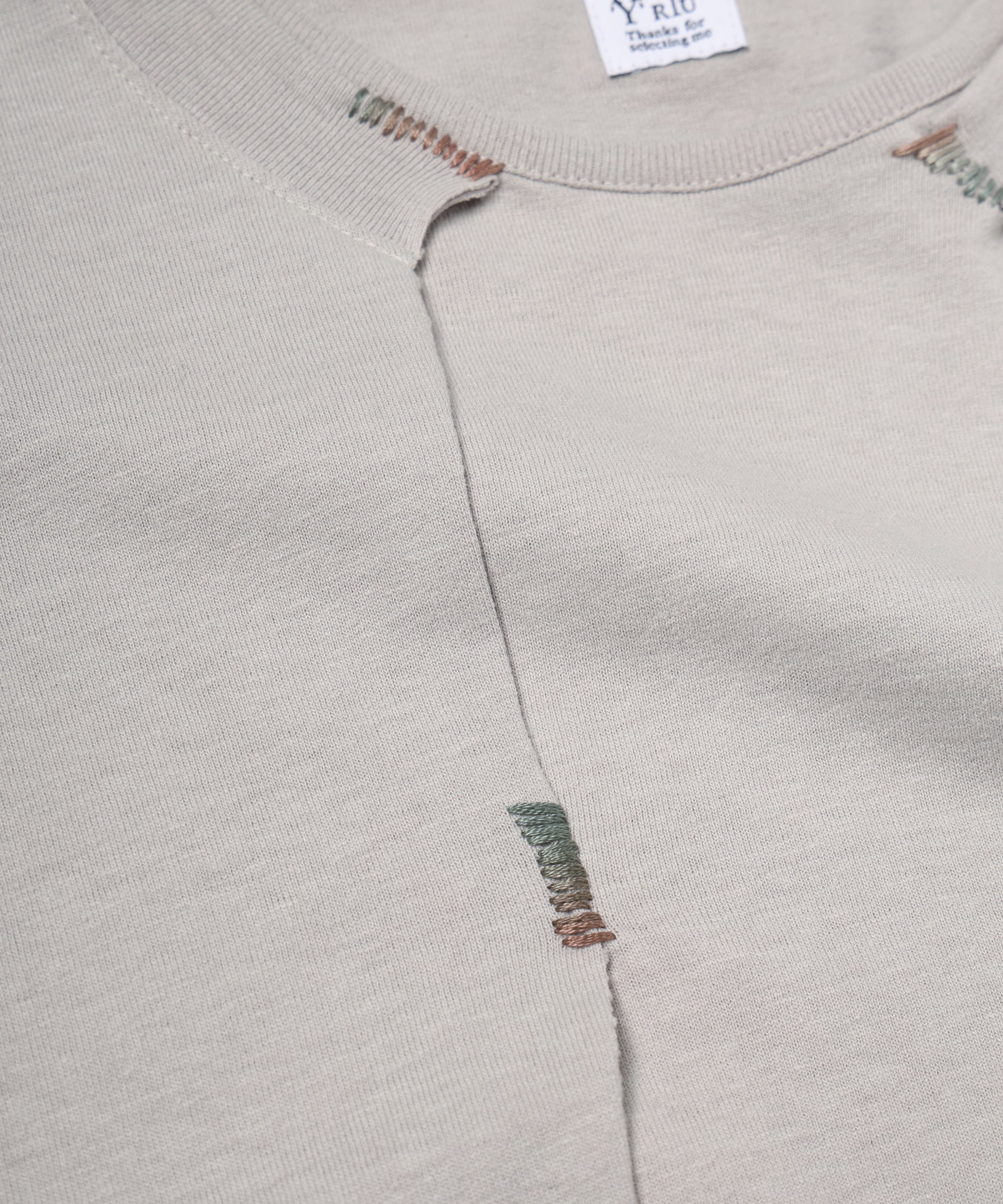 長袖カットソーの上から重ねた半袖は、デザイナー自身の手によって一点一点刺繍糸で縫い止められ、ボディとドッキングされています。
