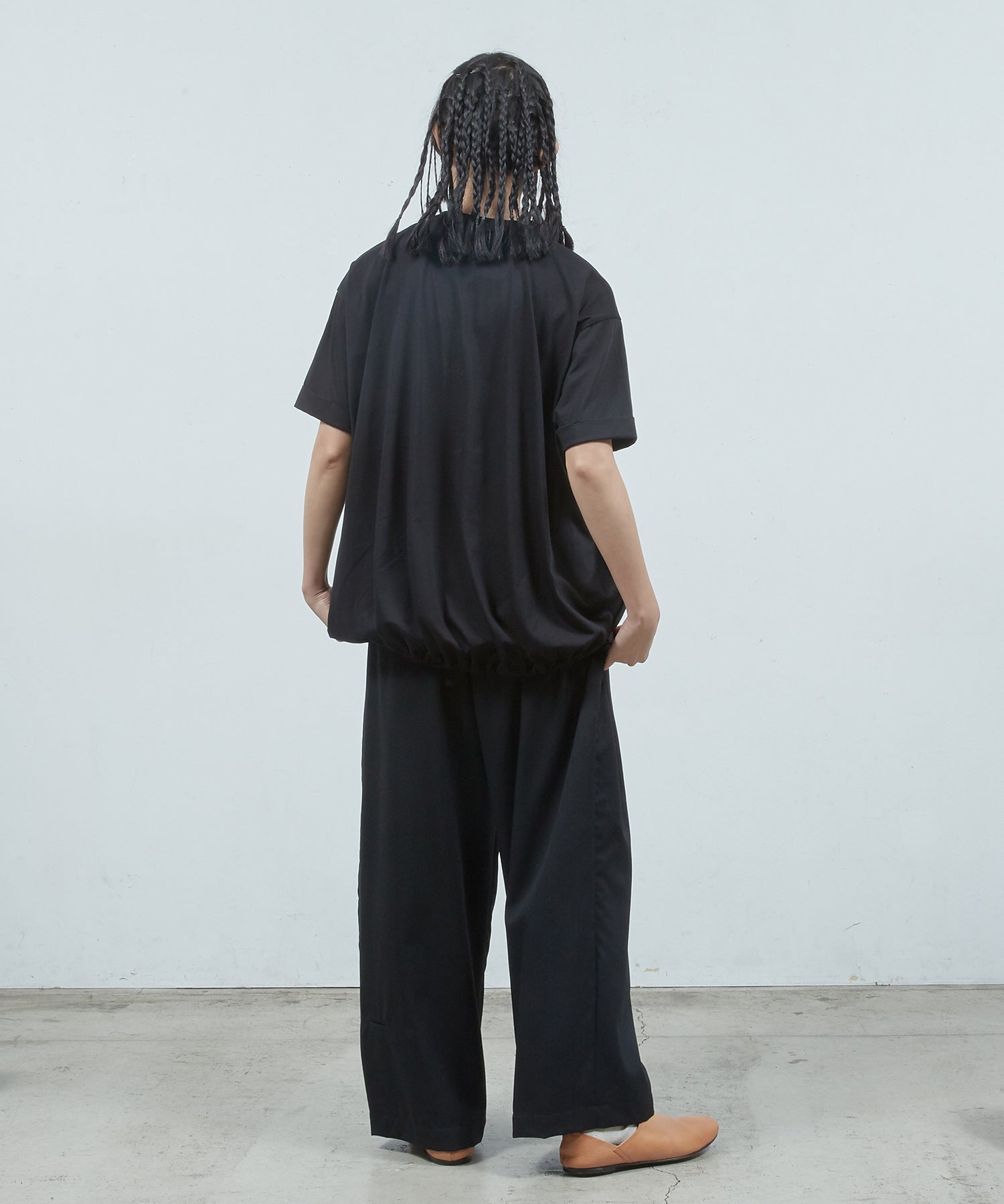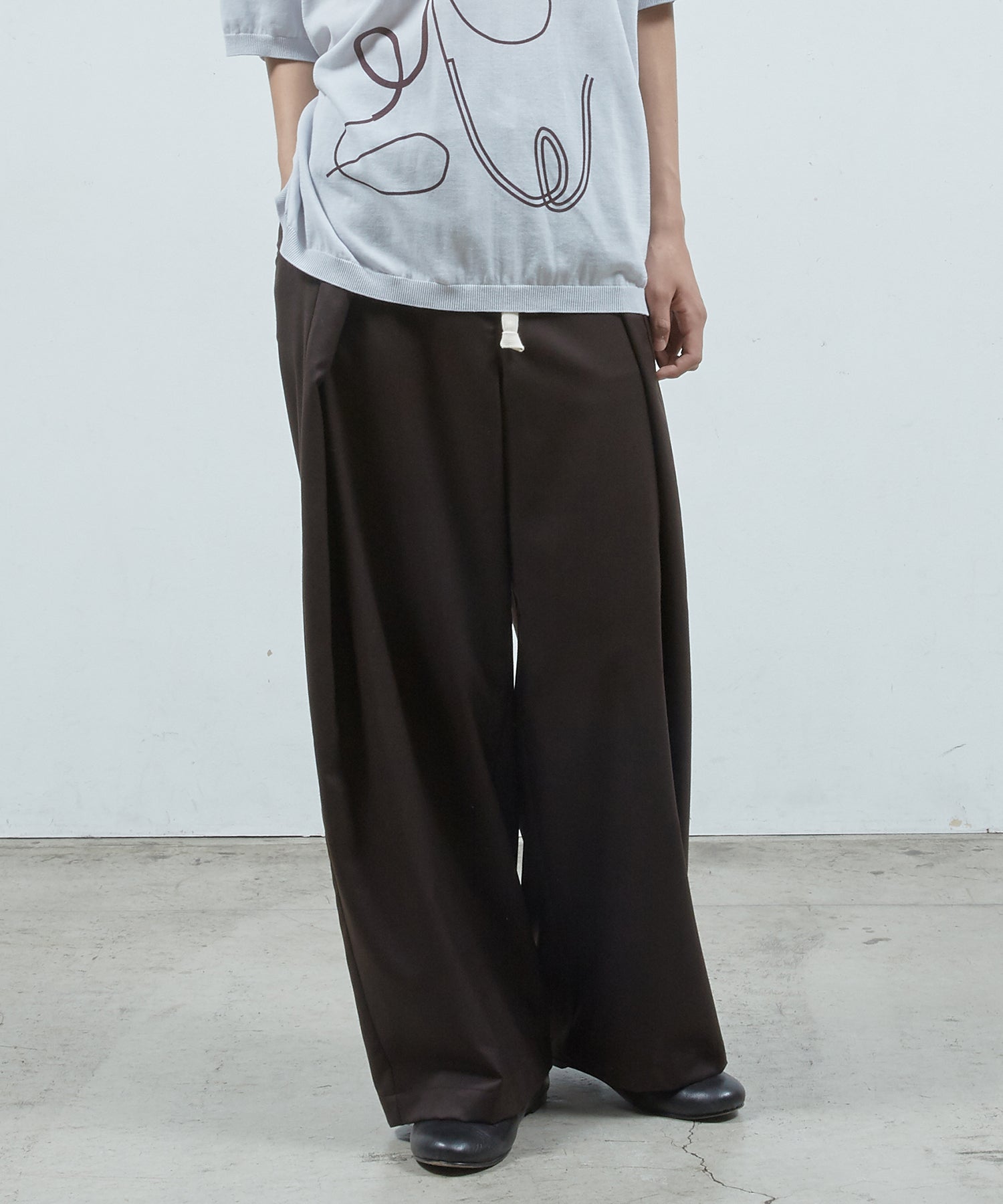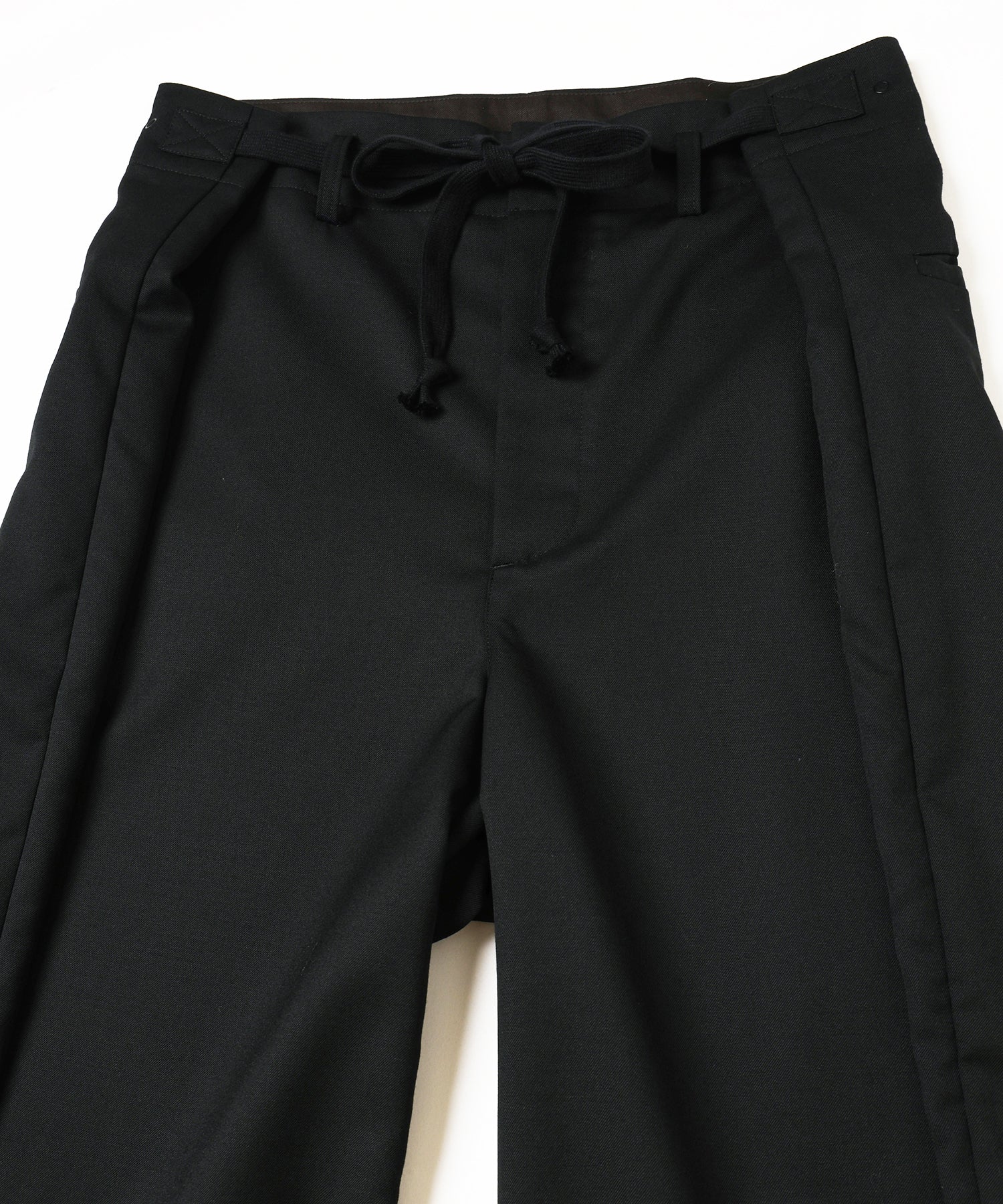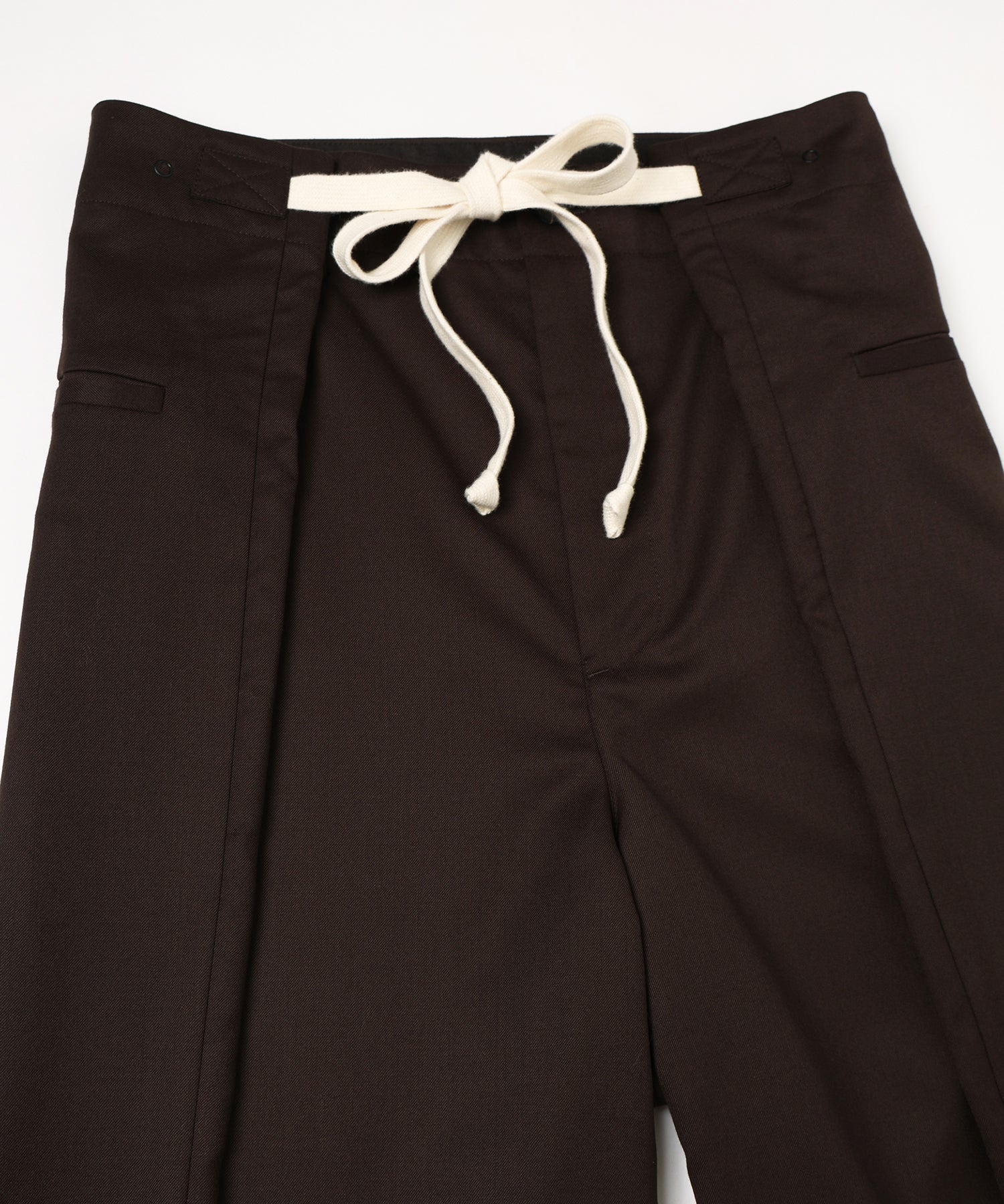 左右をたたみ、ウエストのコードで絞り固定することで、ラップパンツのようなフォルムをを描きます。