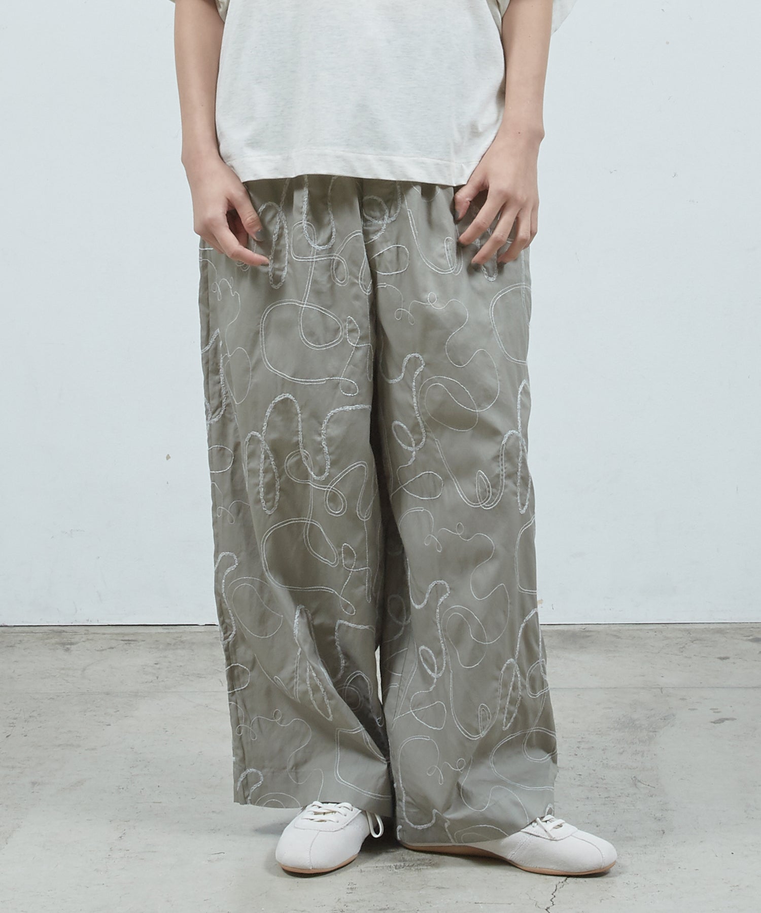 ボリュームのあるワイドシルエットが特徴。ウエストにはナチュラルな印象の紐と通しています。
