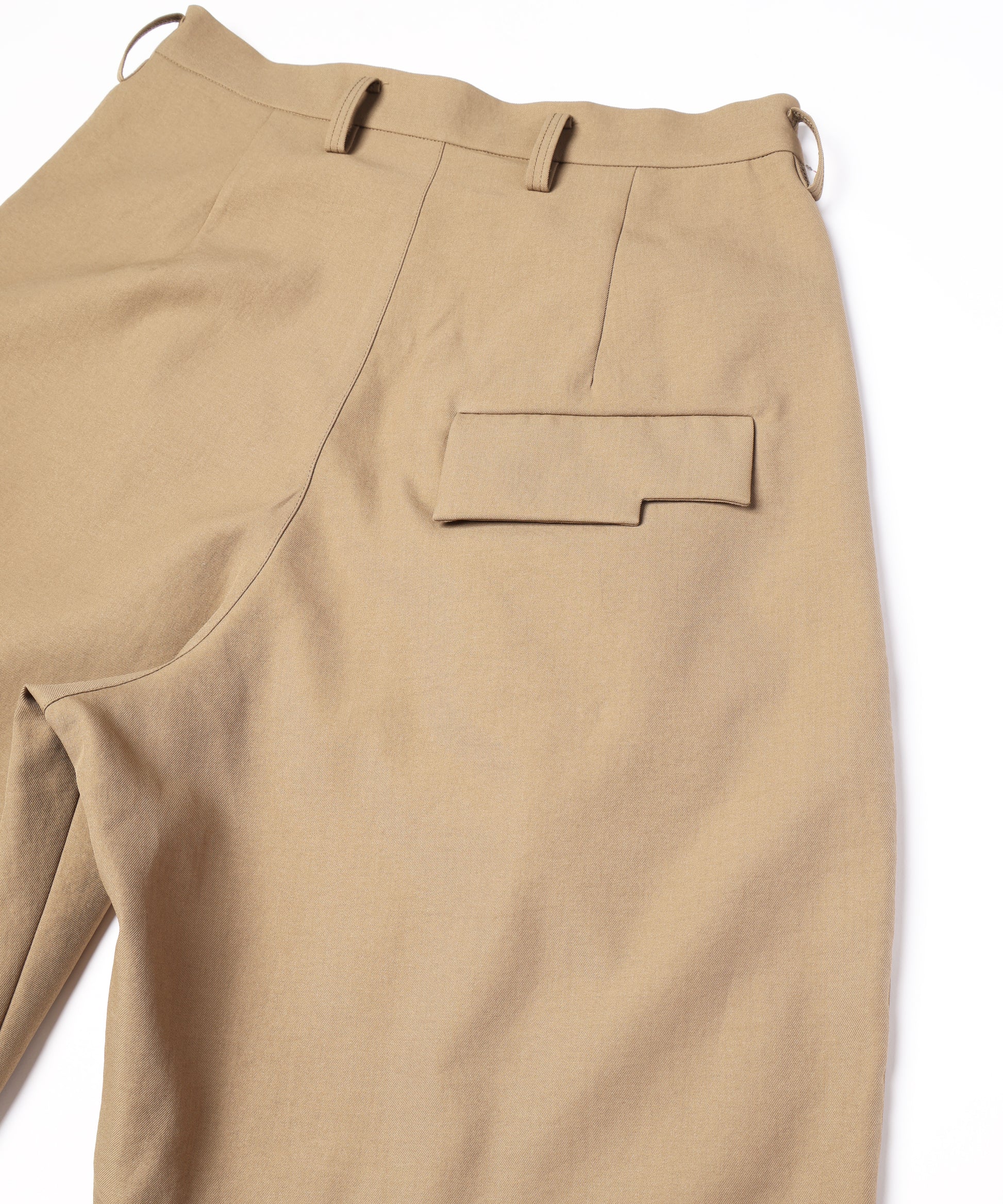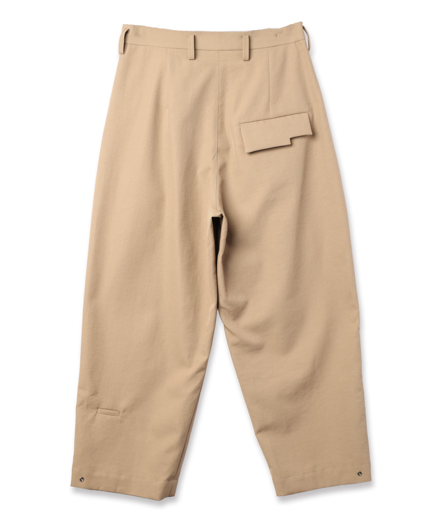 裾口にはスナップボタンを装飾し、ボタンを留めることでワイドからテーパードのシルエットを変えることが可能です。