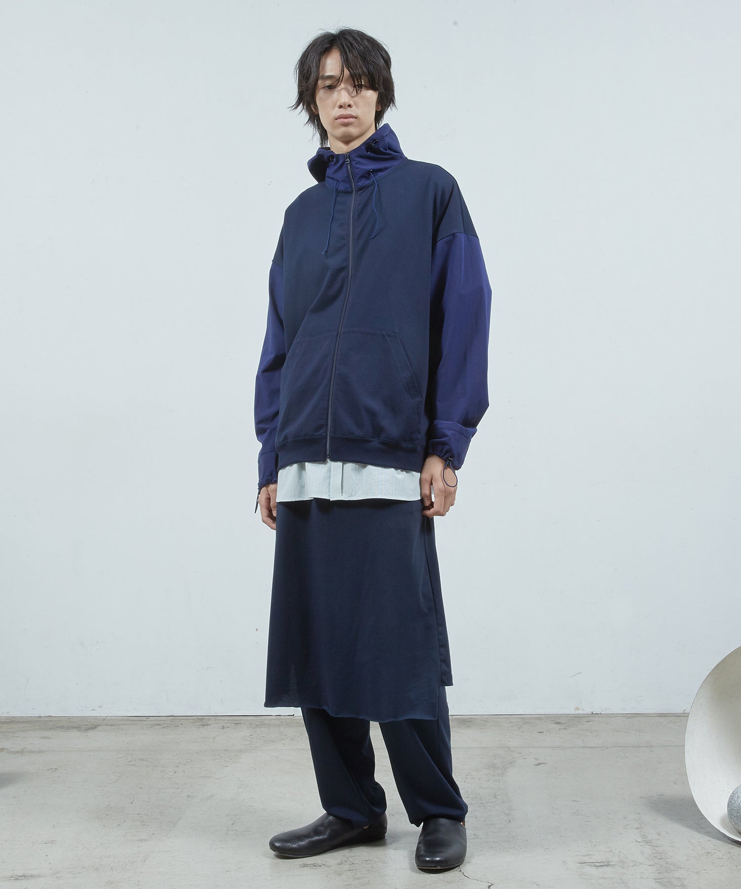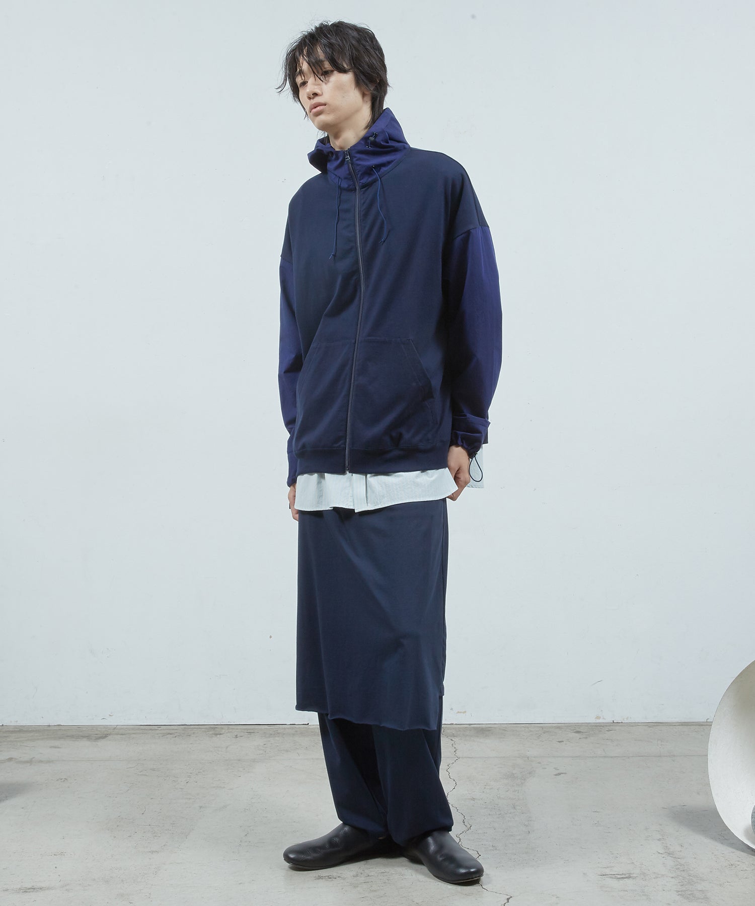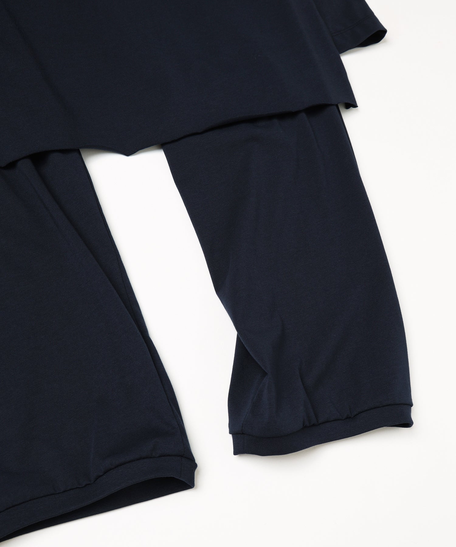 ベーシックなストレートシルエットのパンツにスカートをレイヤードしました。