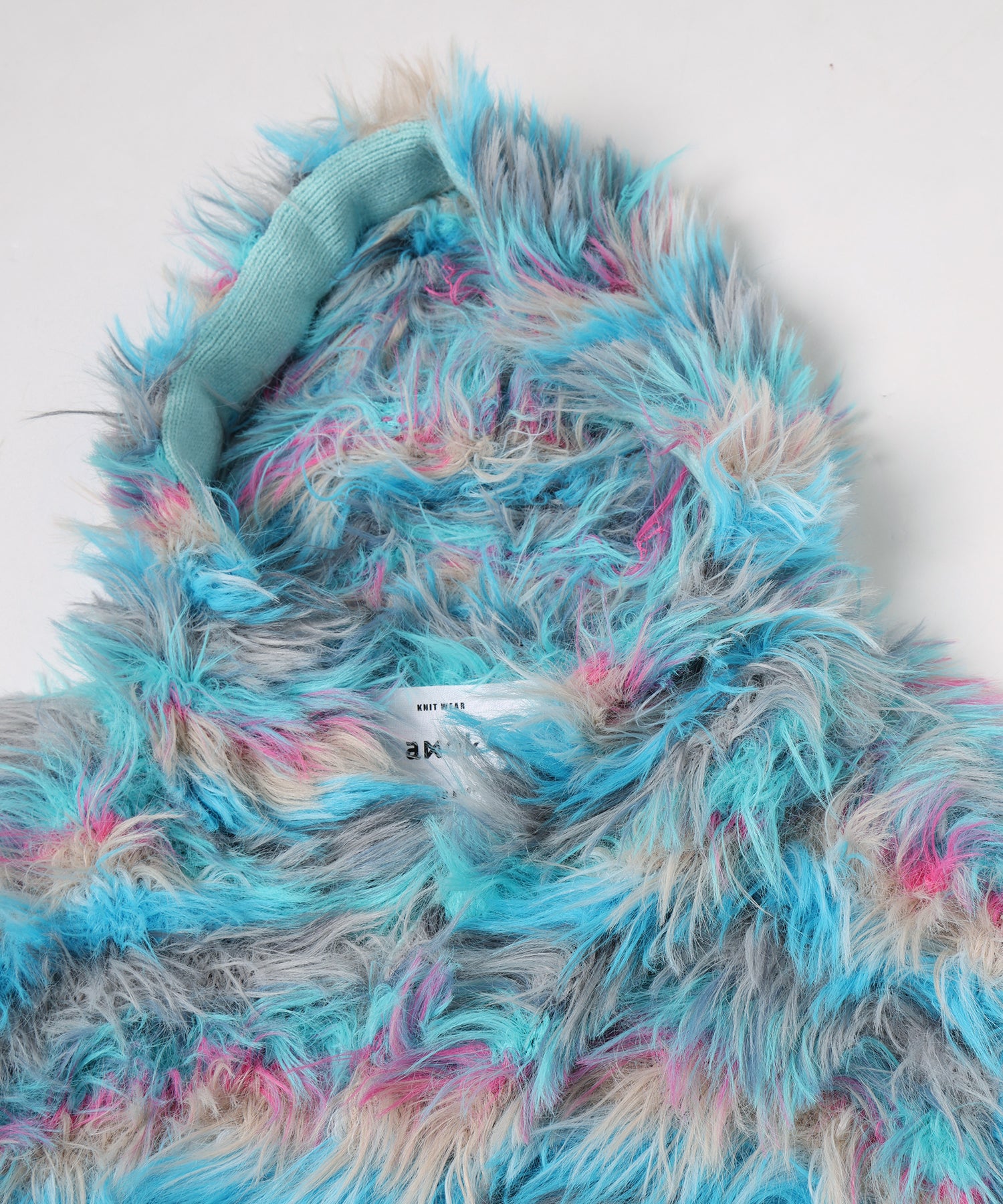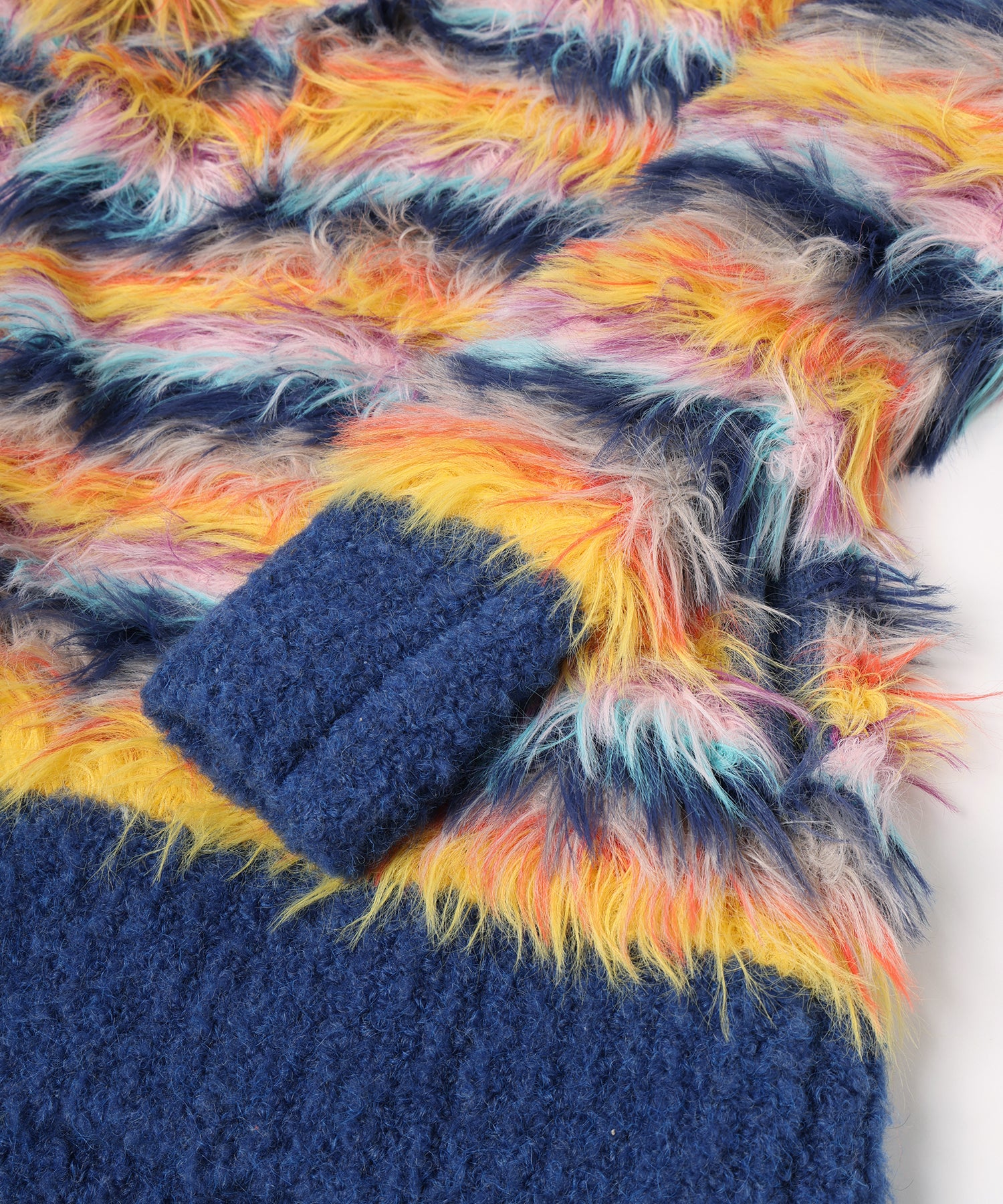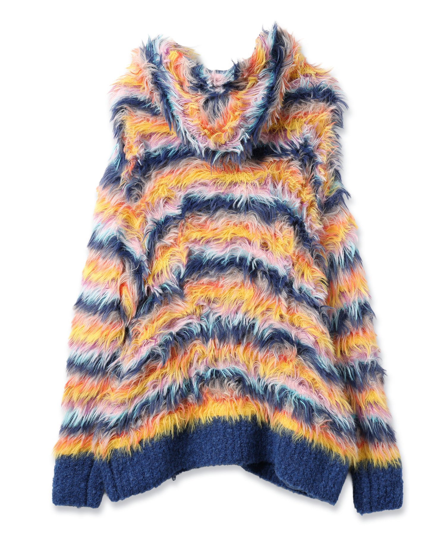 ボーダーは8色の糸を使用し表面感のある毛足長い糸を手編みて編む事で柔らから仕上がり。