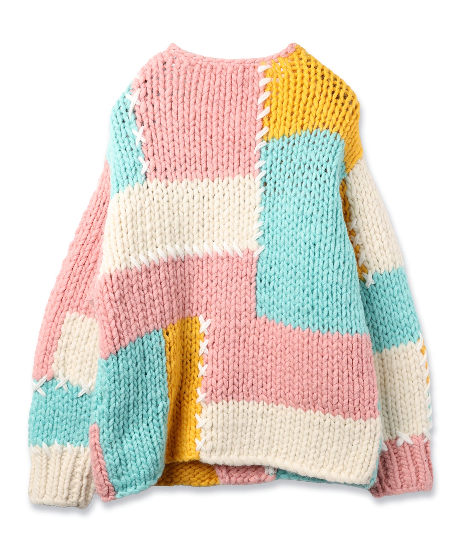全て手編みて編む事で柔らから仕上げています。4色の糸を使用したパッチワークと縫い目に手刺繍をアクセントで施しました。