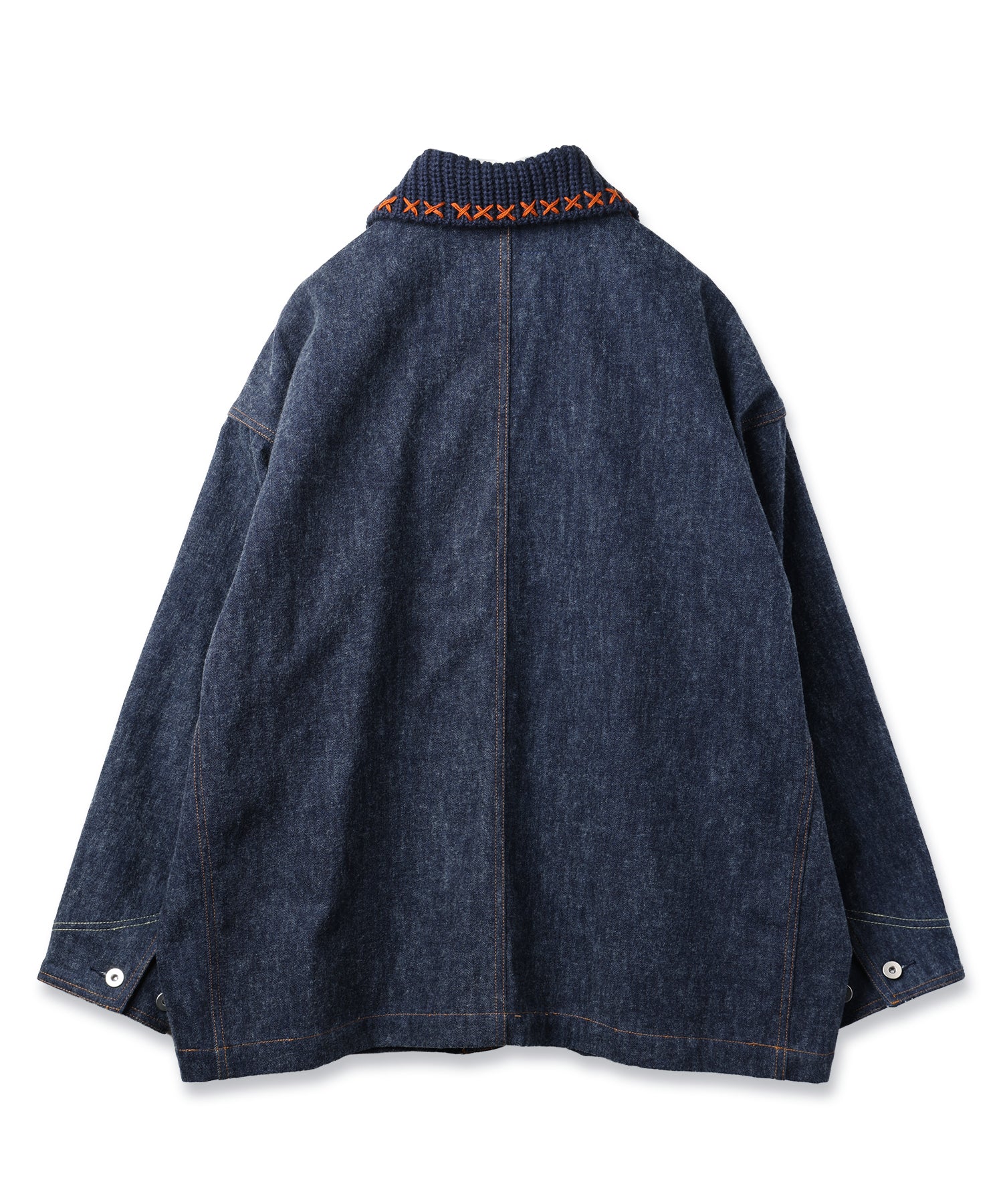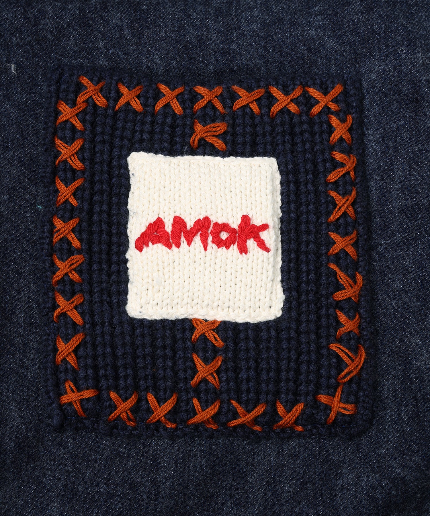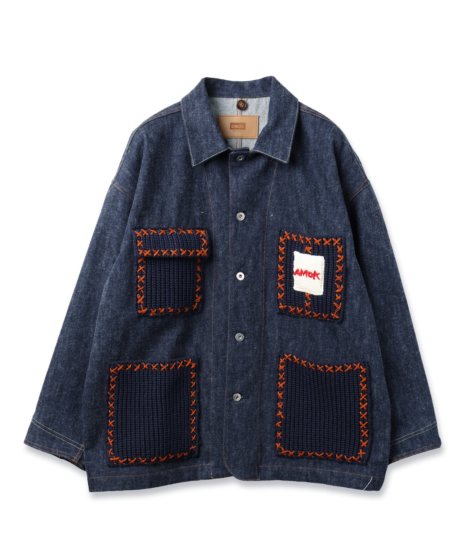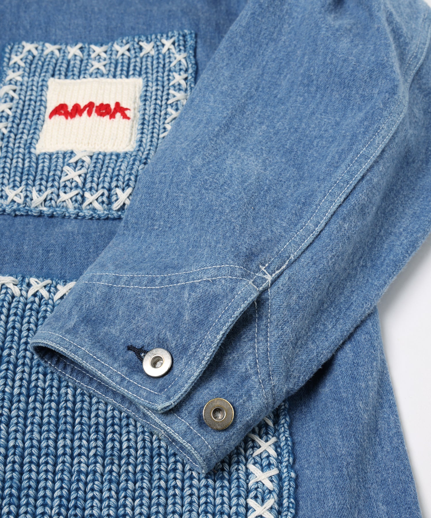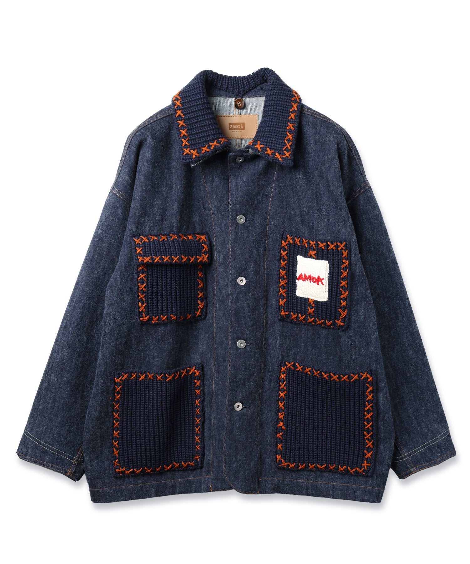 衿、ポケットのディテール部分にはインディゴ糸のニットを編み立て手刺繍でクロスステッチを施しワッペンネームもニットで表現。
