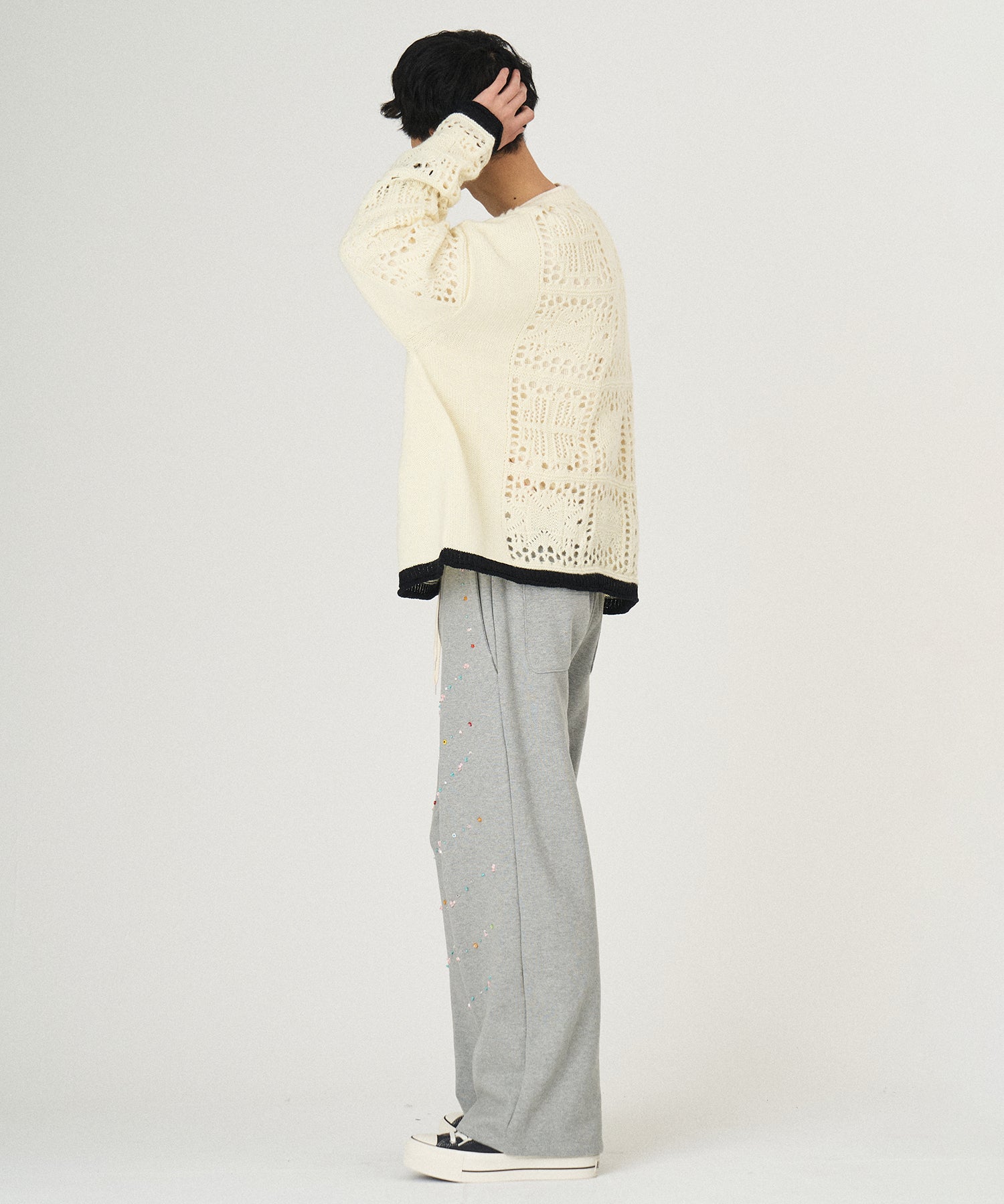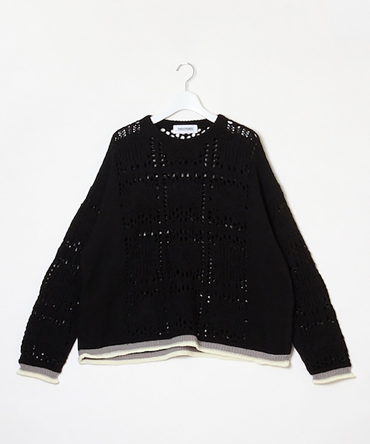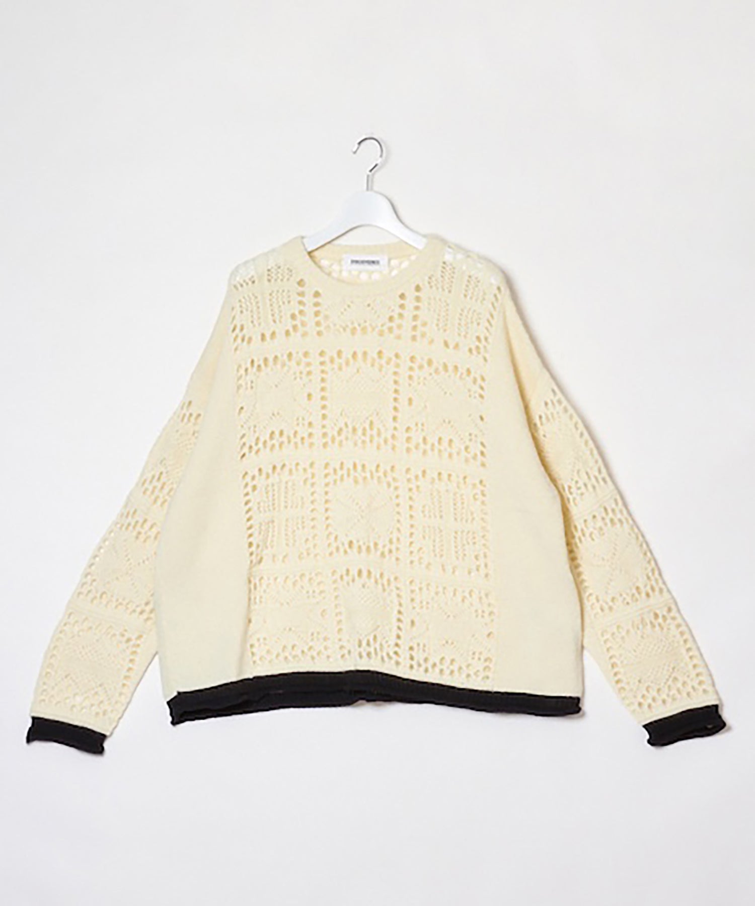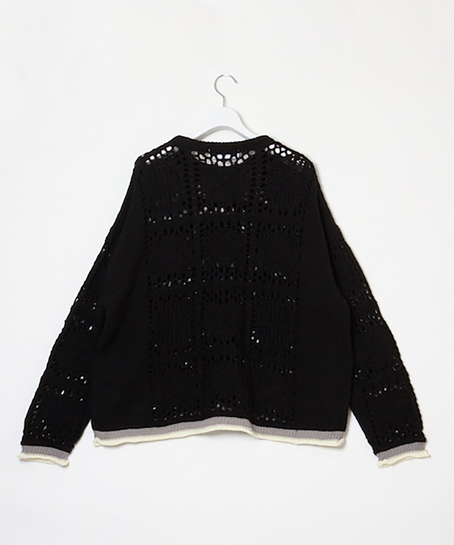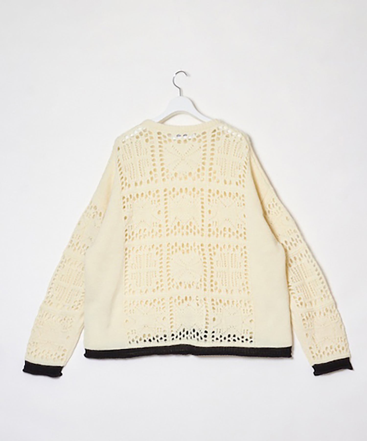 袖、裾口に配された捨て編みデザインのカラーコントラスト。
