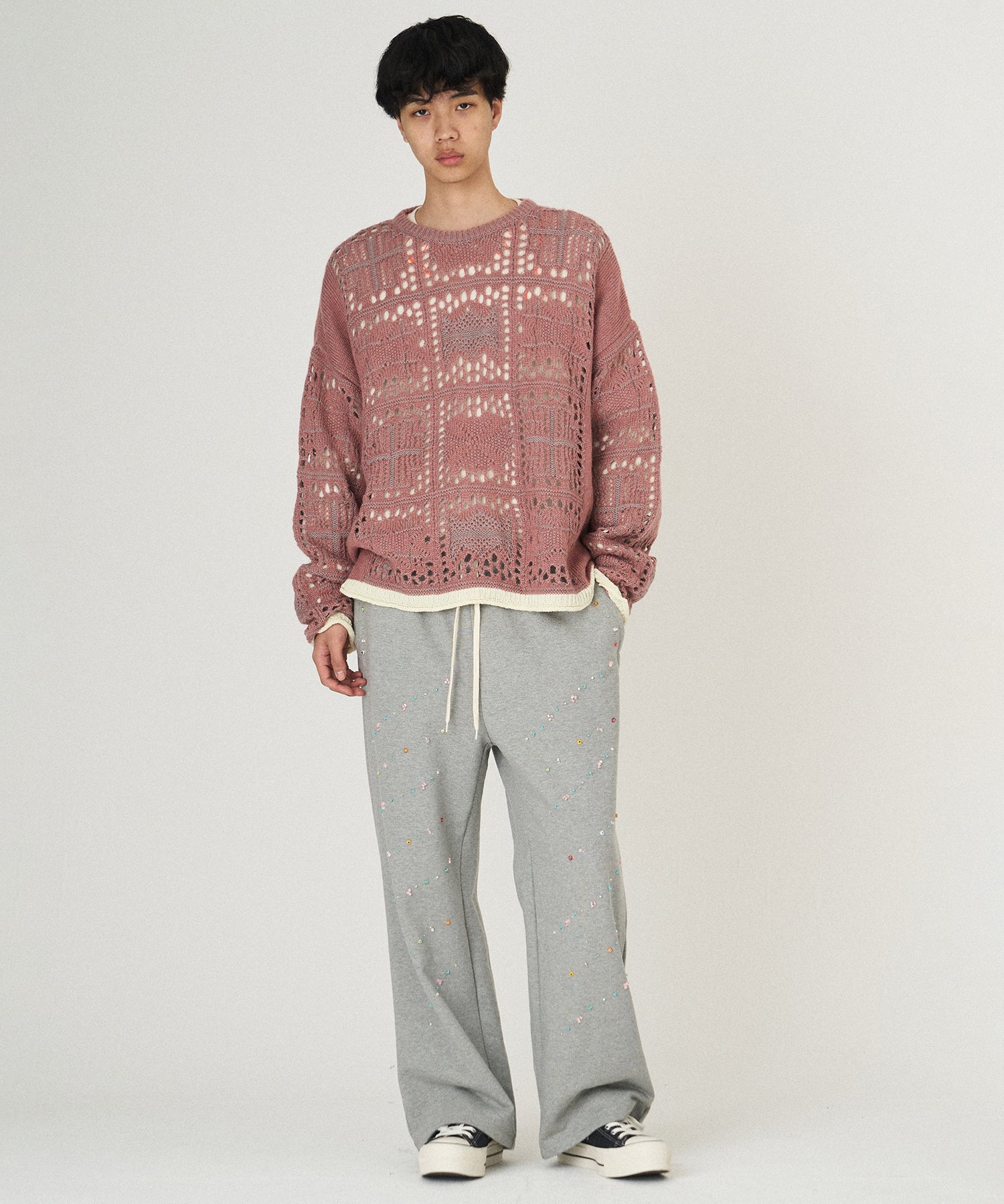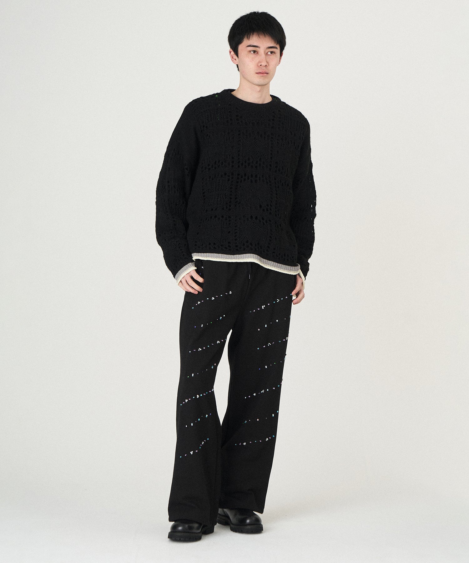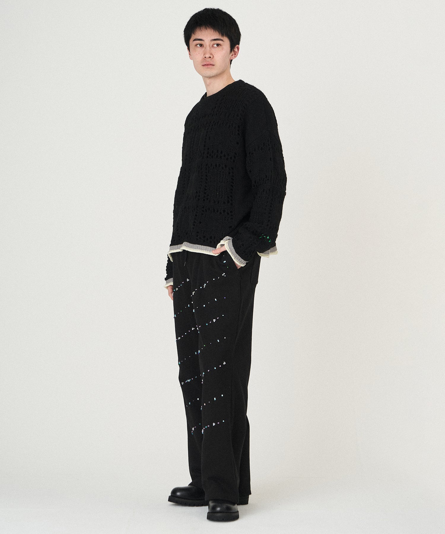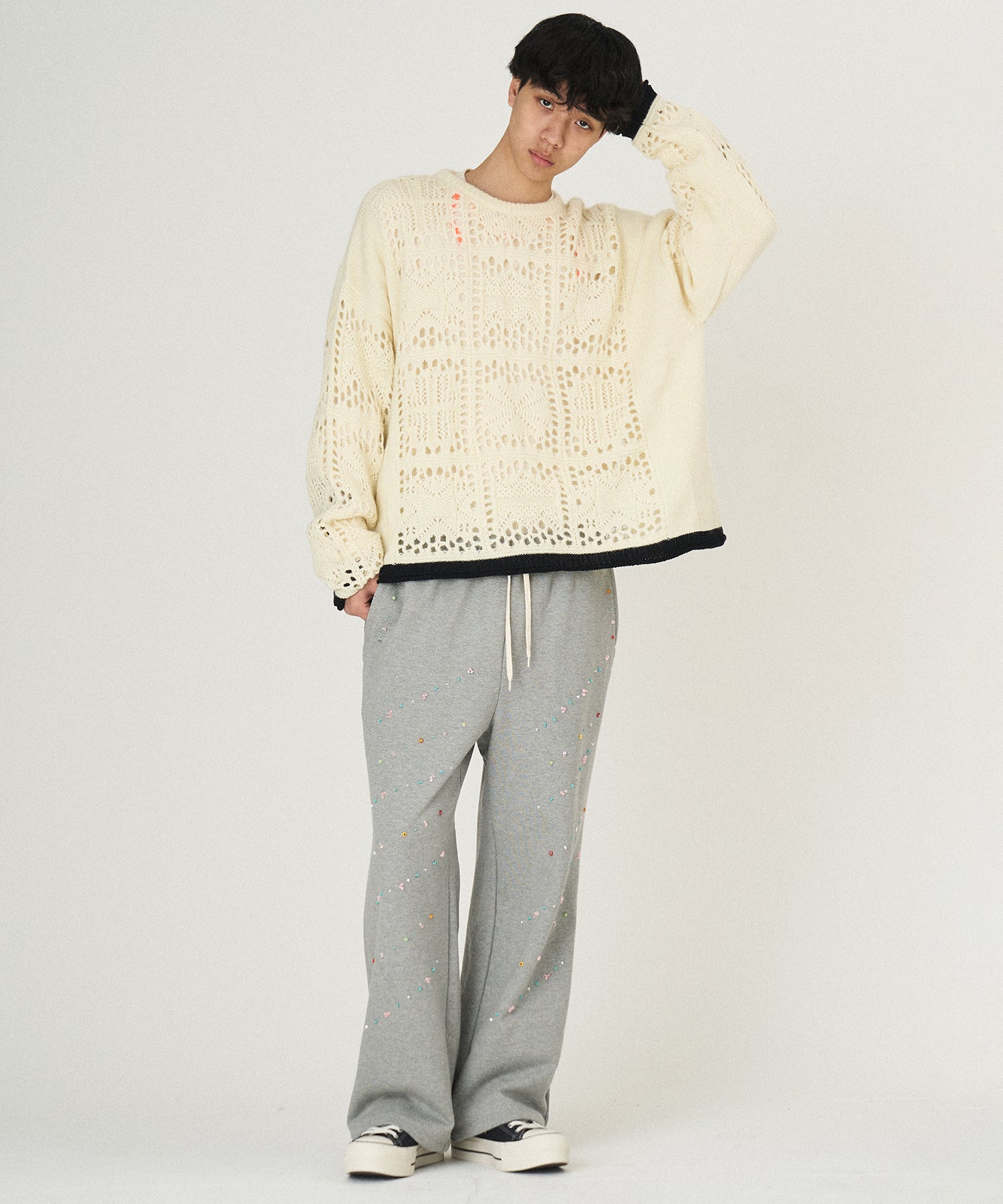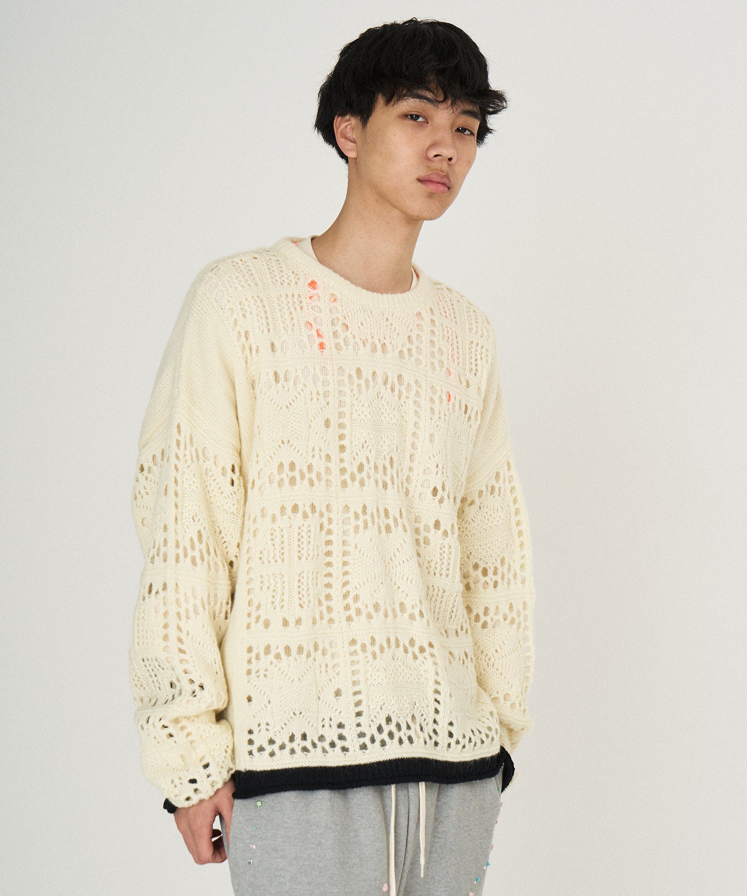 袖、裾口に配された捨て編みデザインのカラーコントラスト。