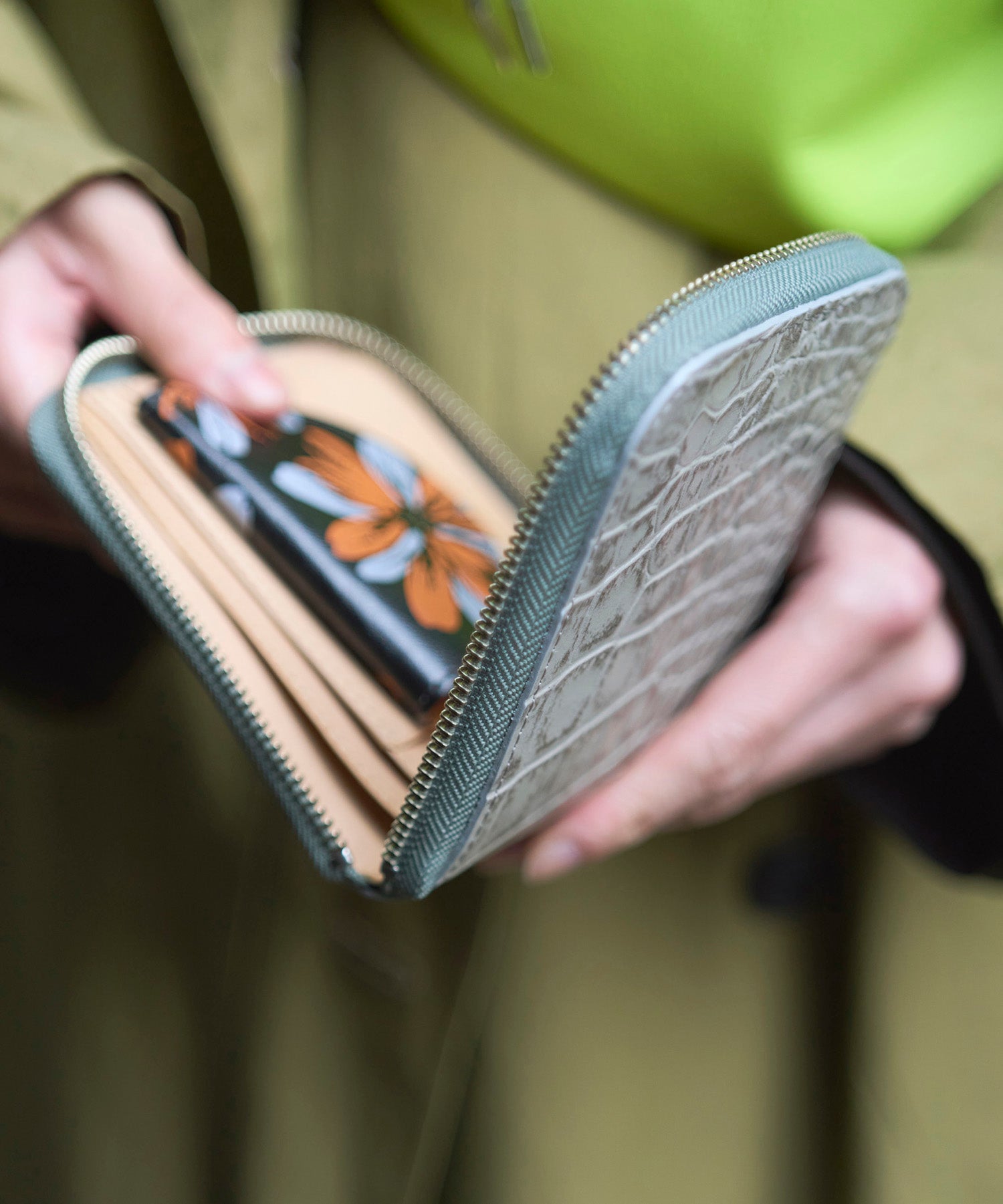 グラフィカルなハーフサークル型のコインポケットにカラーを添え、開けたときのワクワク感を演出。