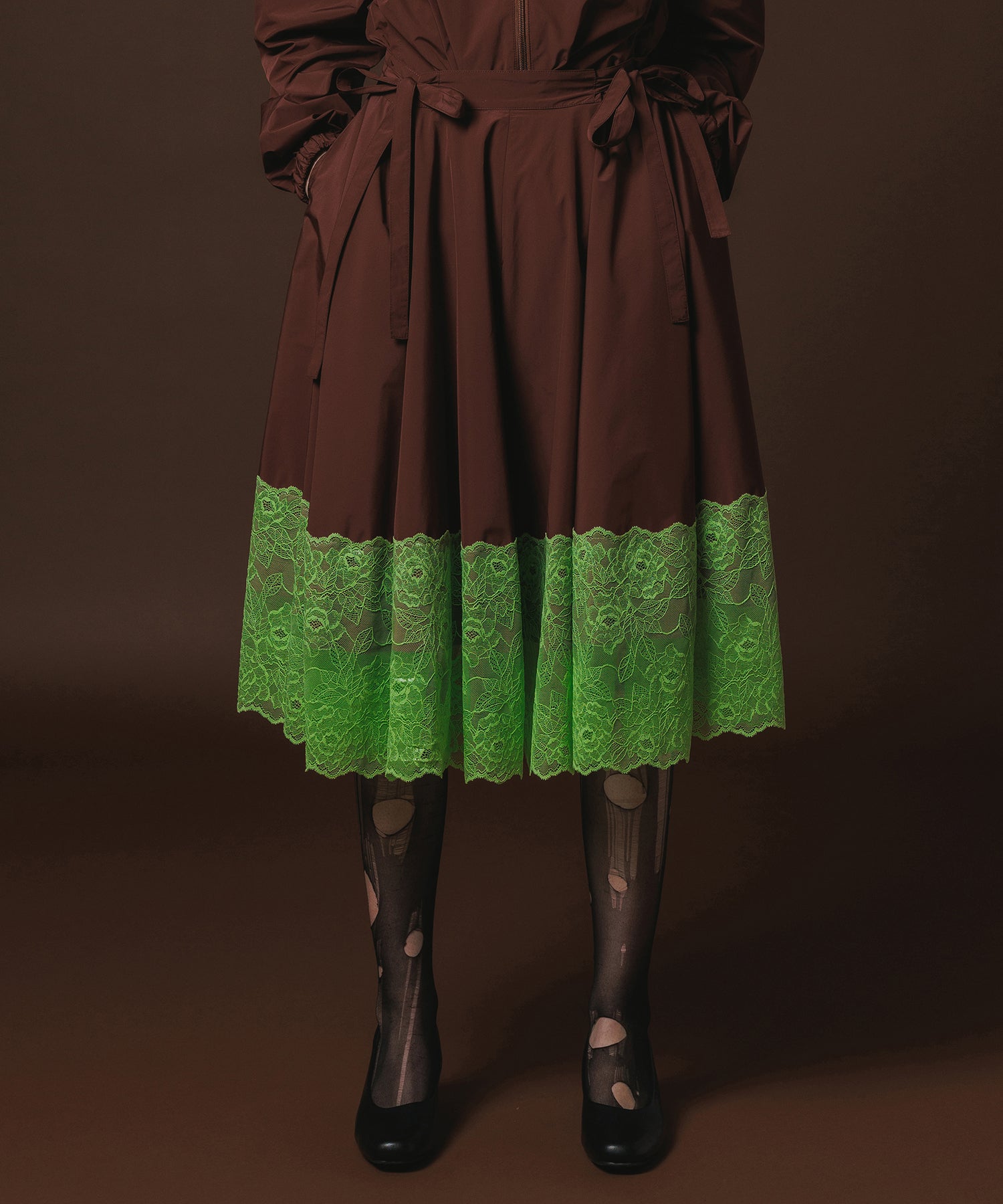 ウエストについた共地のリボンでサイズ調整が可能です。