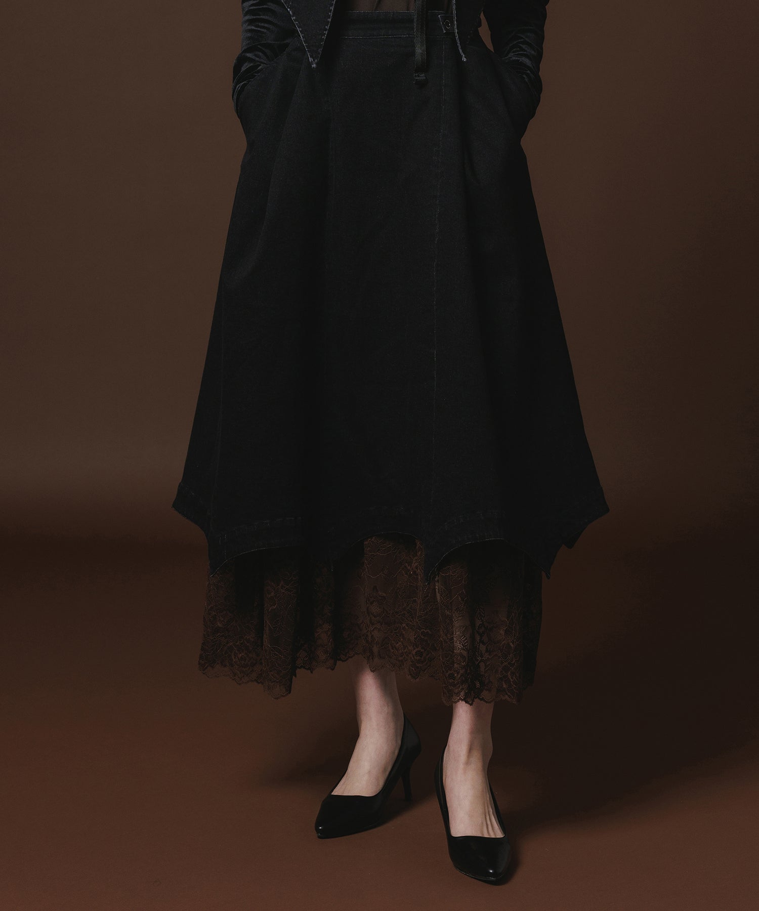 BATWING HEM DENIM & LACE SKIRT