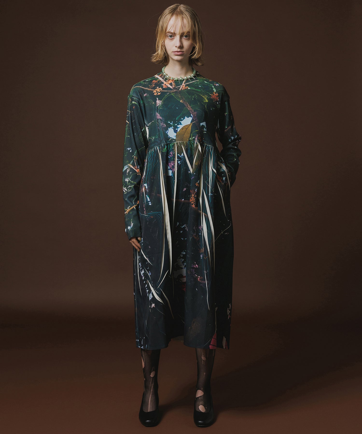 転写フォトプリントが施されたギャザーワンピース。