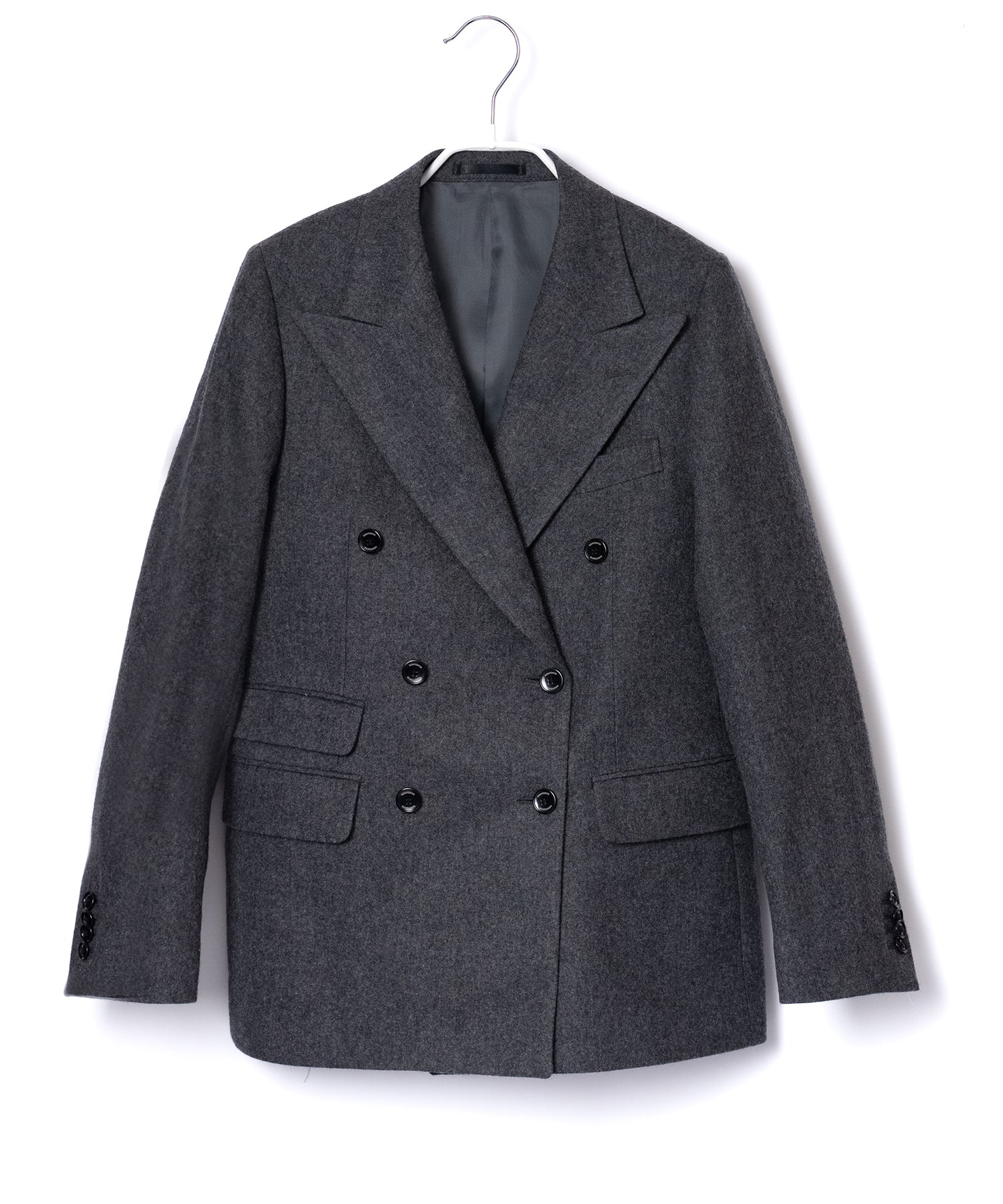 ウールのフランネル素材で作られたダブルのテーラードジャケット。