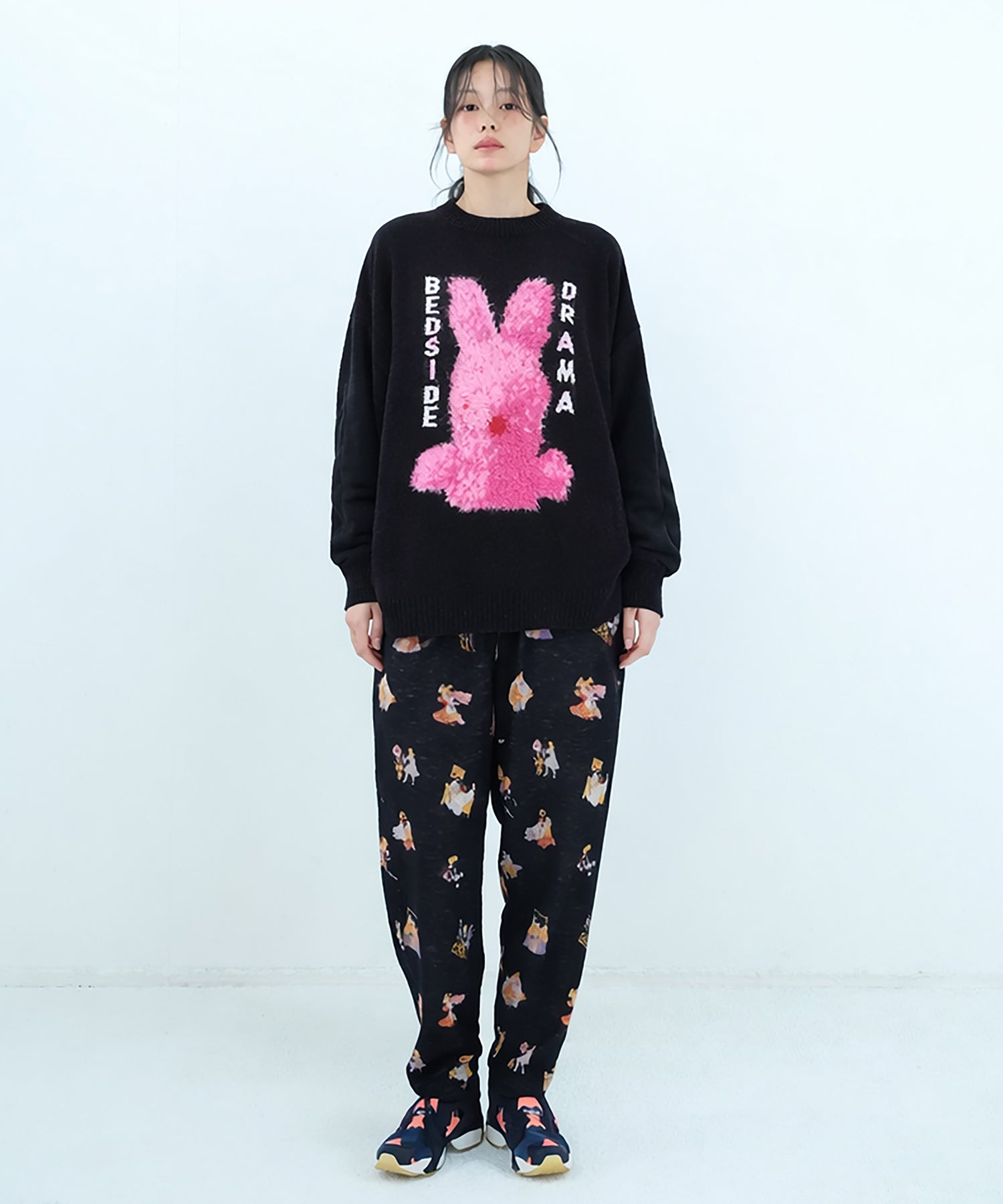 もっと起毛したぬいぐるみのような質感の鮮やかなピンクラビットが編み込まれたインパクトのあるニットセーター。