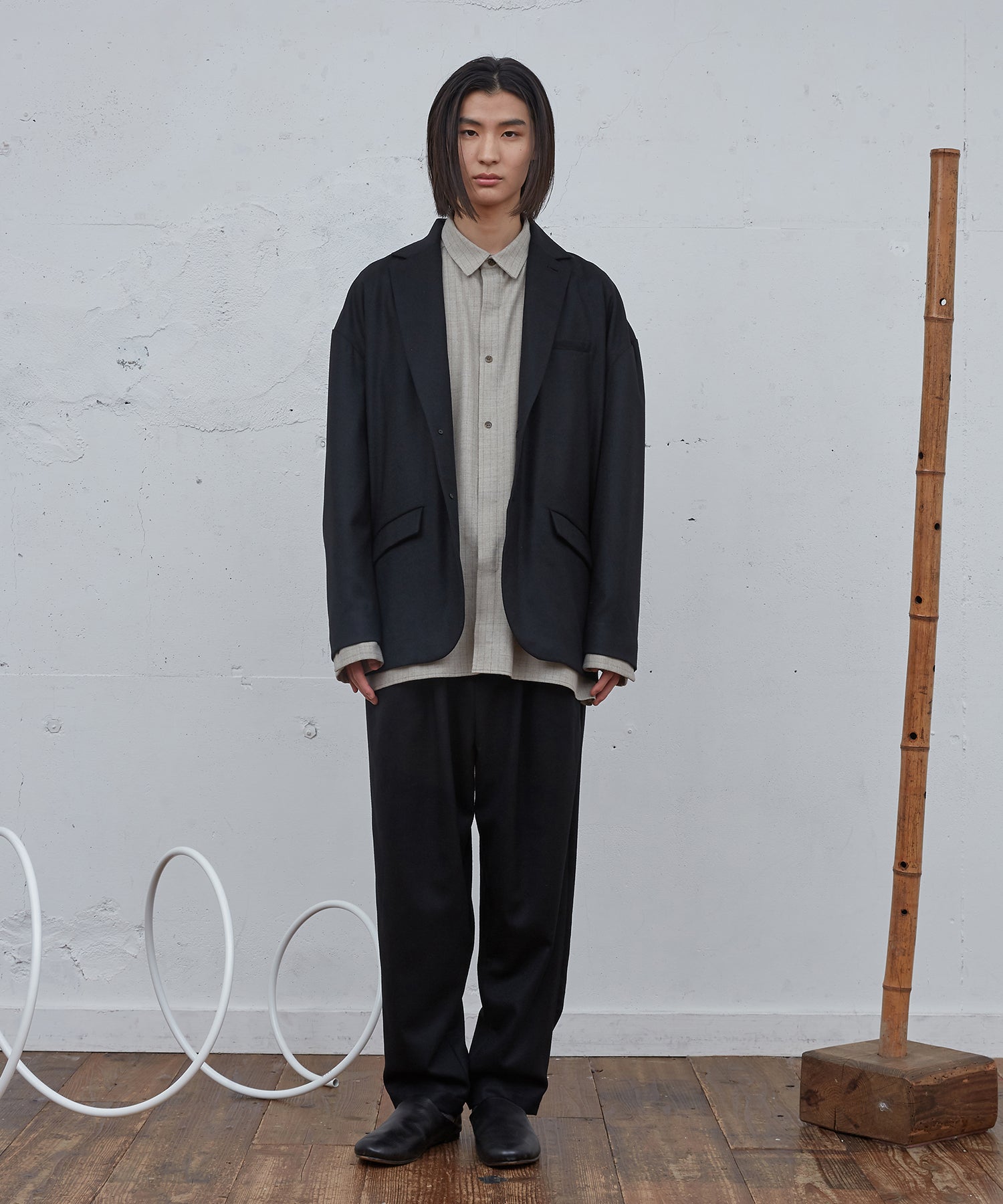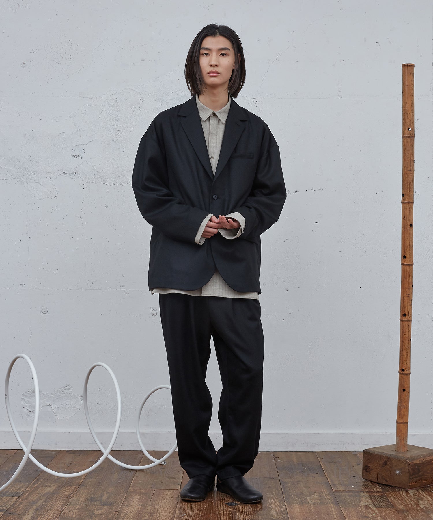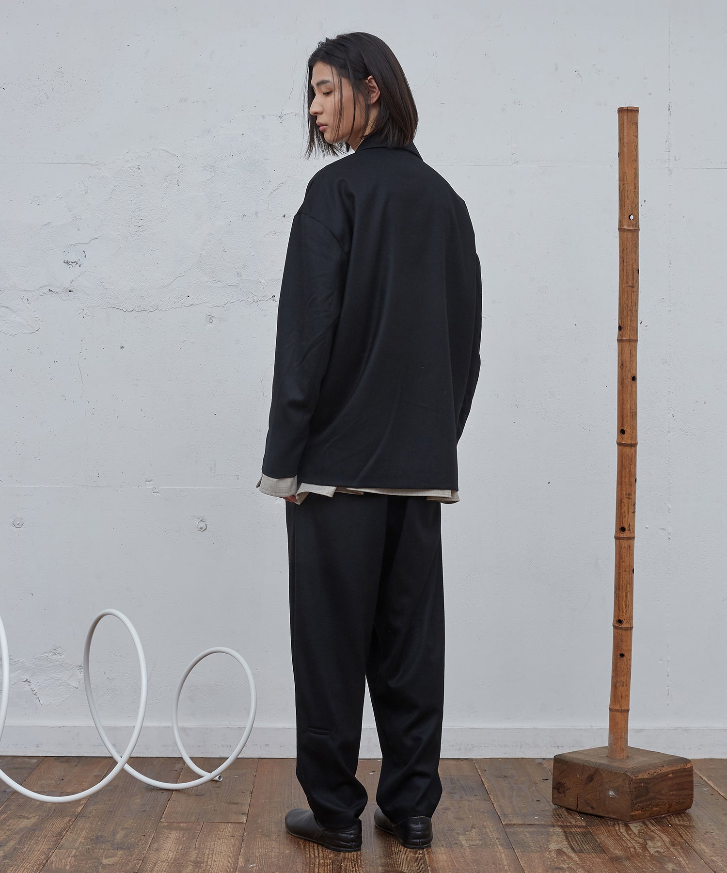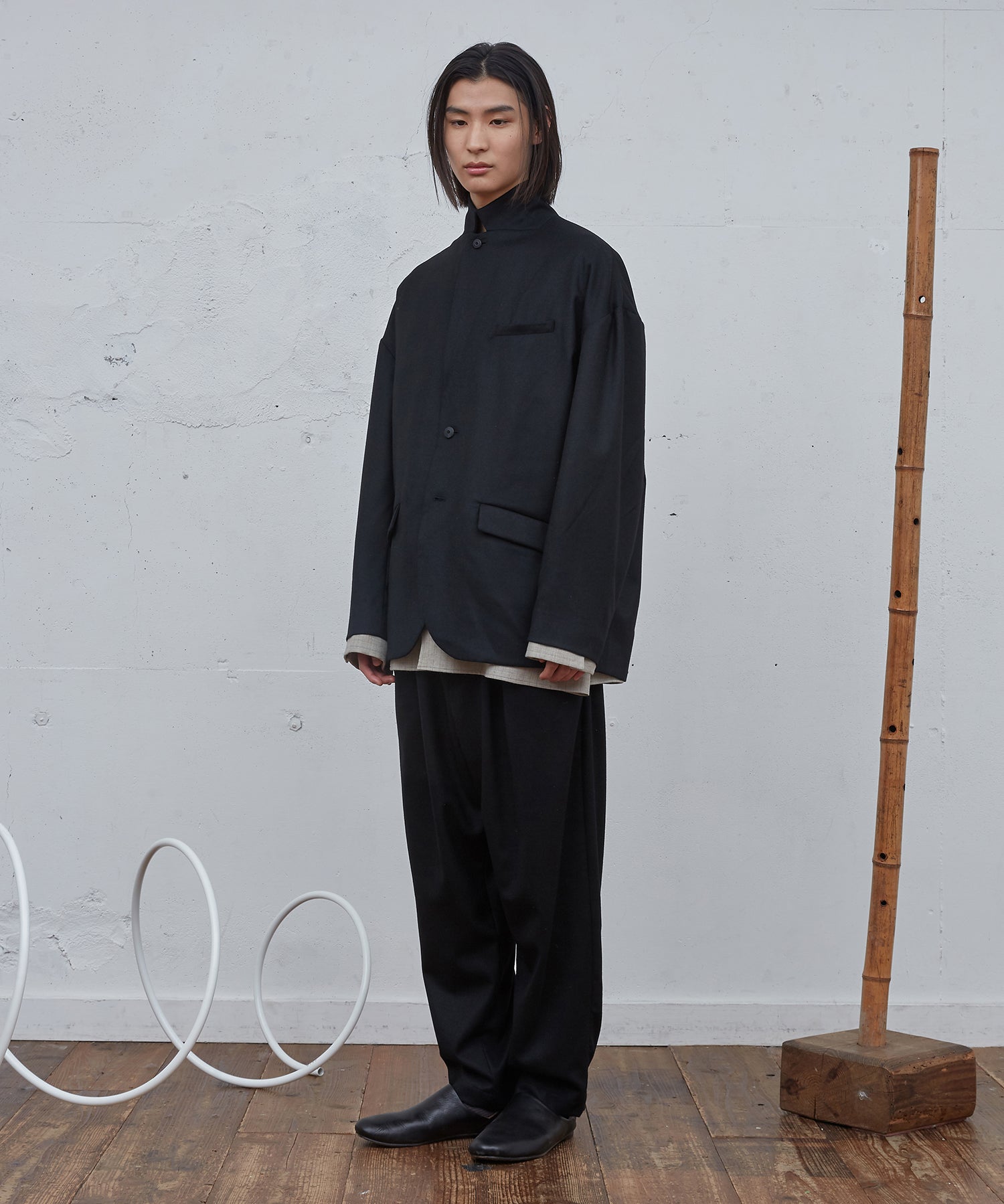 テーラードジャケットして、ハイネックのジャケットとして、2通りの着こなしを楽しめるジャケット。