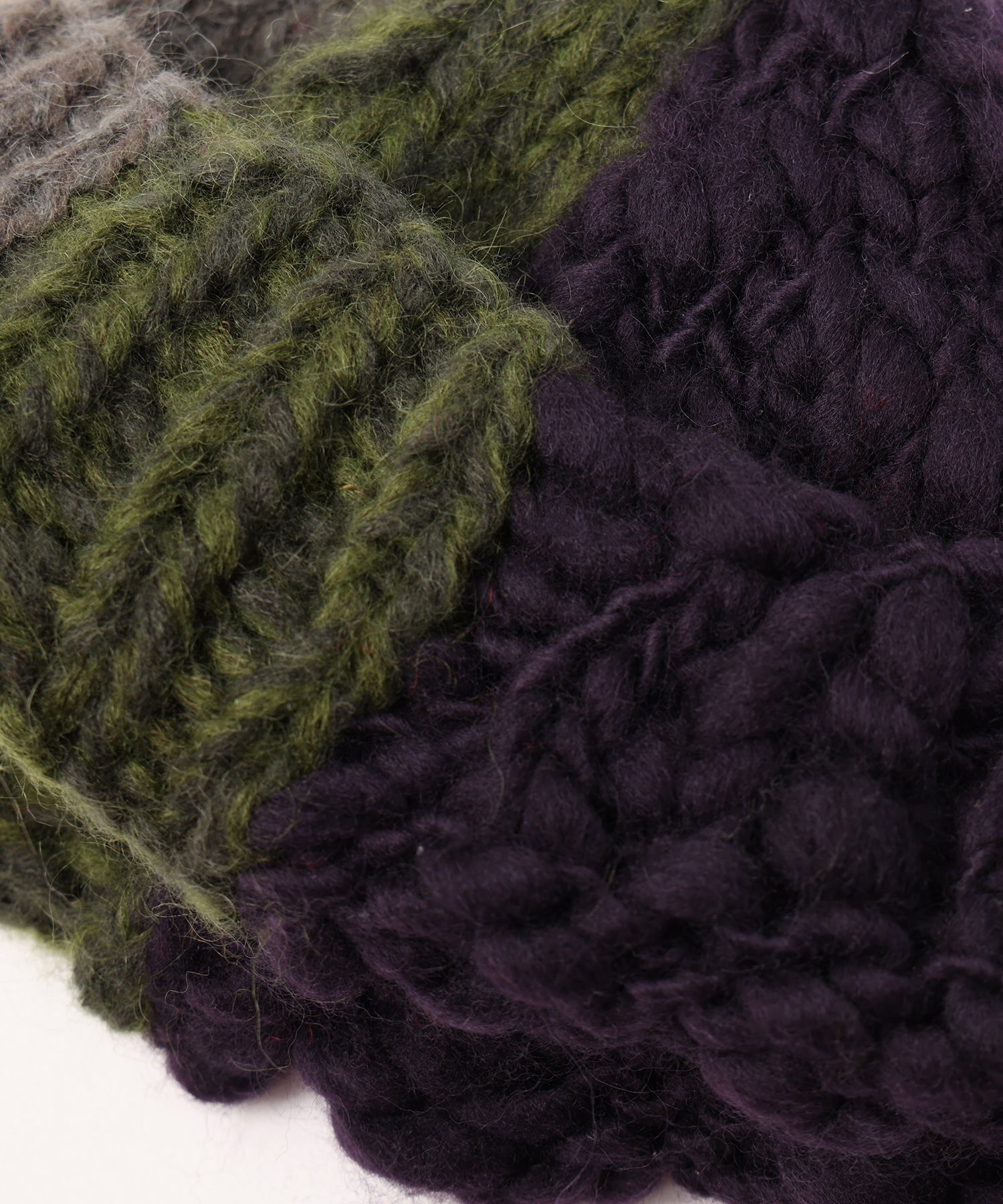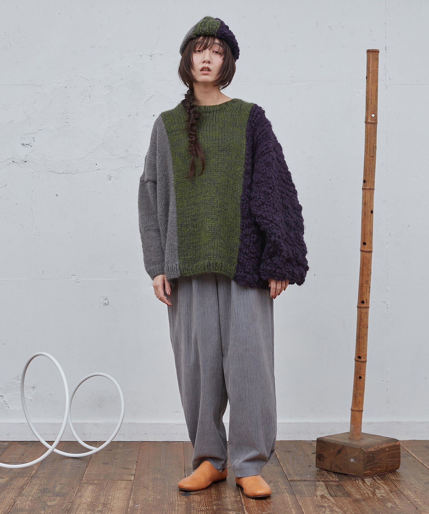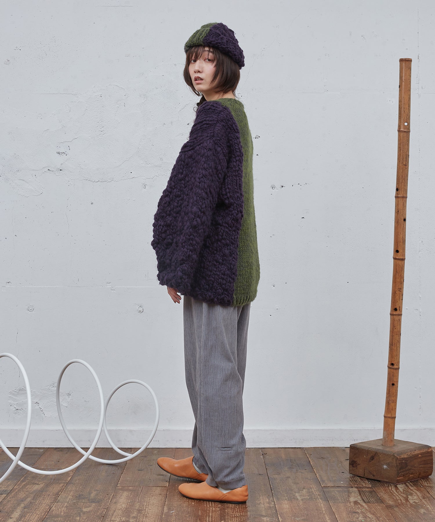 超極太のウールスラブから質感の異なるモヘアへと、糸の太さを段階的に変えて編み立てています。