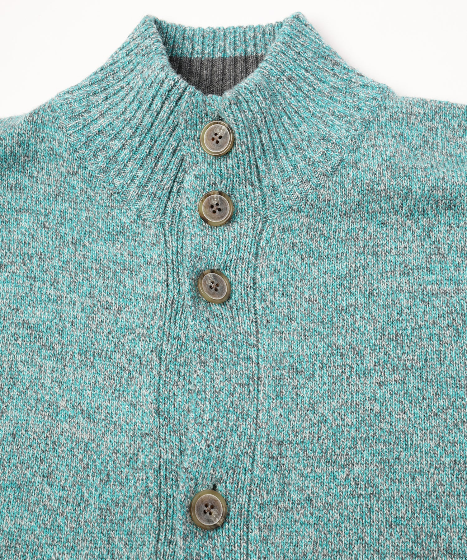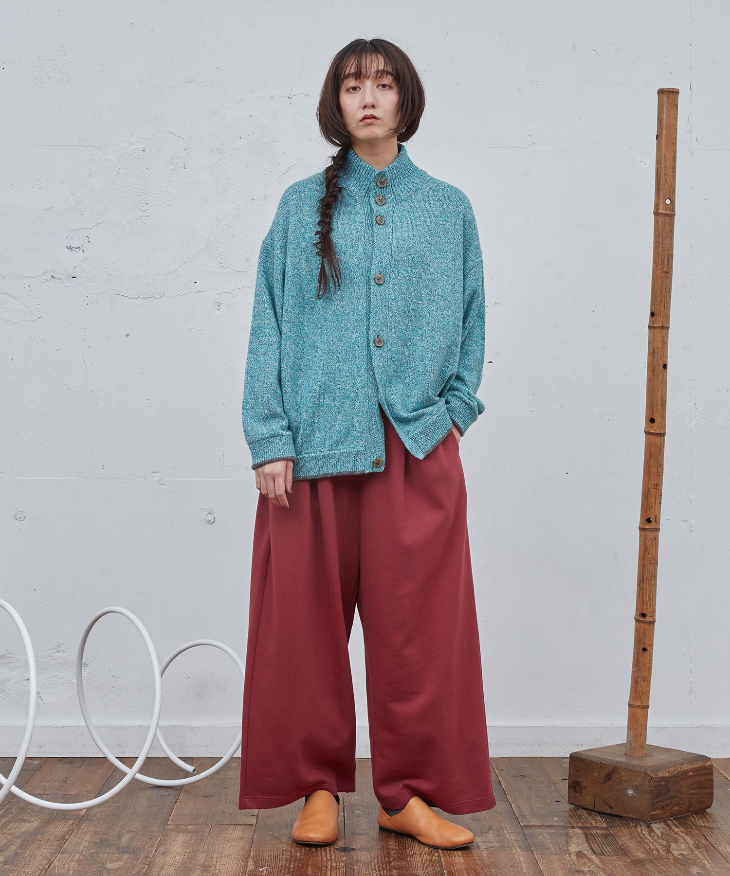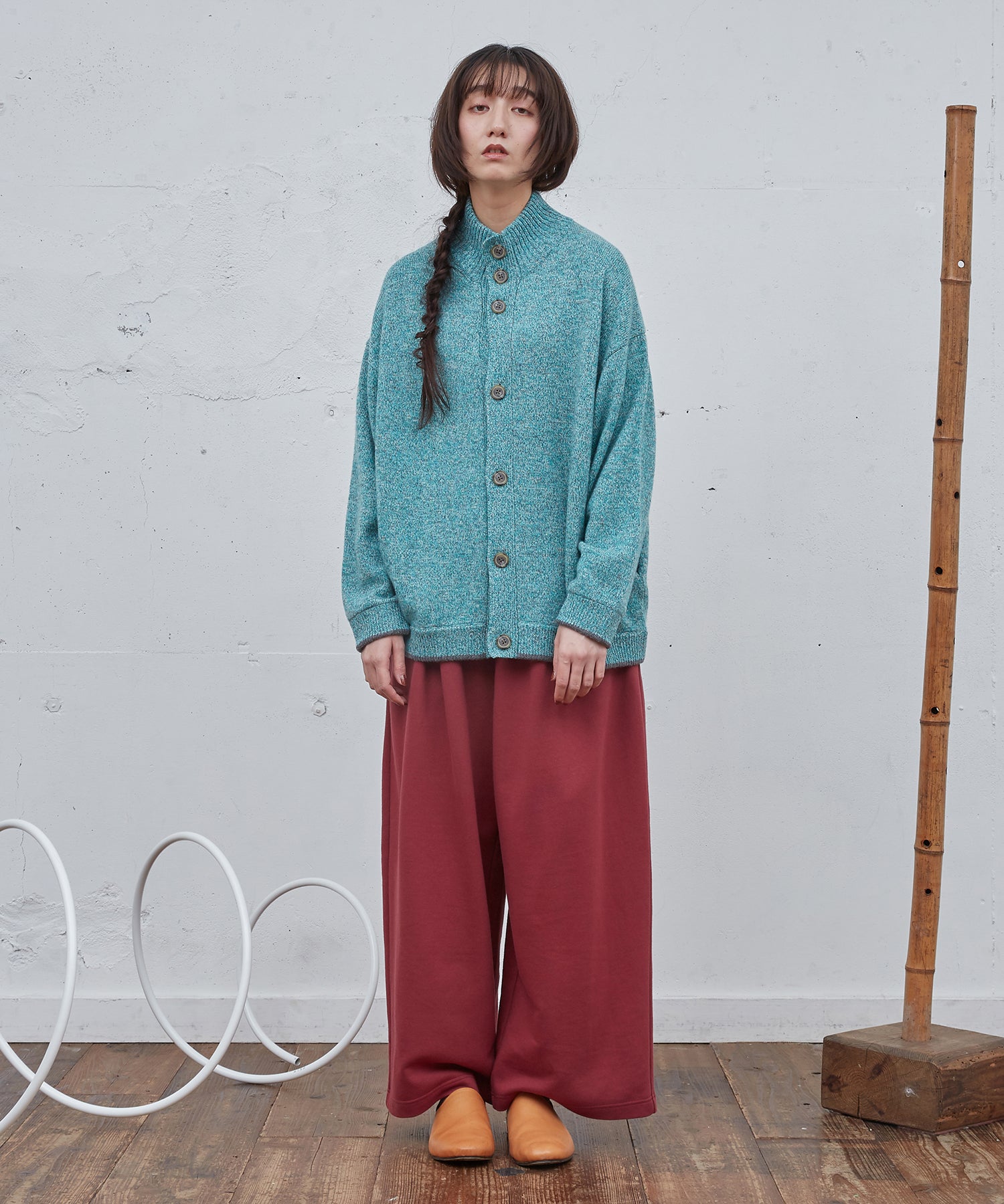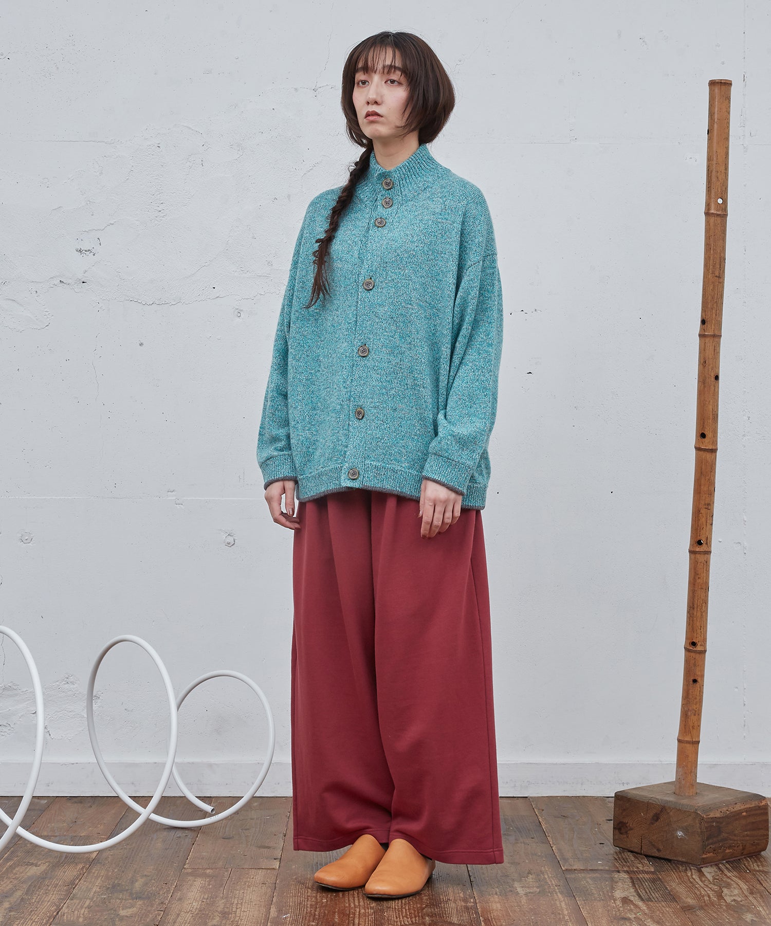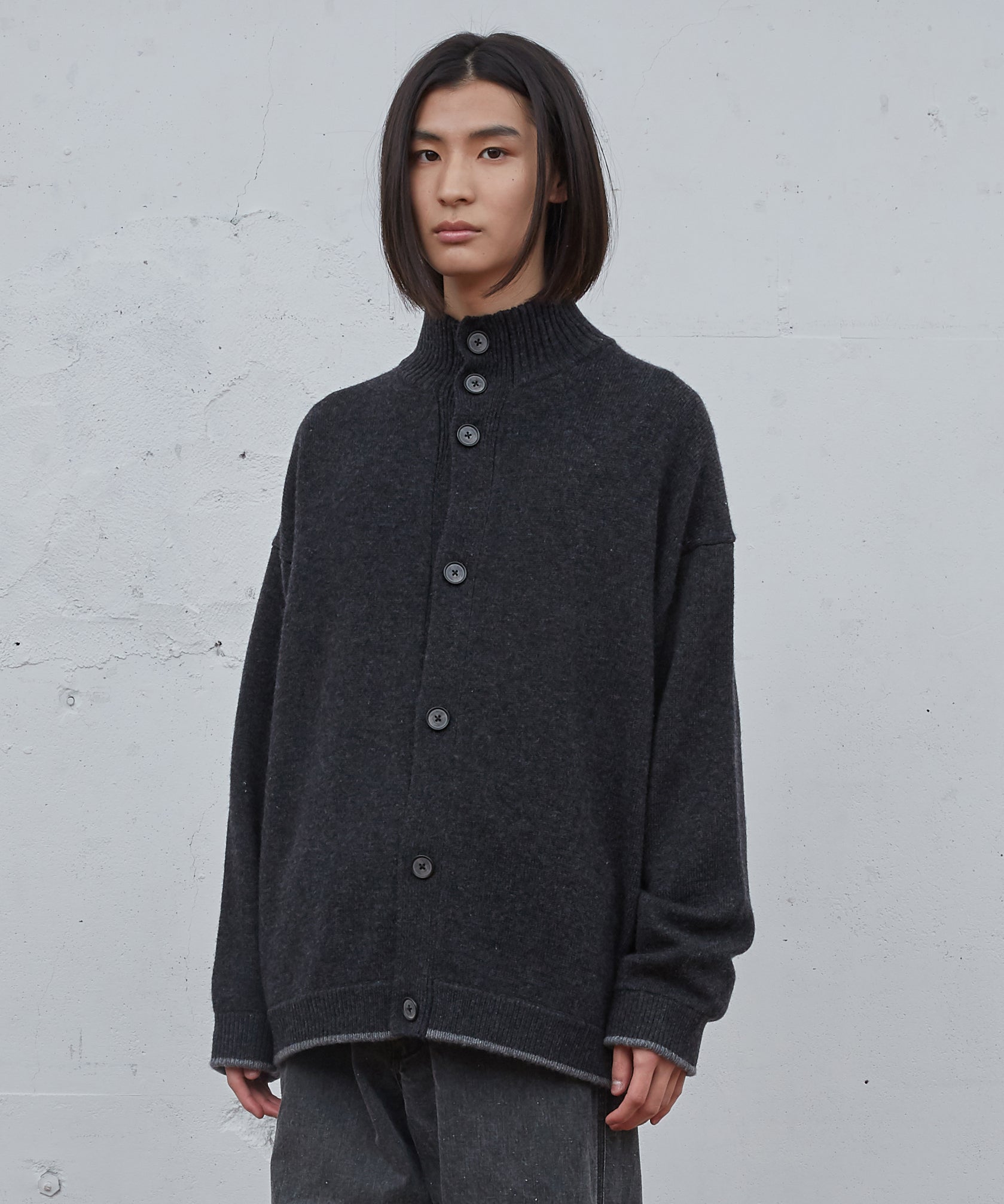 ゆったりとしたシルエットのカーディガン。ハイネック仕様。