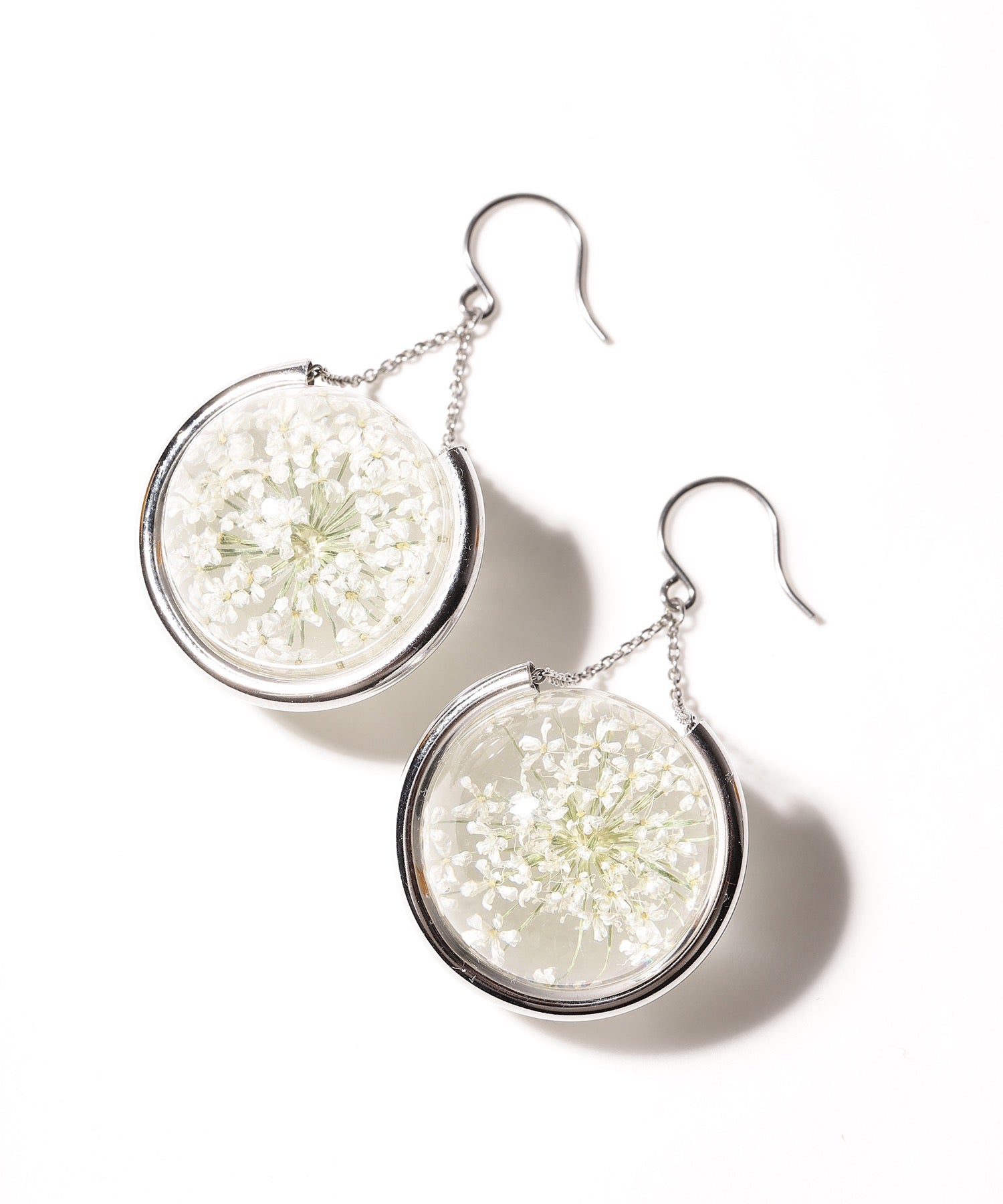 まあるい球体の中に、かすみ草、バラの花をひとつずつ閉じ込めたフック型ピアス。