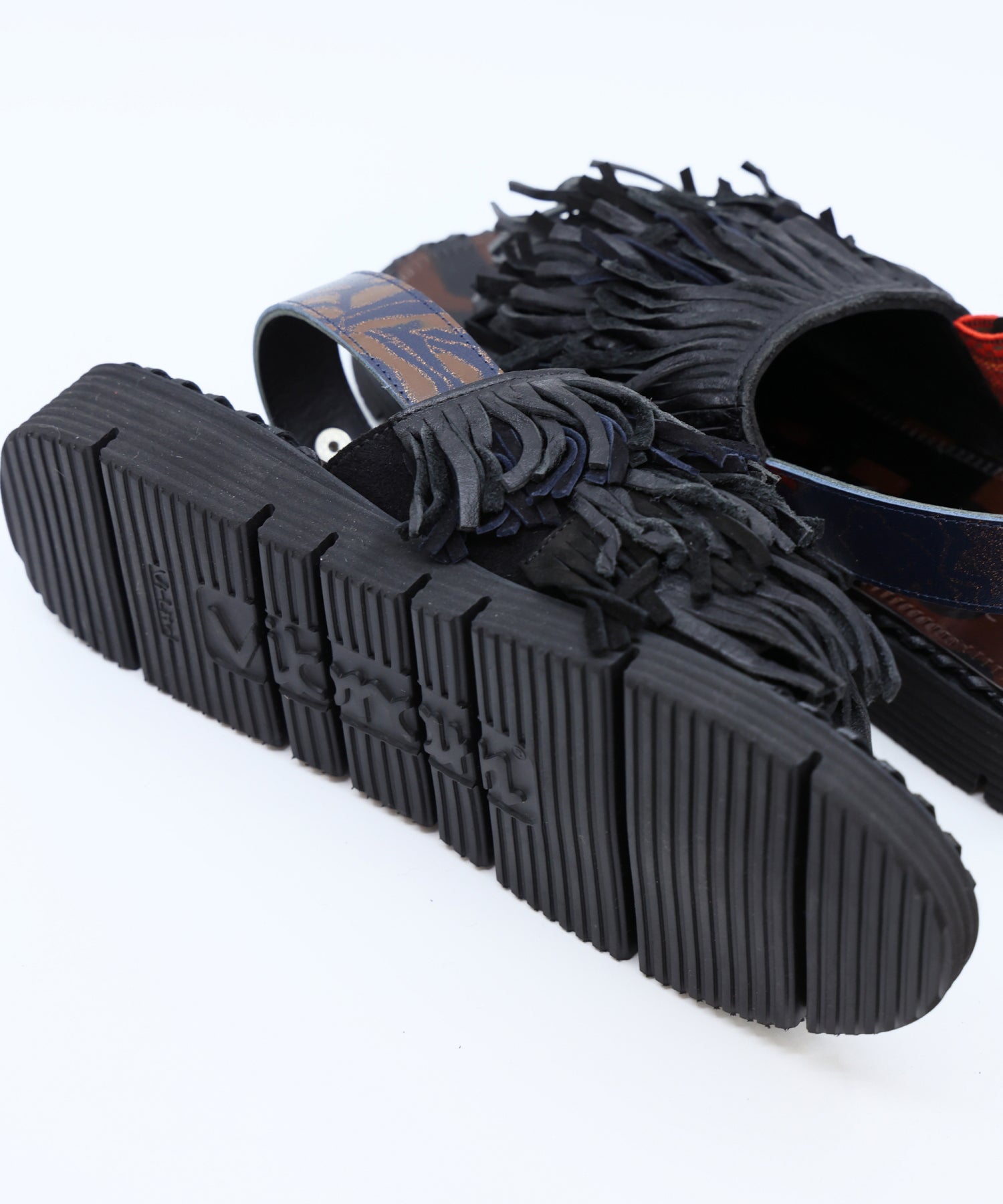 ベロア+牛革・ヌバックの手洗いフリンジ ベルト...アロハ柄のプリントレザー・牛革、裏:豚革、中底:イタリア製ベンズ+JUCO.ハンドペイント *本来はソールとして使われるキメ細やかな強度が高い部位