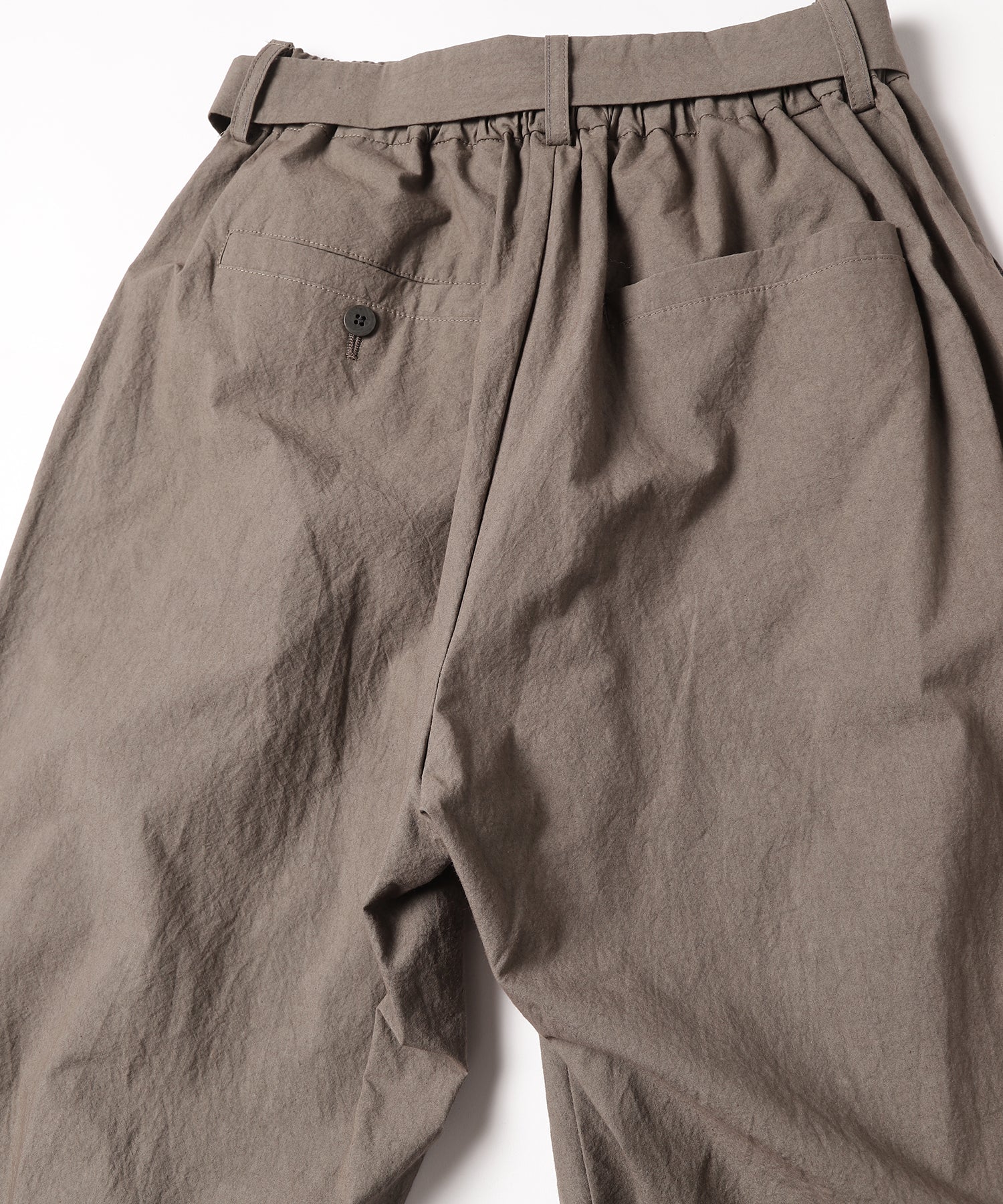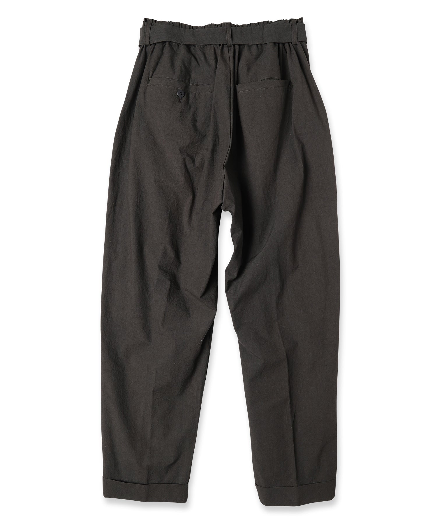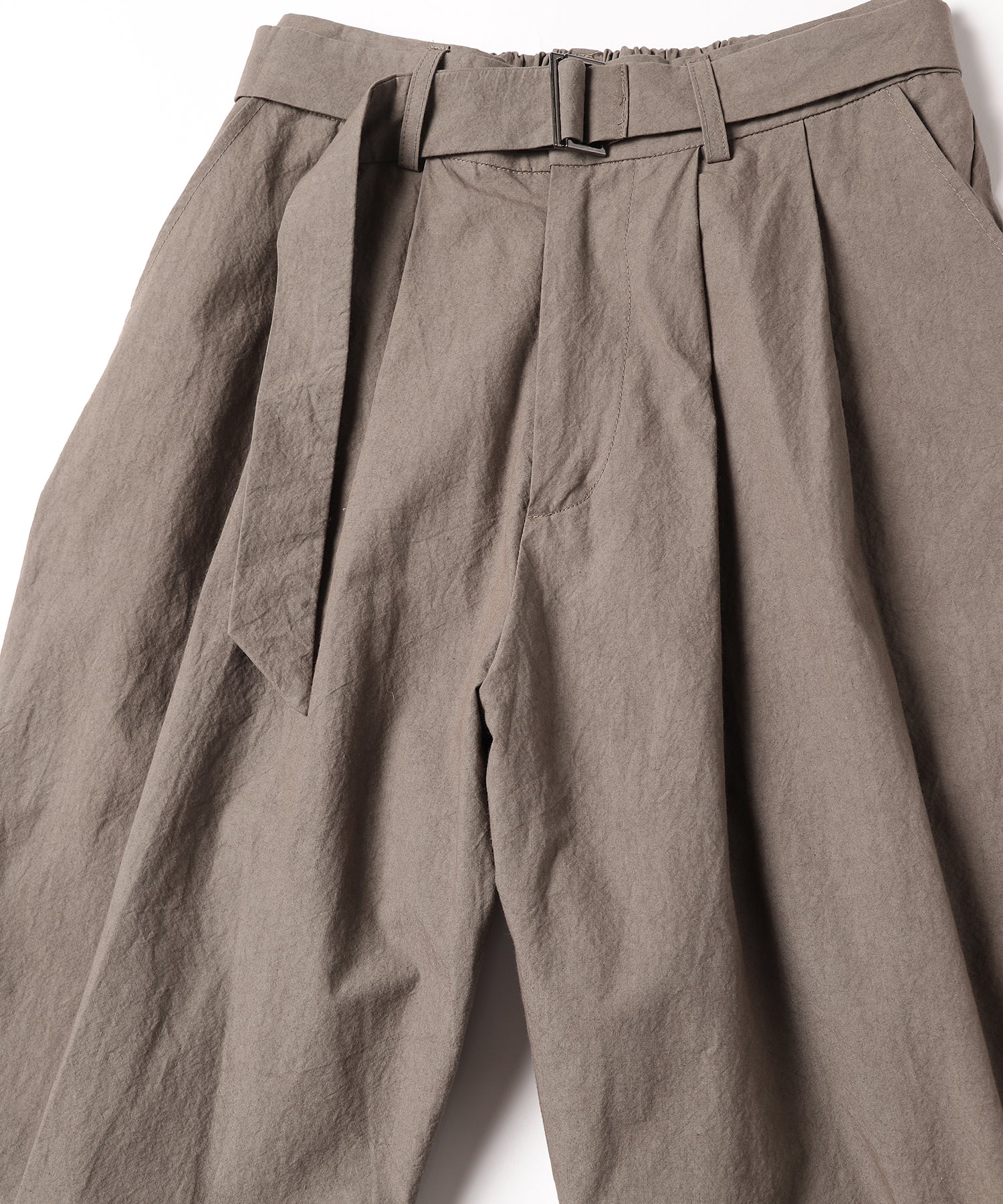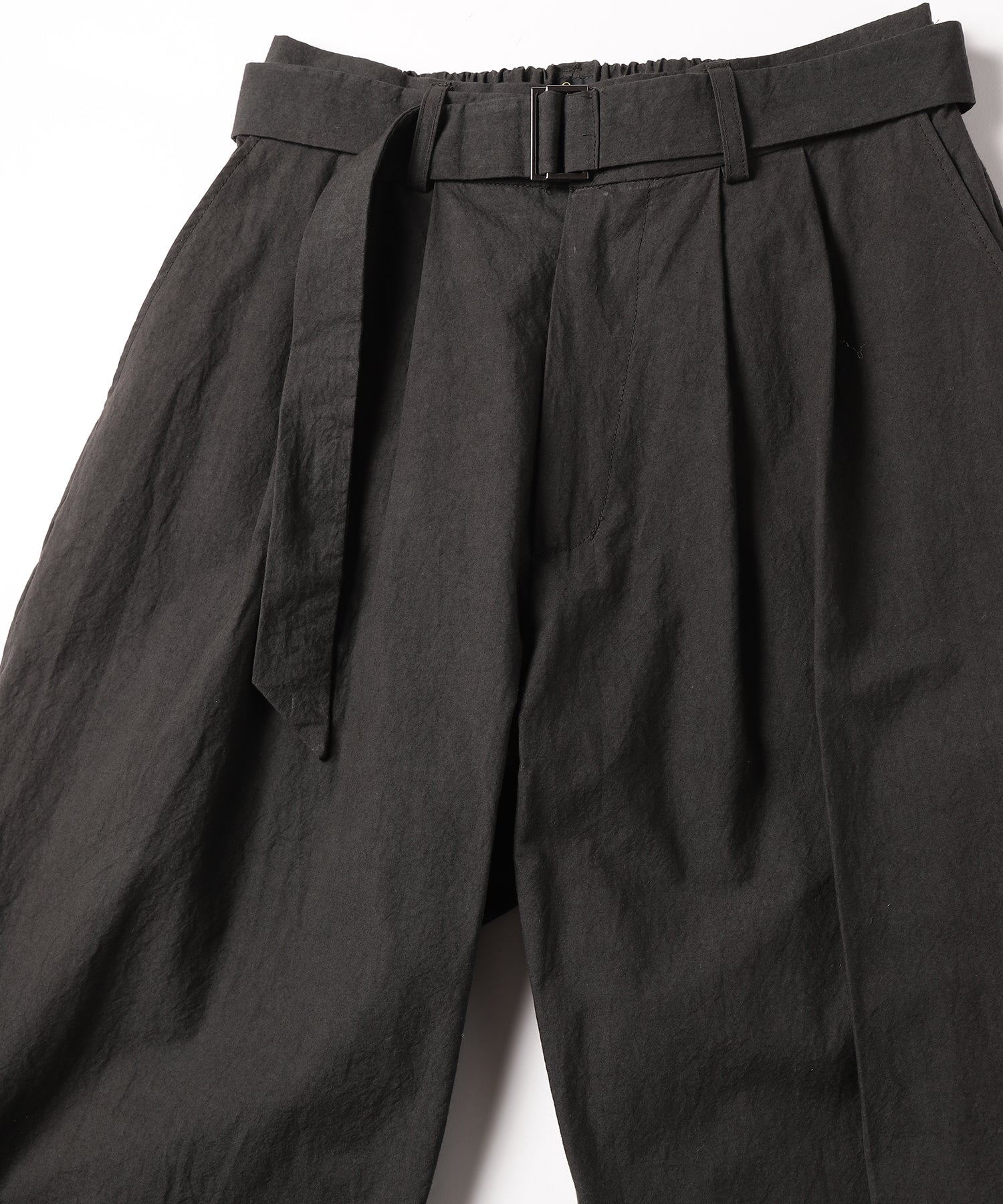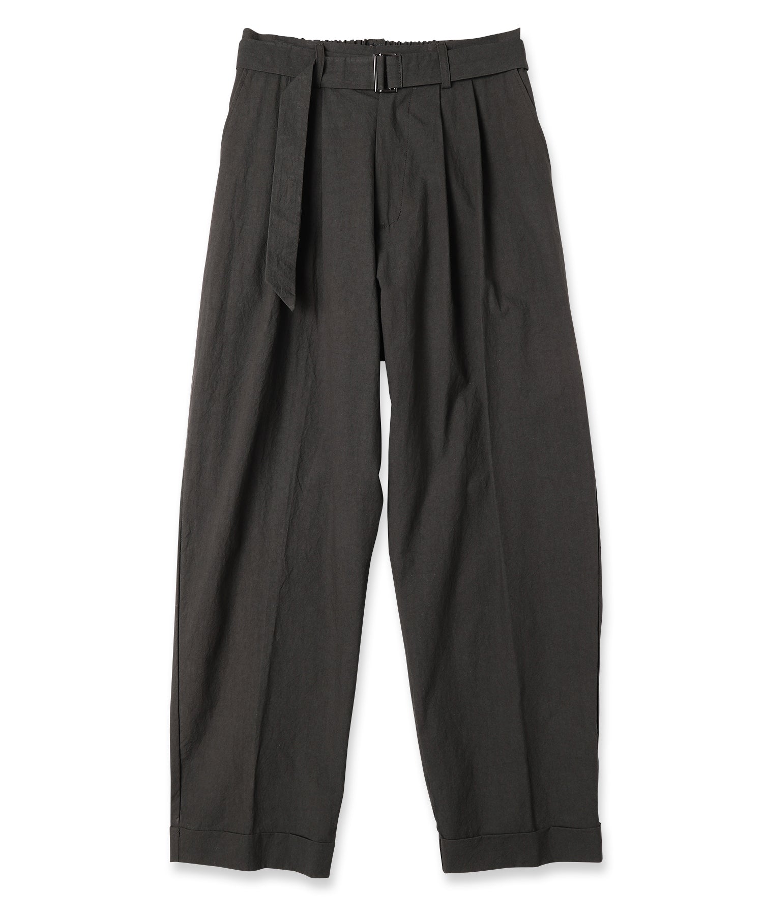 2タックセンタークリースダブル仕立てと、紳士服仕立ての要素に共生地ベルトを合わせたオーバーサイズシルエットのスラックス。