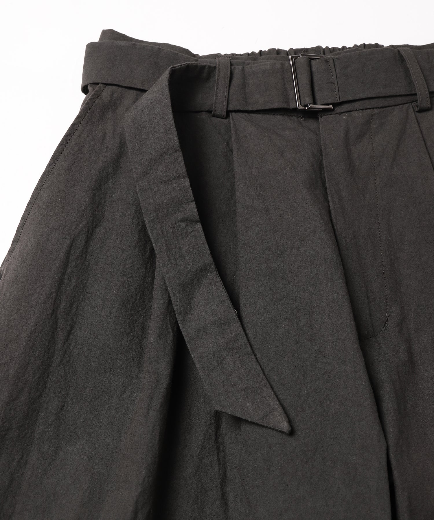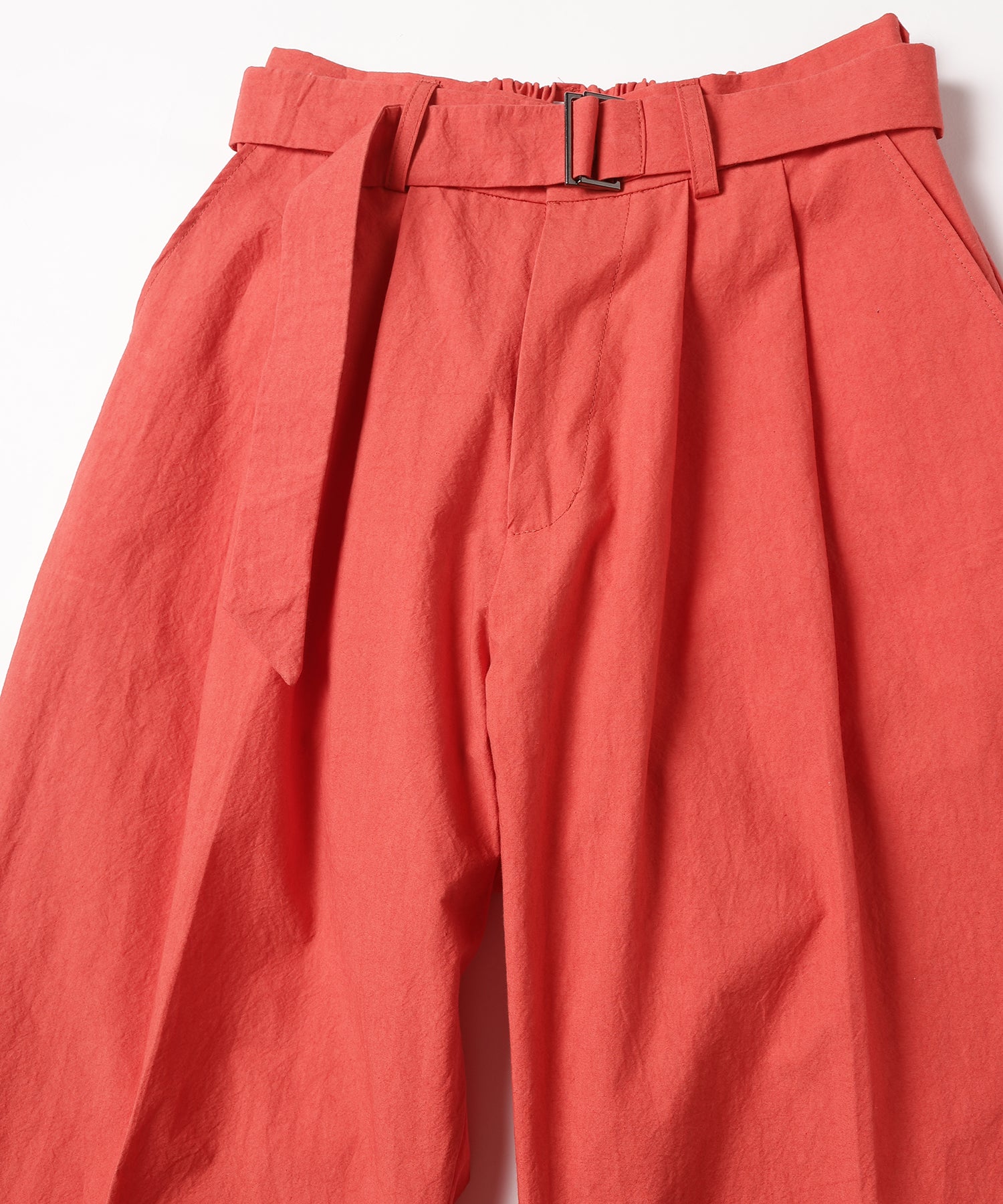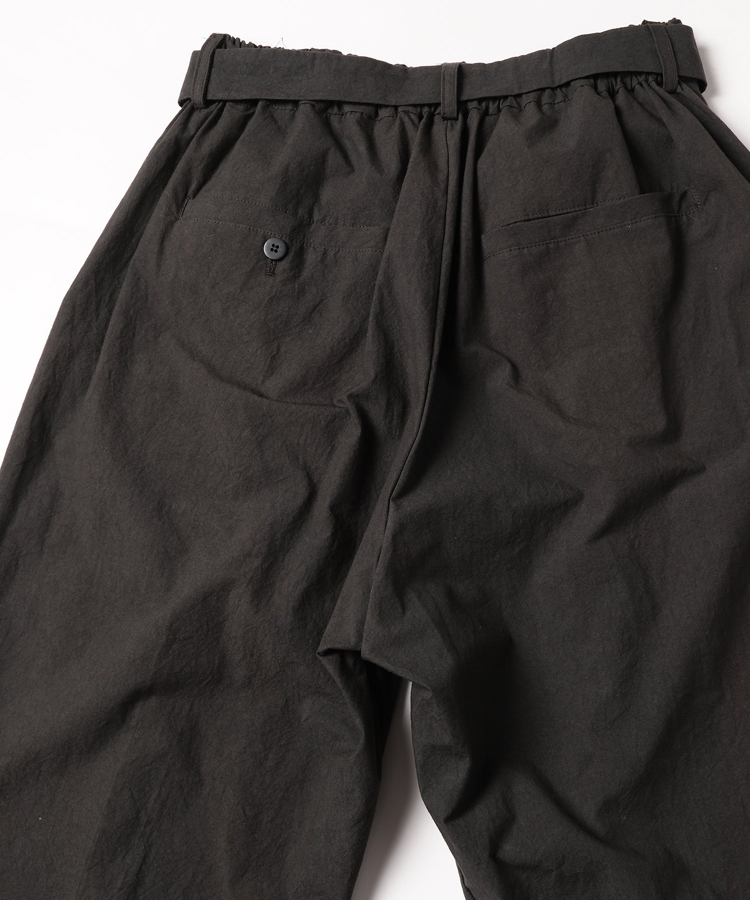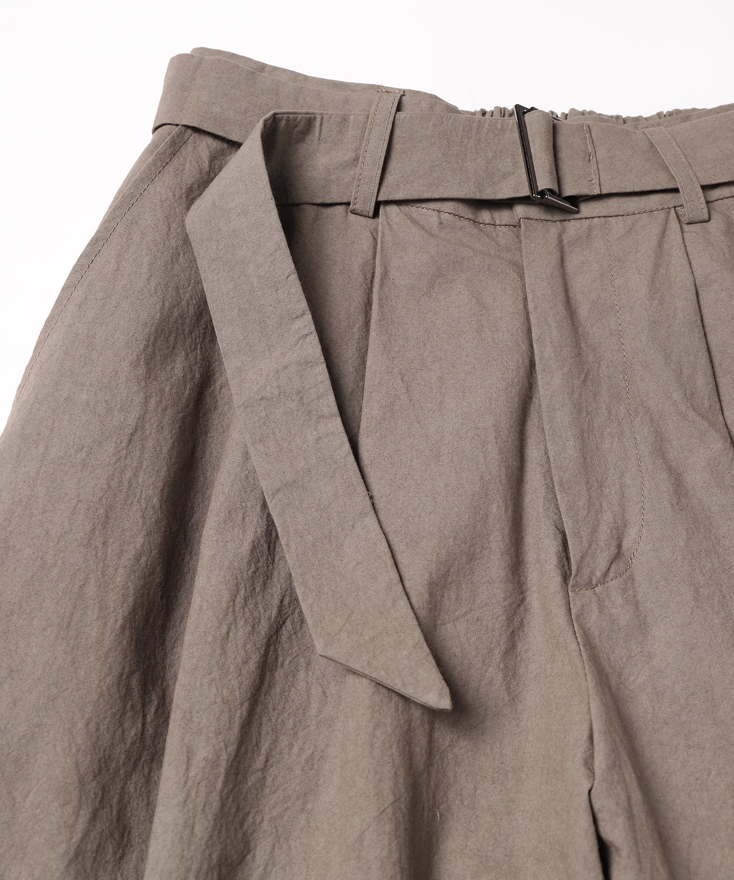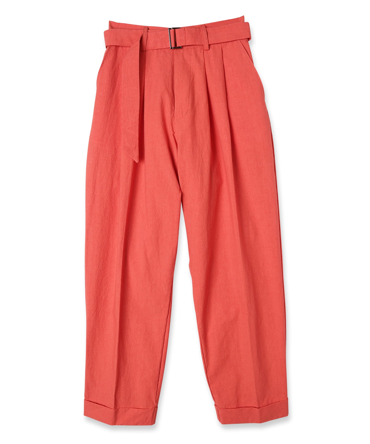 2タックセンタークリースダブル仕立てと、紳士服仕立ての要素に共生地ベルトを合わせたオーバーサイズシルエットのスラックス。