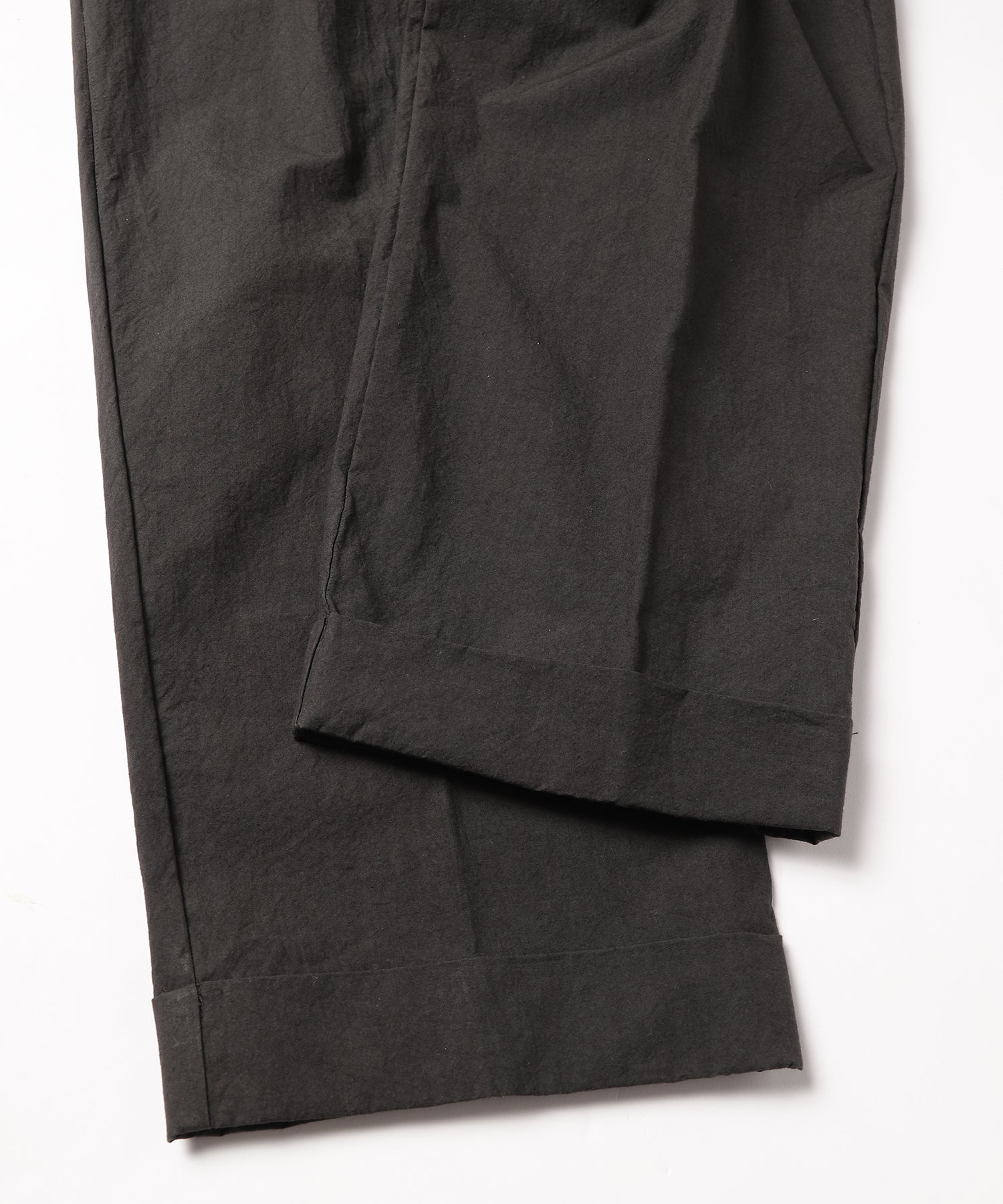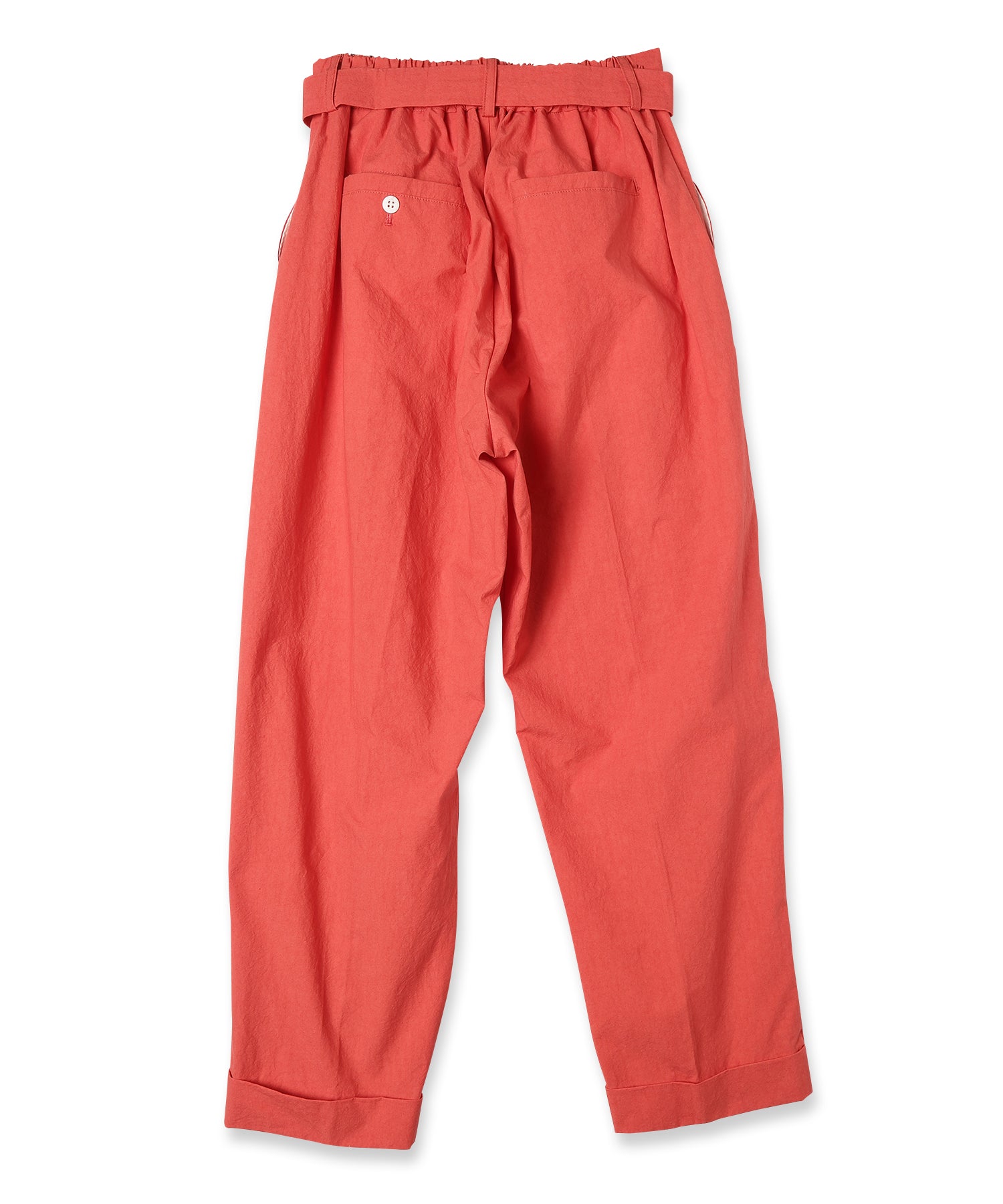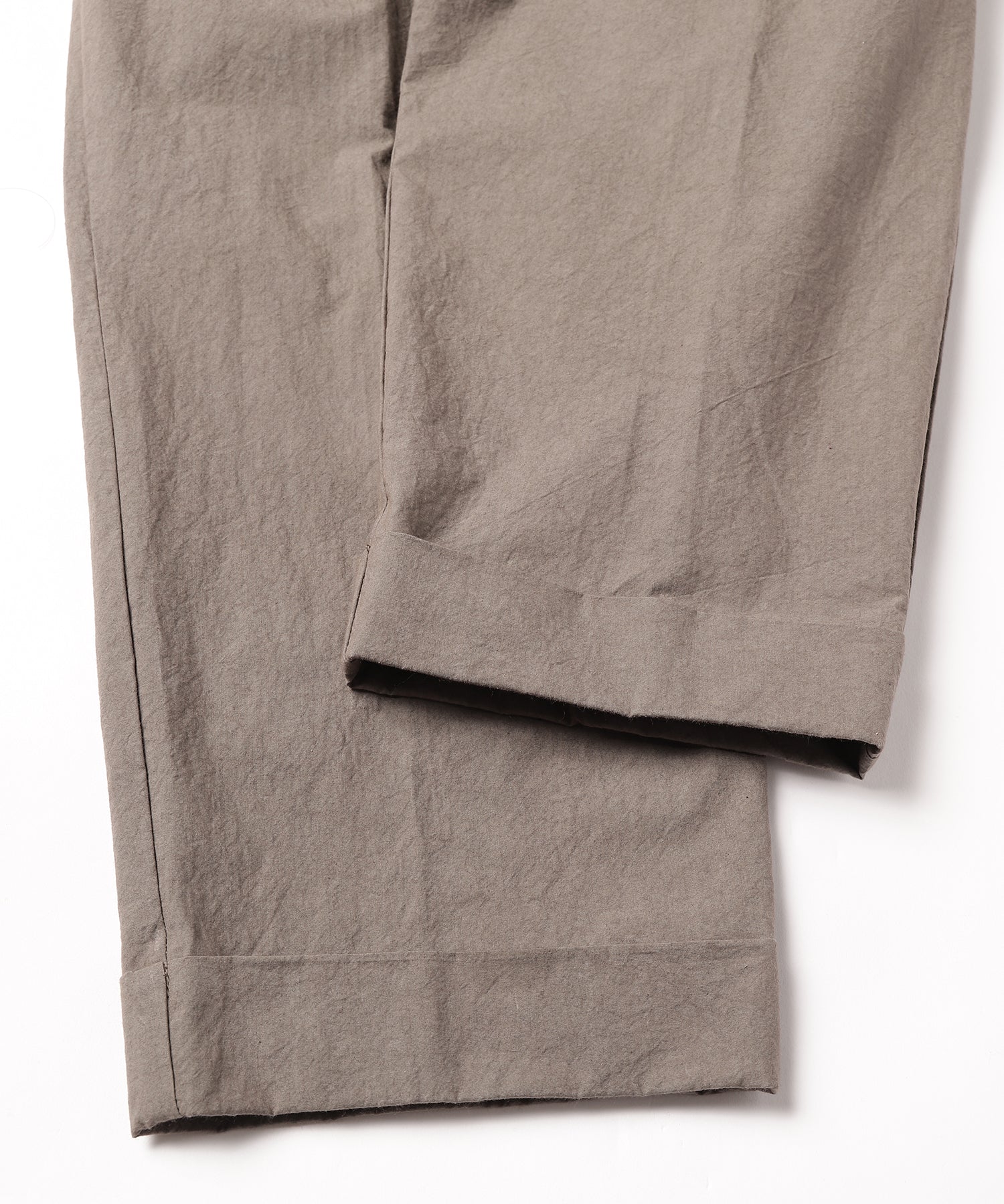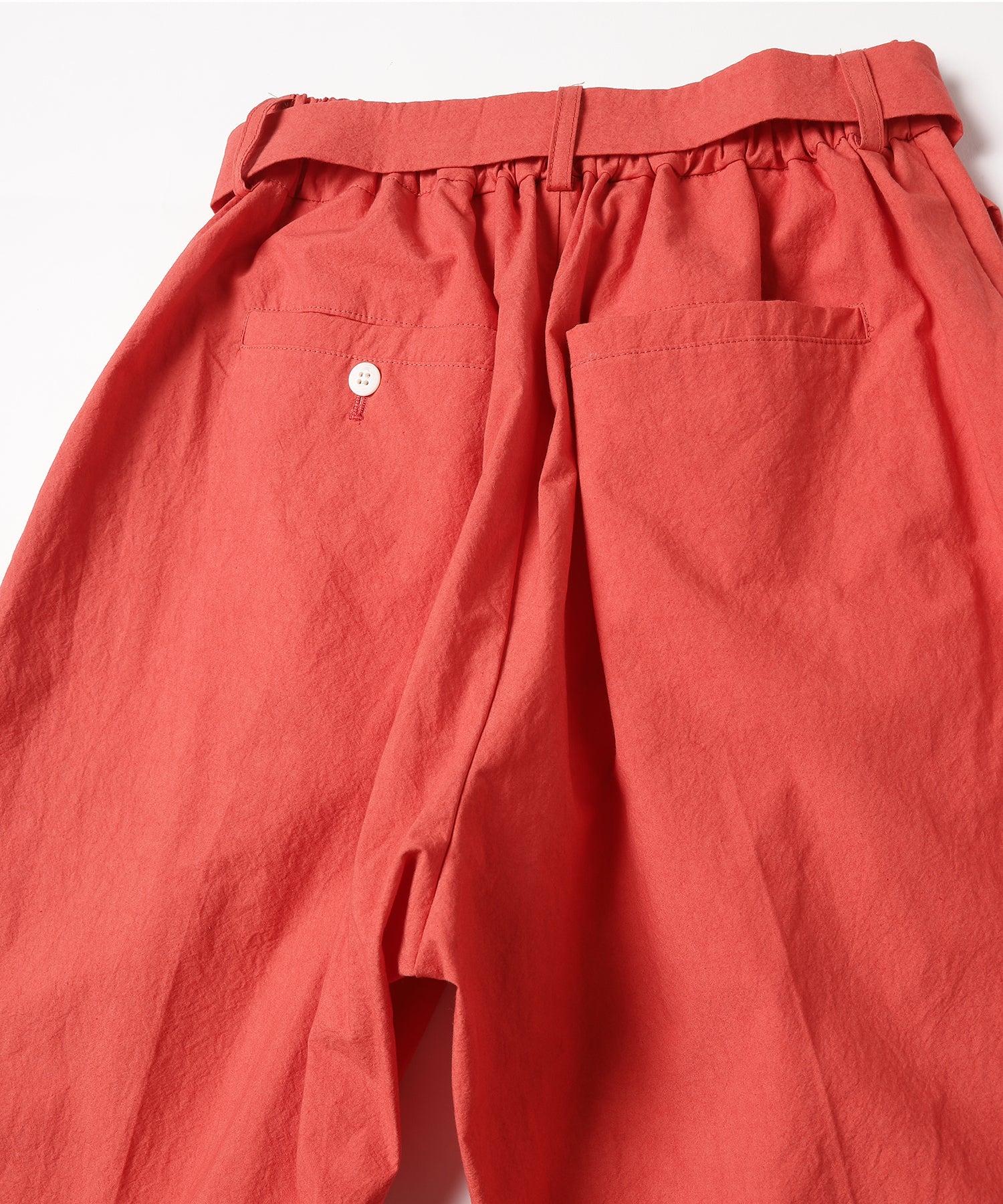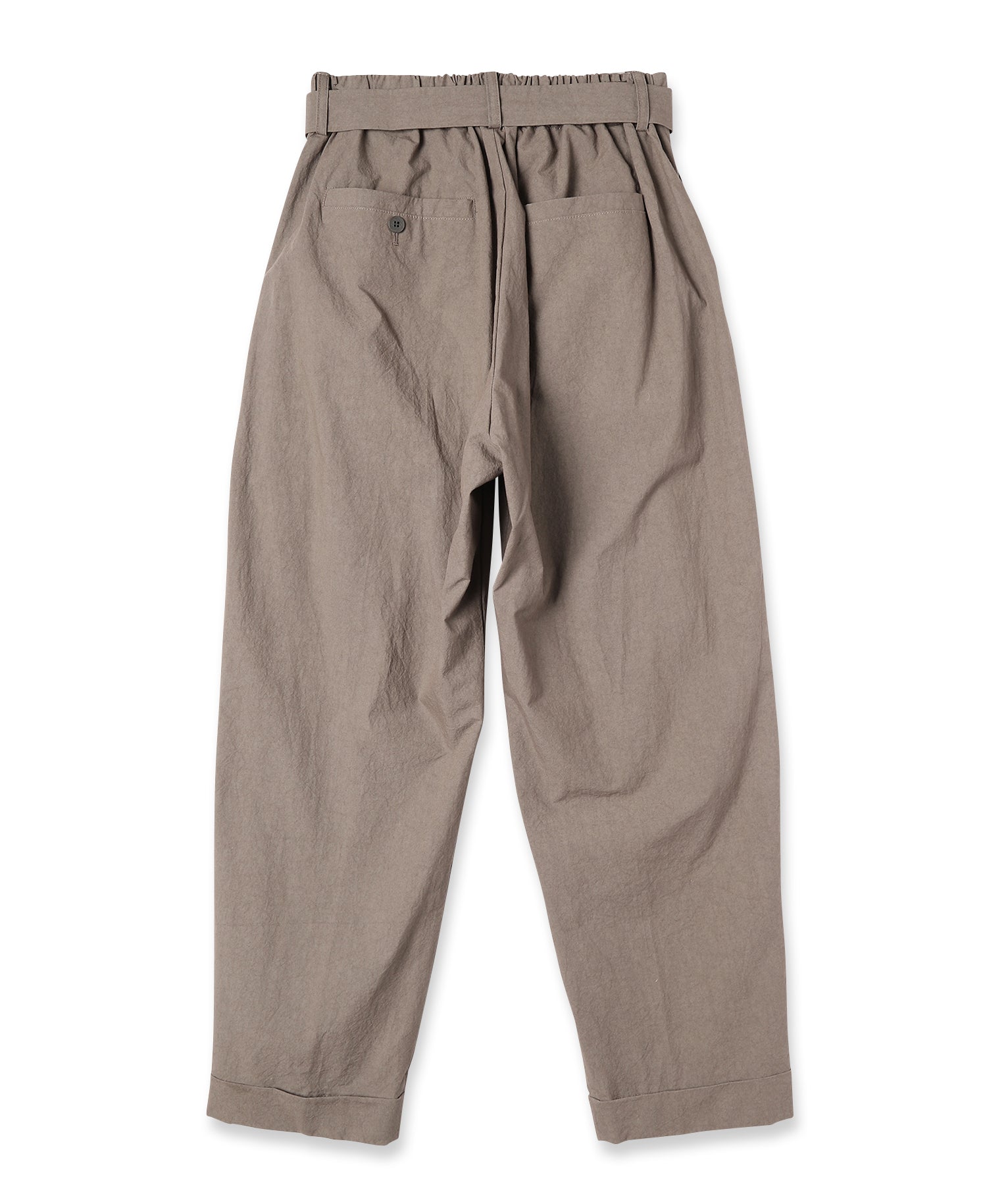 2タックセンタークリースダブル仕立てと、紳士服仕立ての要素に共生地ベルトを合わせたオーバーサイズシルエットのスラックス。
