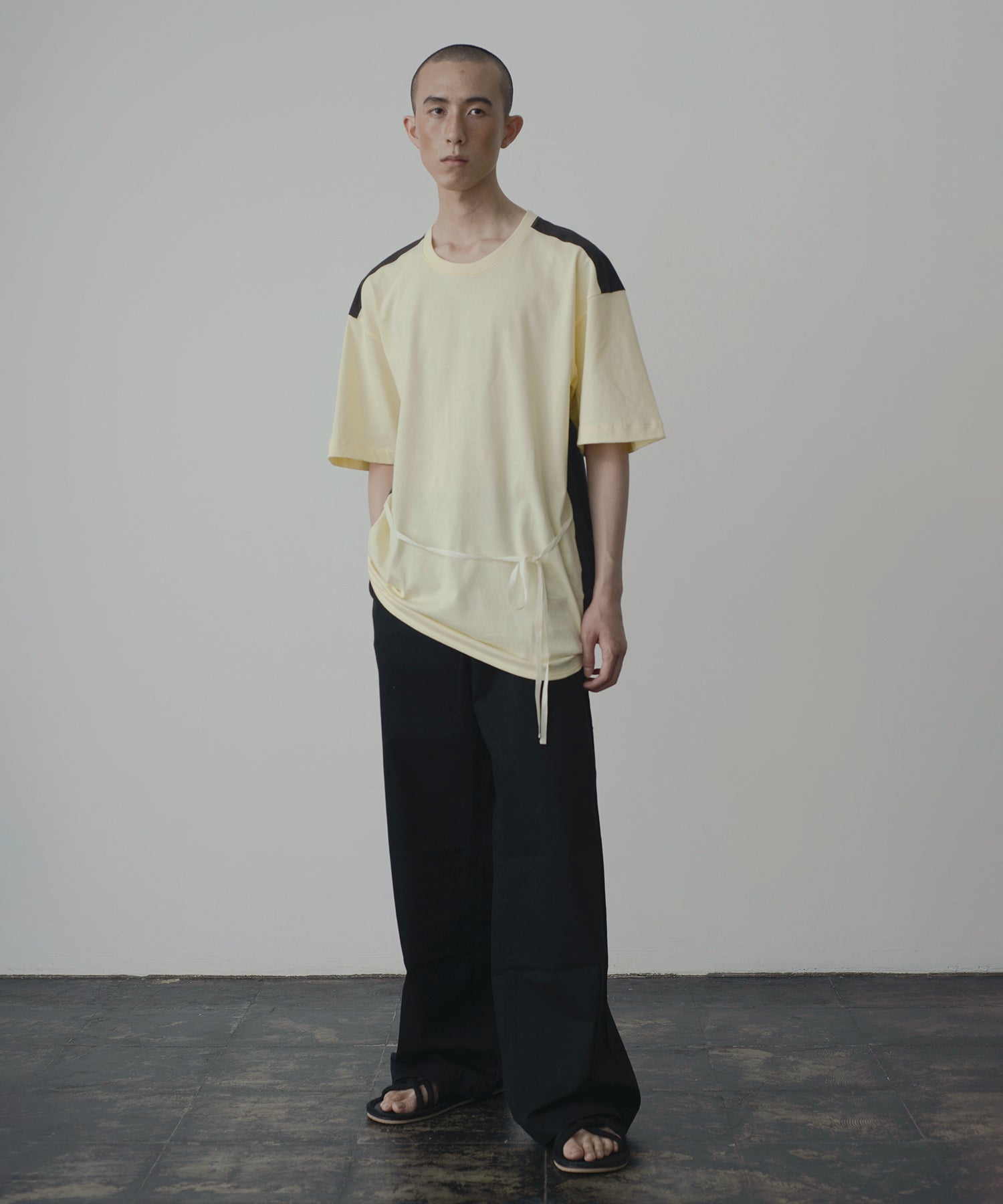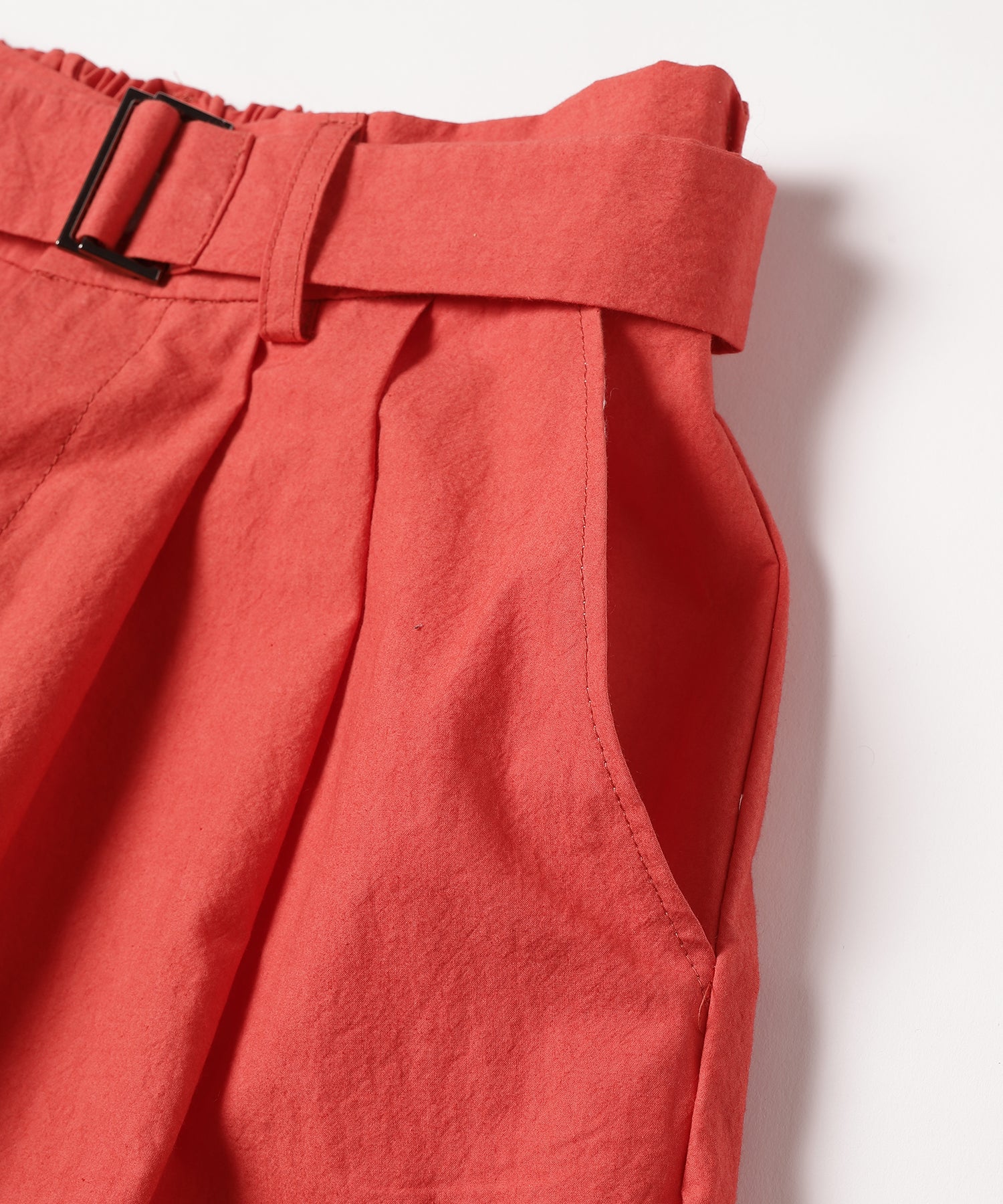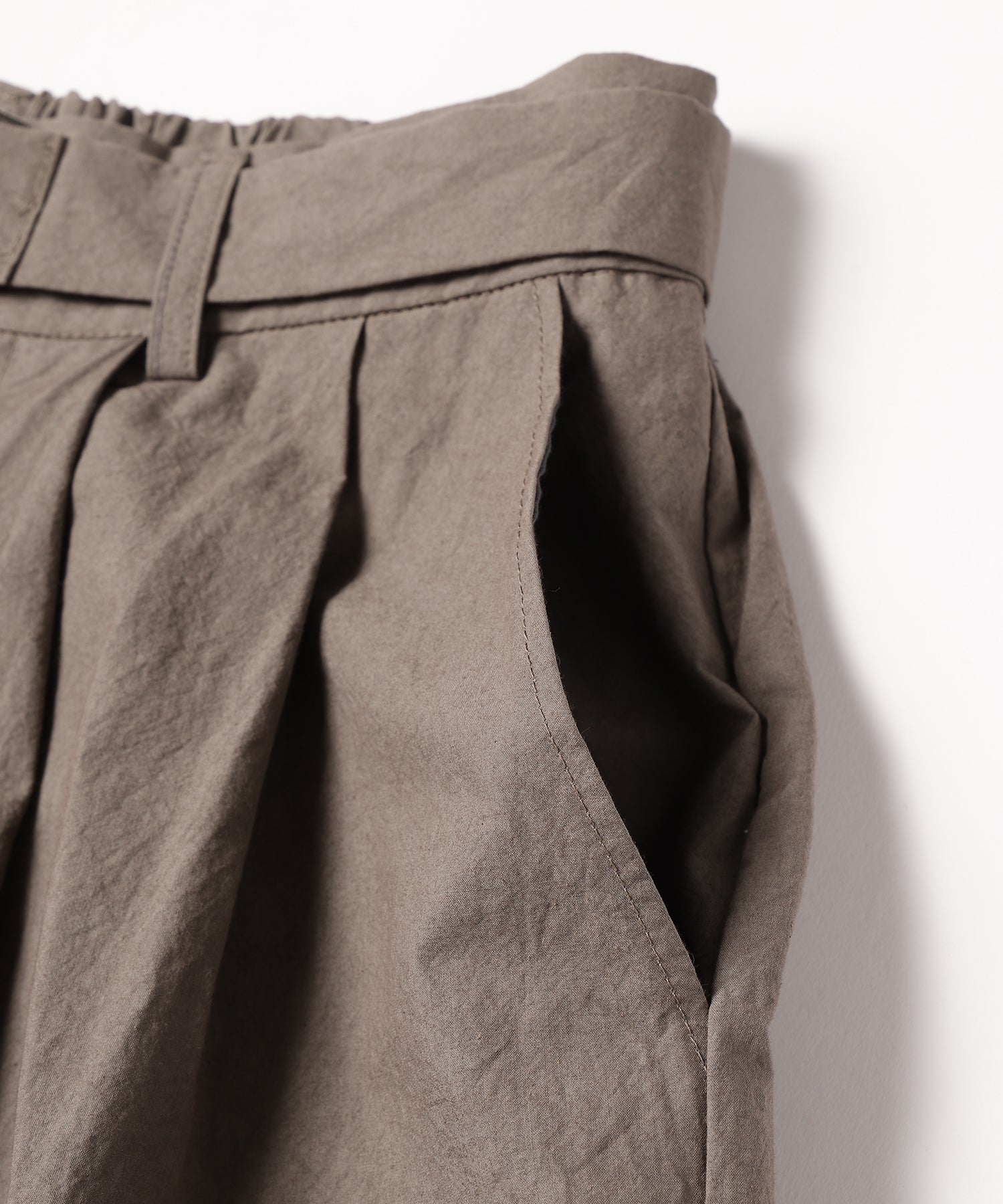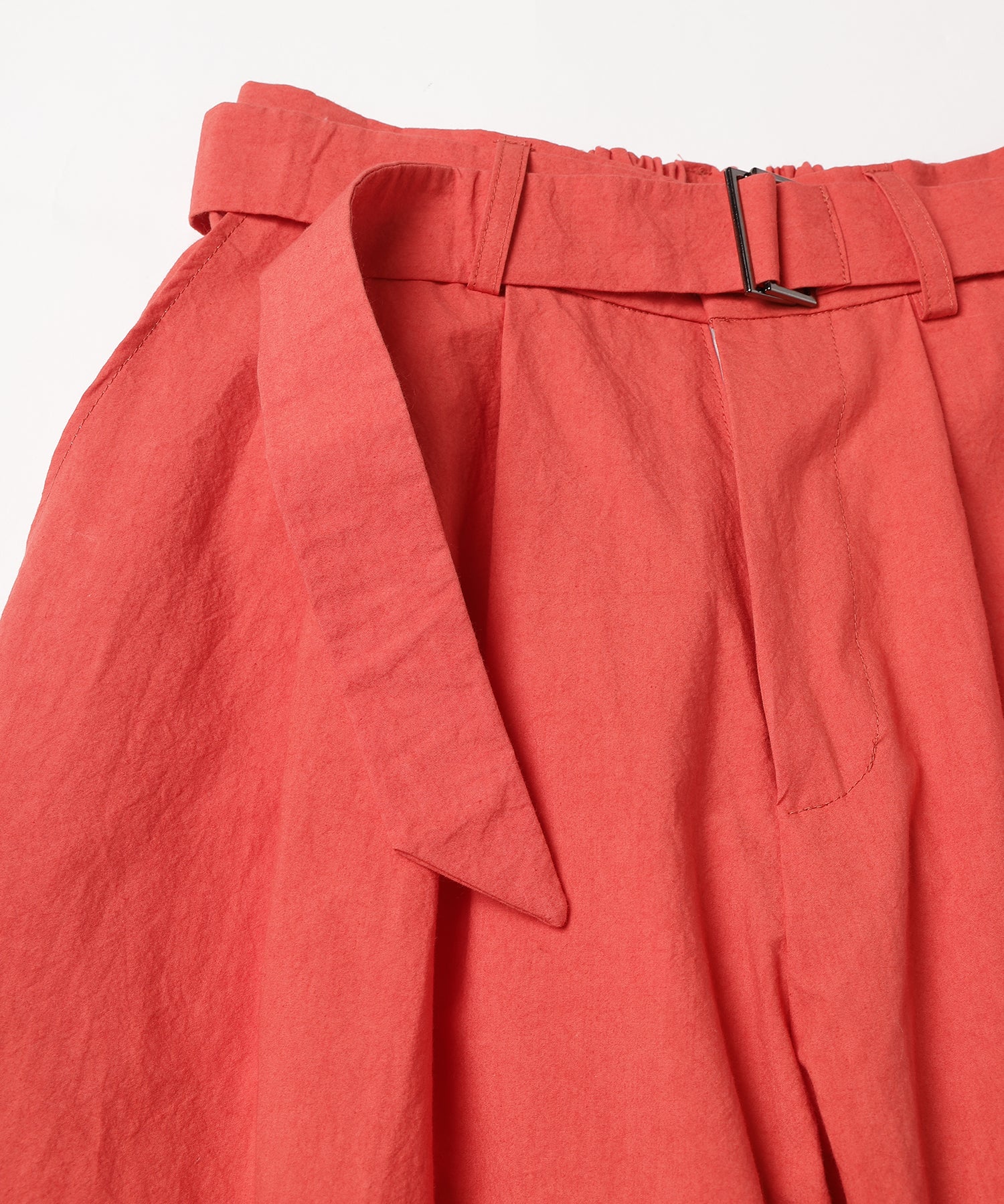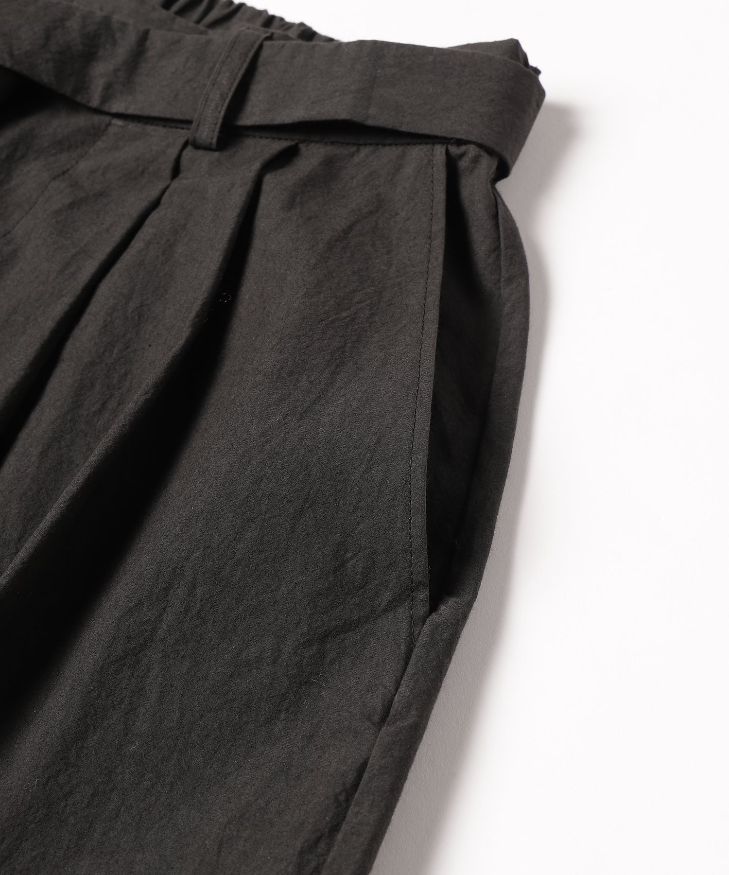 2タックセンタークリースダブル仕立てと、紳士服仕立ての要素に共生地ベルトを合わせたオーバーサイズシルエットのスラックス。