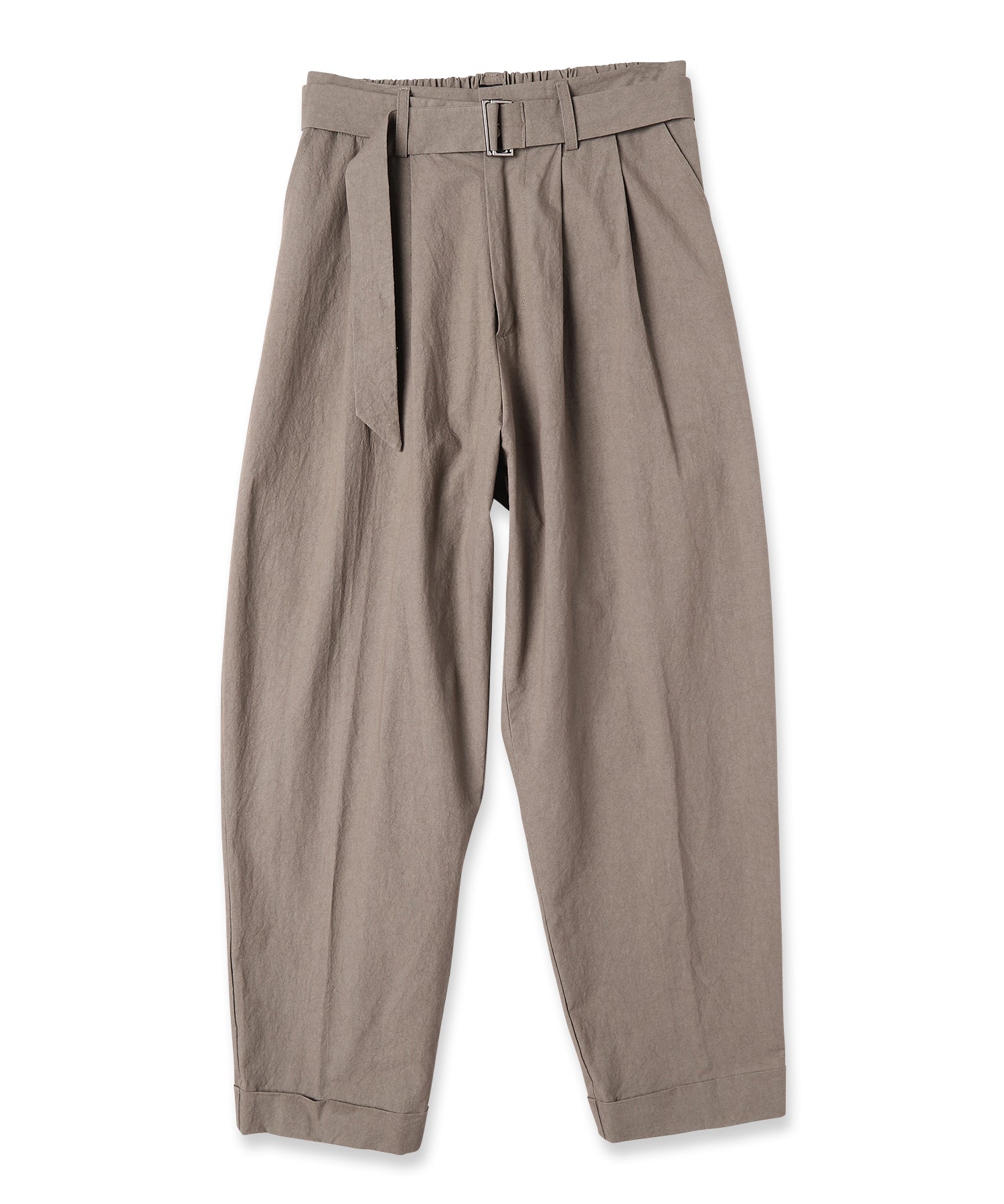 2タックセンタークリースダブル仕立てと、紳士服仕立ての要素に共生地ベルトを合わせたオーバーサイズシルエットのスラックス。