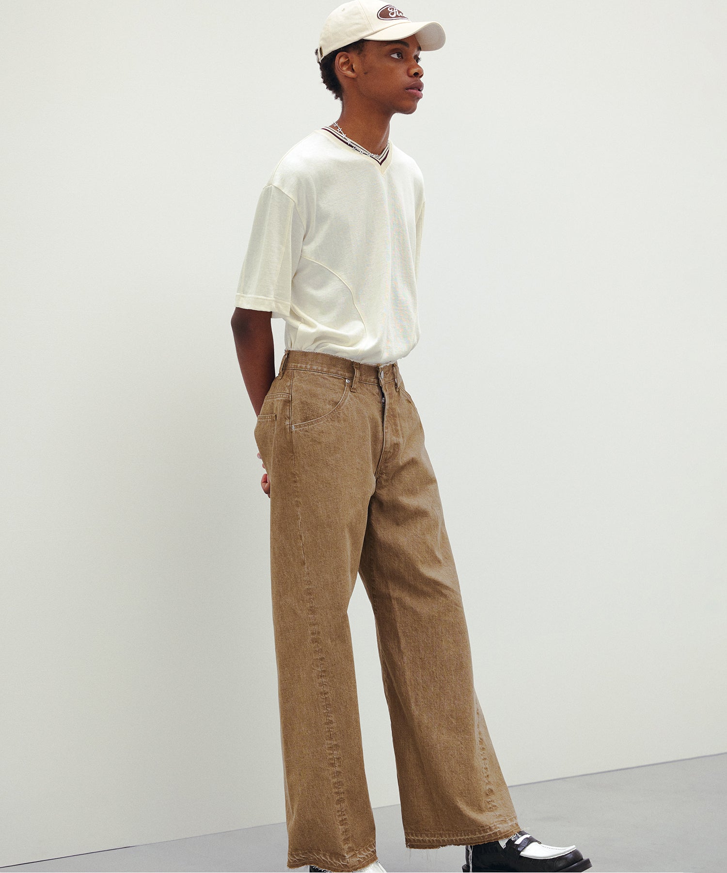 股上を浅めに設定することで腰回りはスッキリとしたシルエットが特徴的なワイドデニムです。