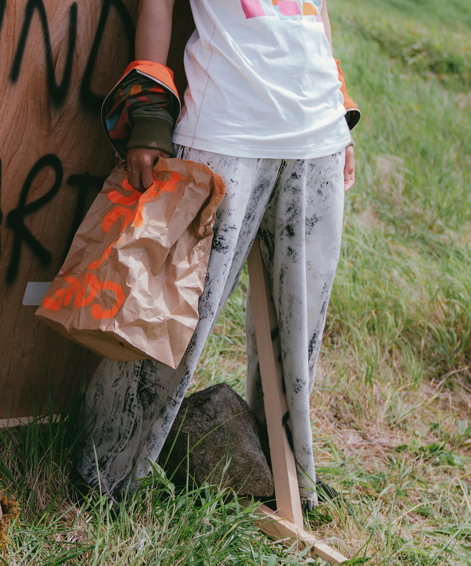 シルエットはオーバーサイズパンツ。裾にはスピンドル加えてシルエットに変化を持たせることが可能です。