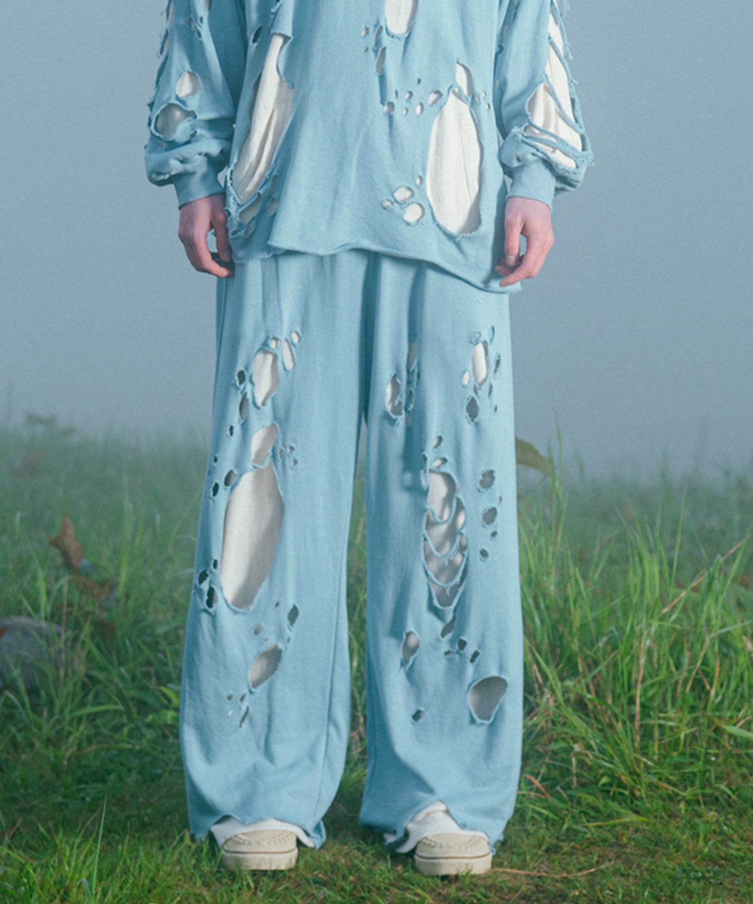 上部分の裏毛にはレーザーカットで1枚ずつダメージ加工を施しハードなクラッシュ感を演出しました。