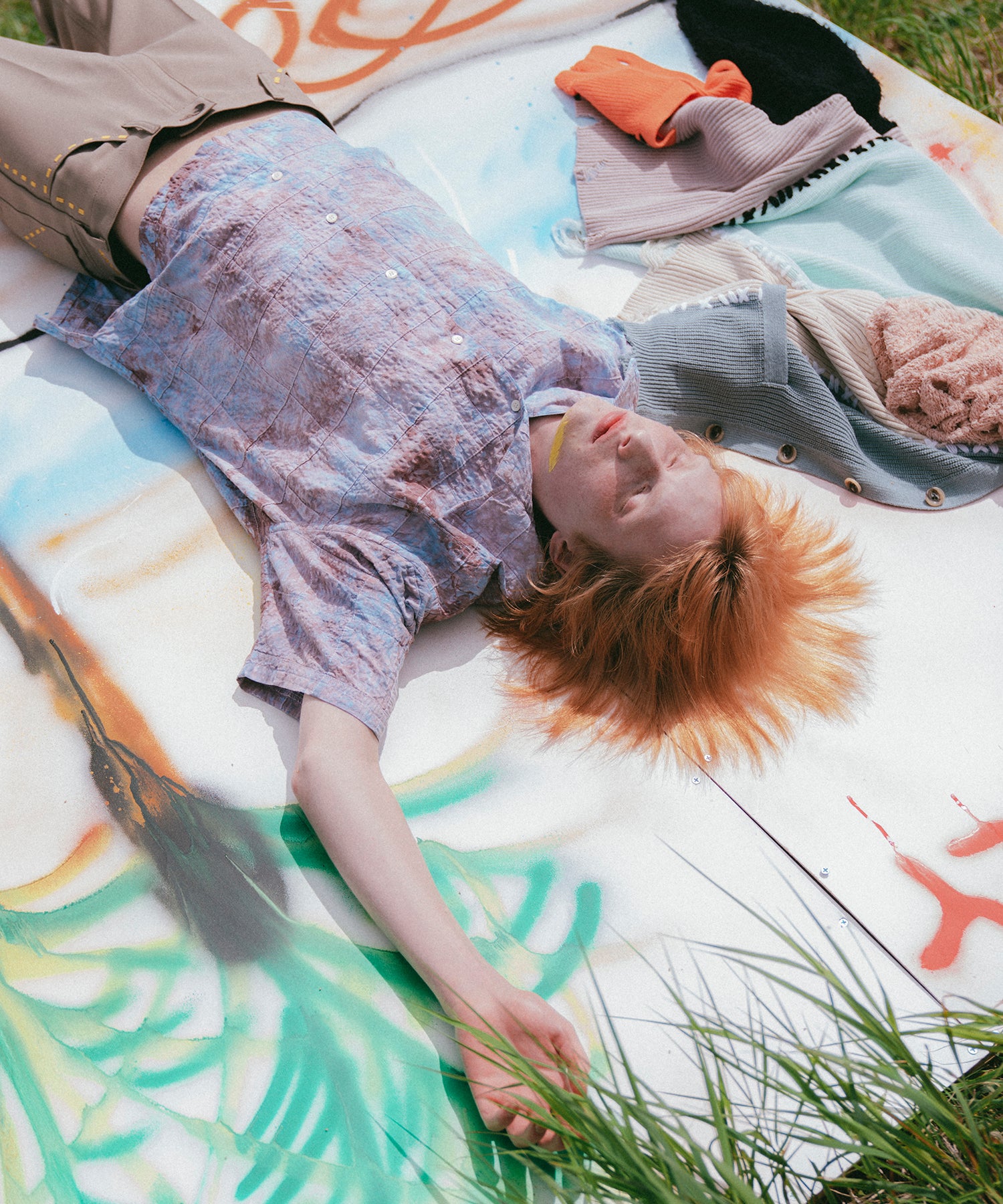 デザインはシアサッカー生地で規則的なパッチワークを縫製し、製品加工でタイダイ染めを施しました。
