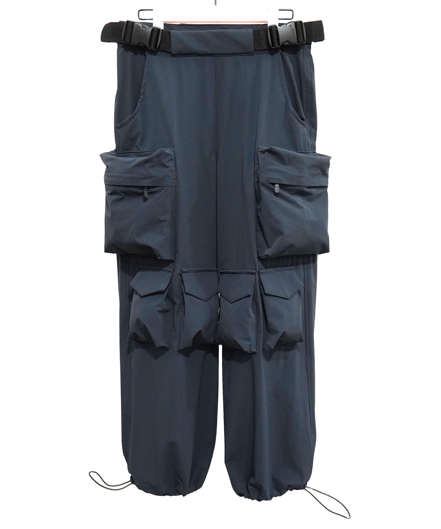 ポケットが多数ついたワイドシルエットのナイロンカーゴパンツ。