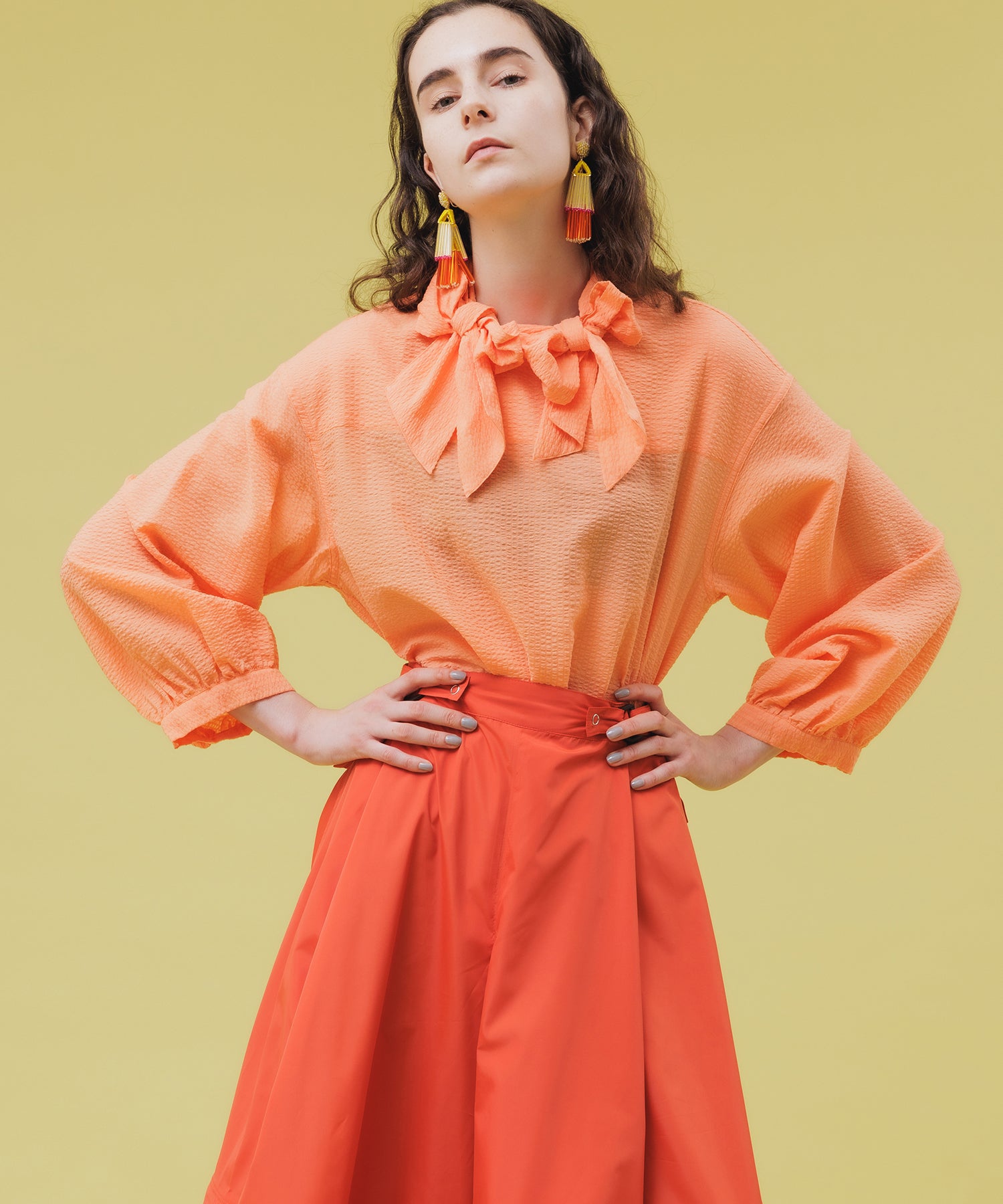 女性らしいリボンの装飾と共に、色鮮やかなビタミンカラーがコーディネートを華やかに演出してくれます。