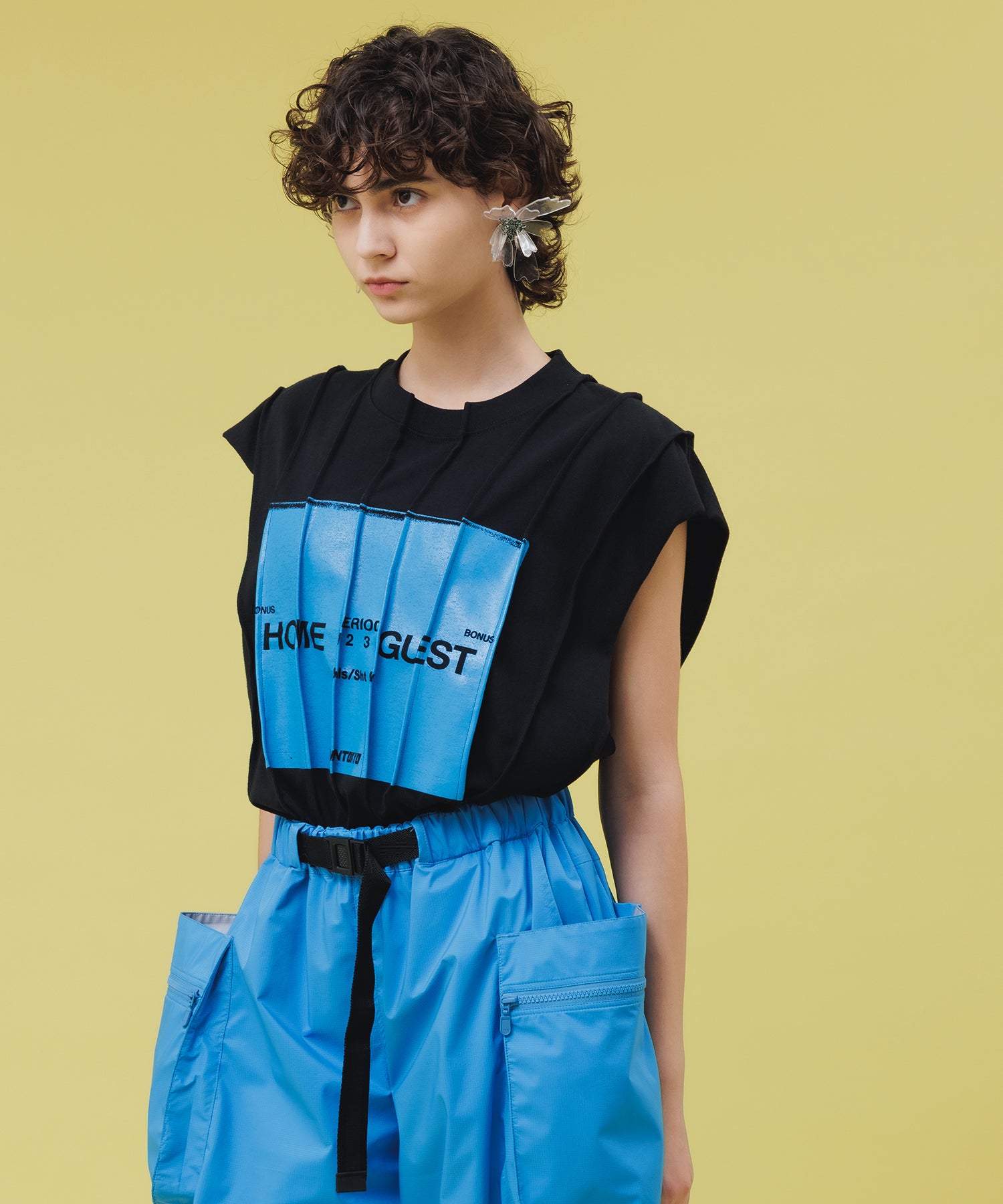 オリジナルグラフィックがプリントされたピンタック加工のノースリーブTシャツ。