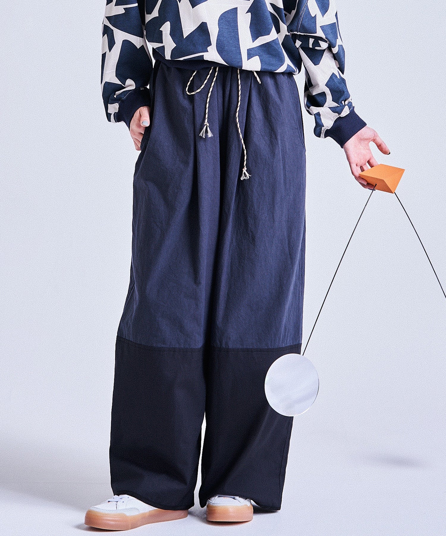 ウエストにははゴムと紐が通しています。幅広い身長、体格の方に履いていただけるワイドパンツです