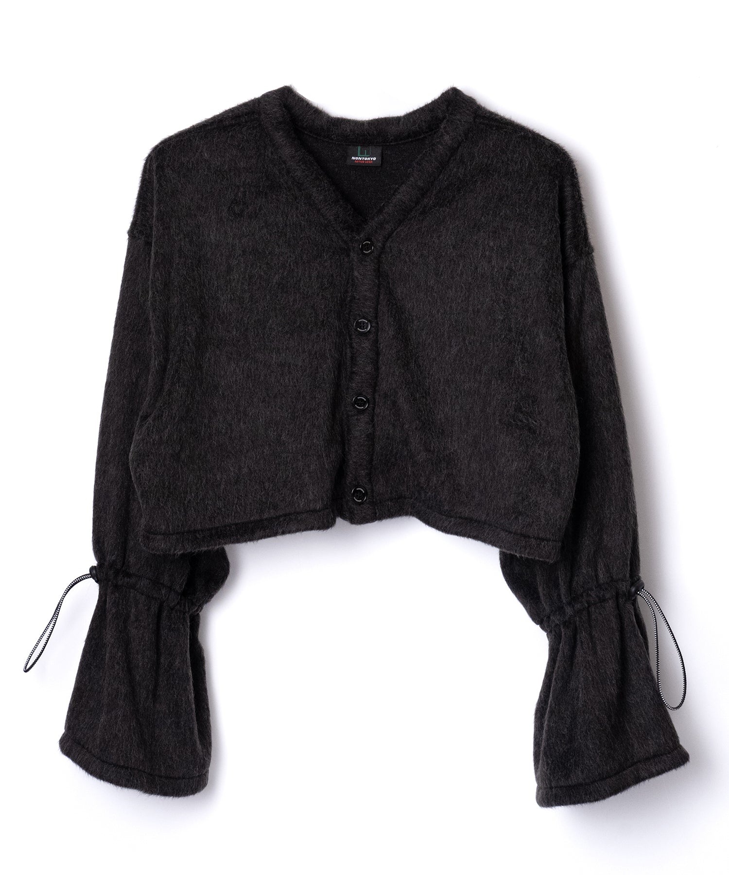 ボリューム感と軽量感を併せ持つアクリル/ウールの混紡糸で織られたジャージー素材で、モヘア調の生地を使用し、伸縮性に優れているのが特徴です。
