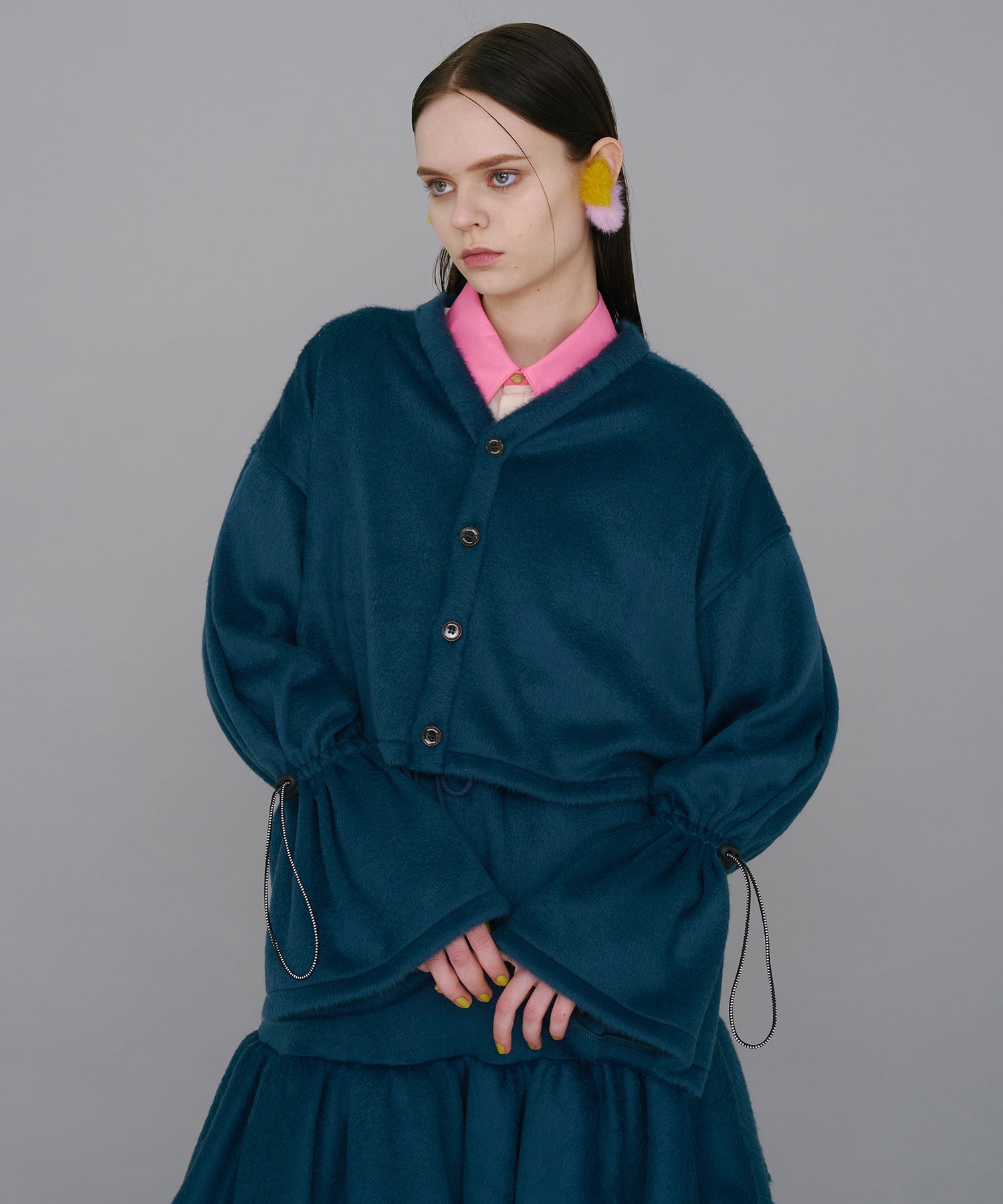 ボリューム感と軽量感を併せ持つアクリル/ウールの混紡糸で織られたジャージー素材で、モヘア調の生地を使用し、伸縮性に優れているのが特徴です。