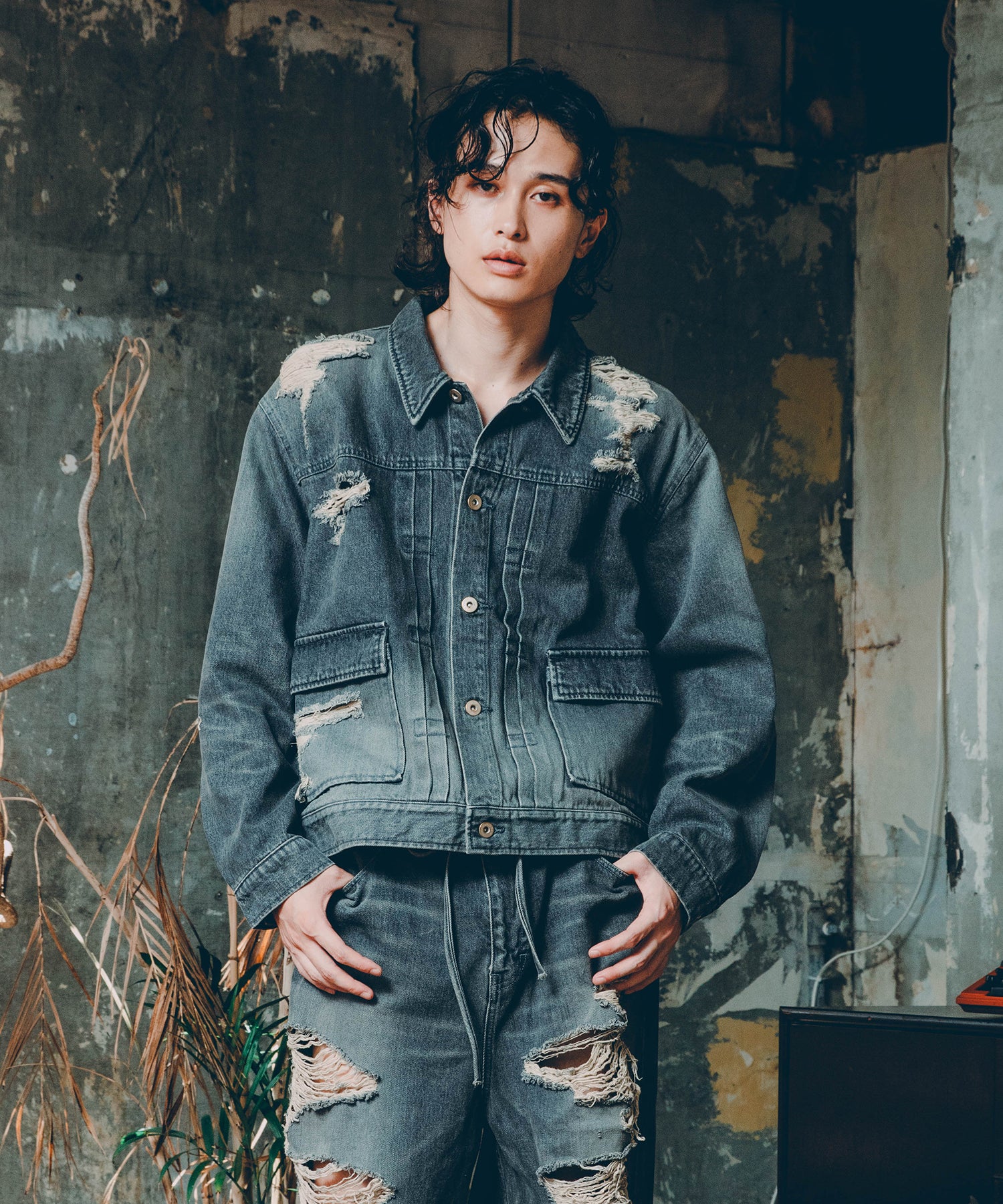 職人て丁寧に仕上げたブリーチ加工。ハードな擦り加工、糸をあえて残し穴を開けたクラッシュ加工、クラッシュ部分にはブリーチをかけ着古したような風合いもプラスしています。一枚の中に、多くの加工を施しデザインしたこだわりの一枚。