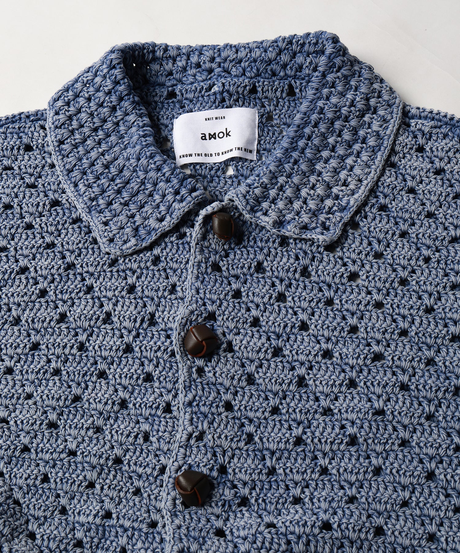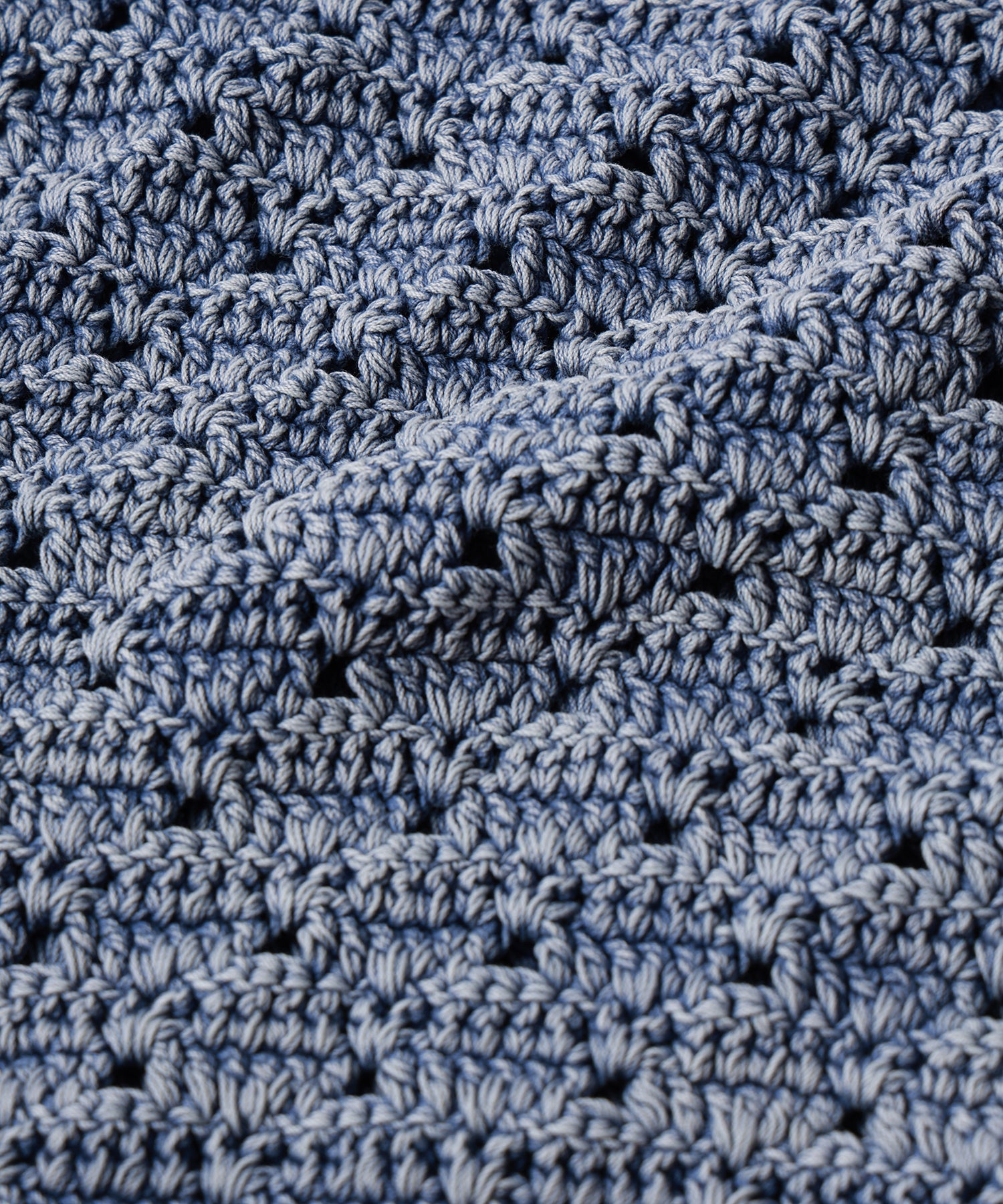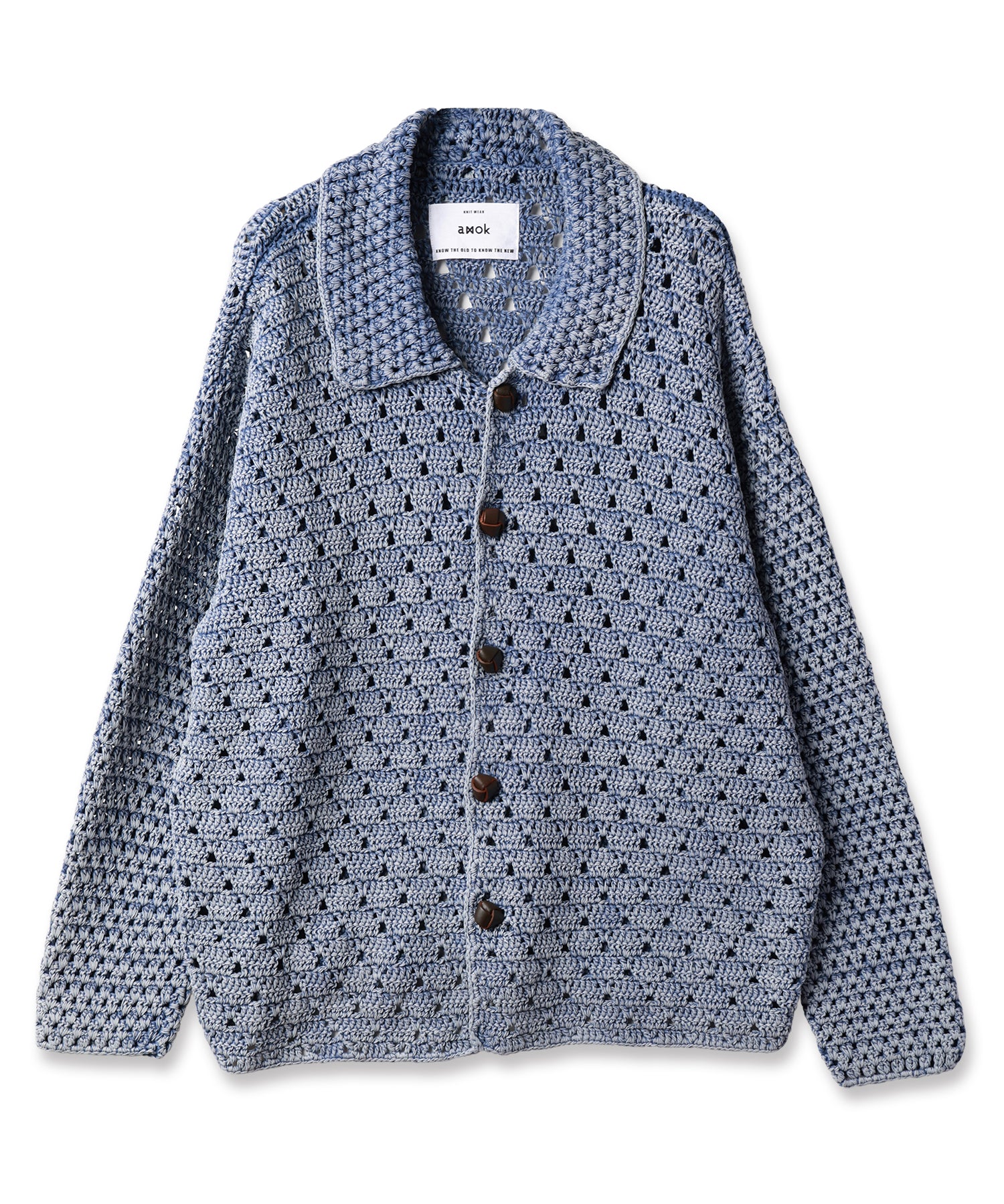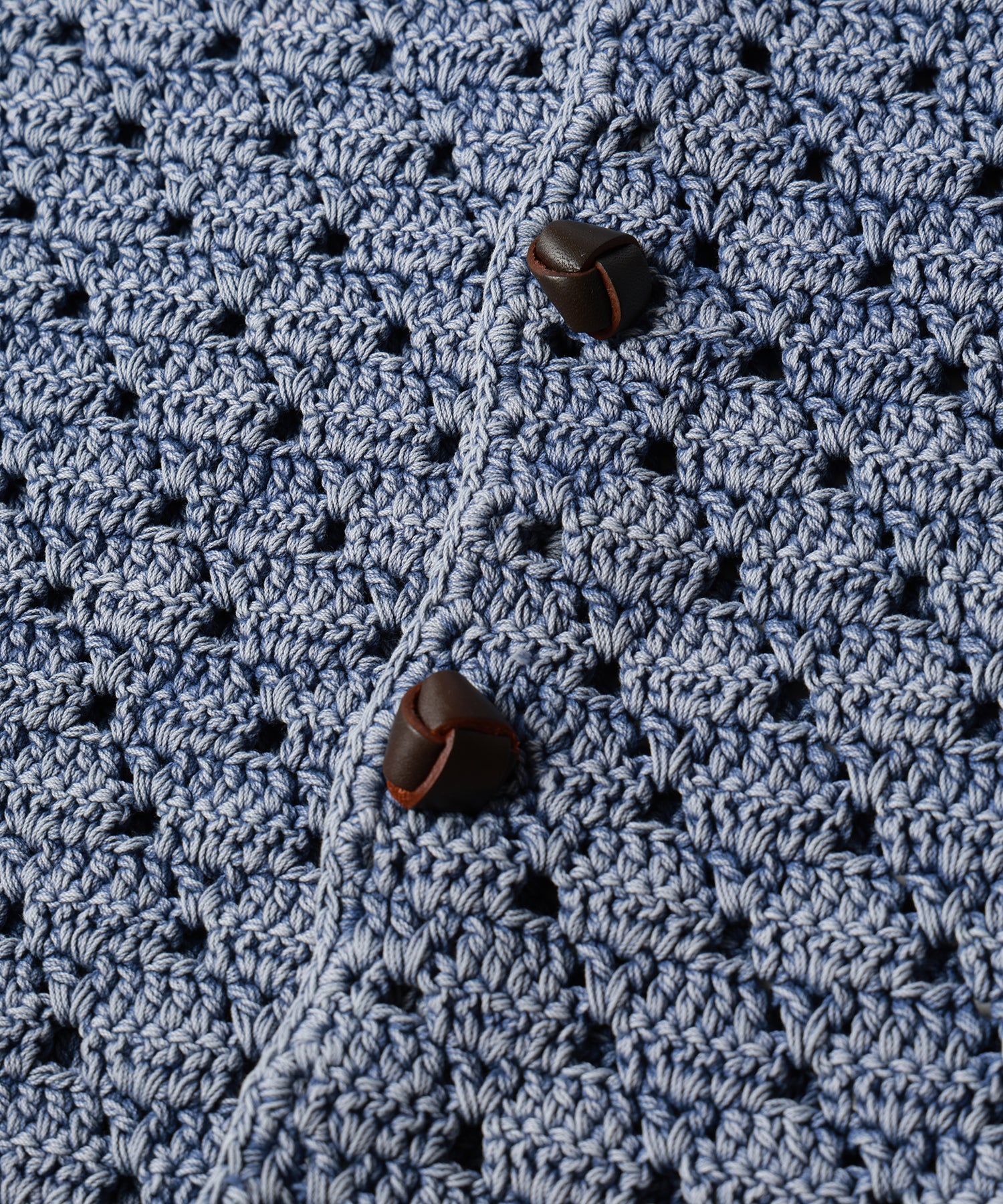 糸はコットン糸でオールかぎ針の手編みで作成した衿付きのカーディガン。