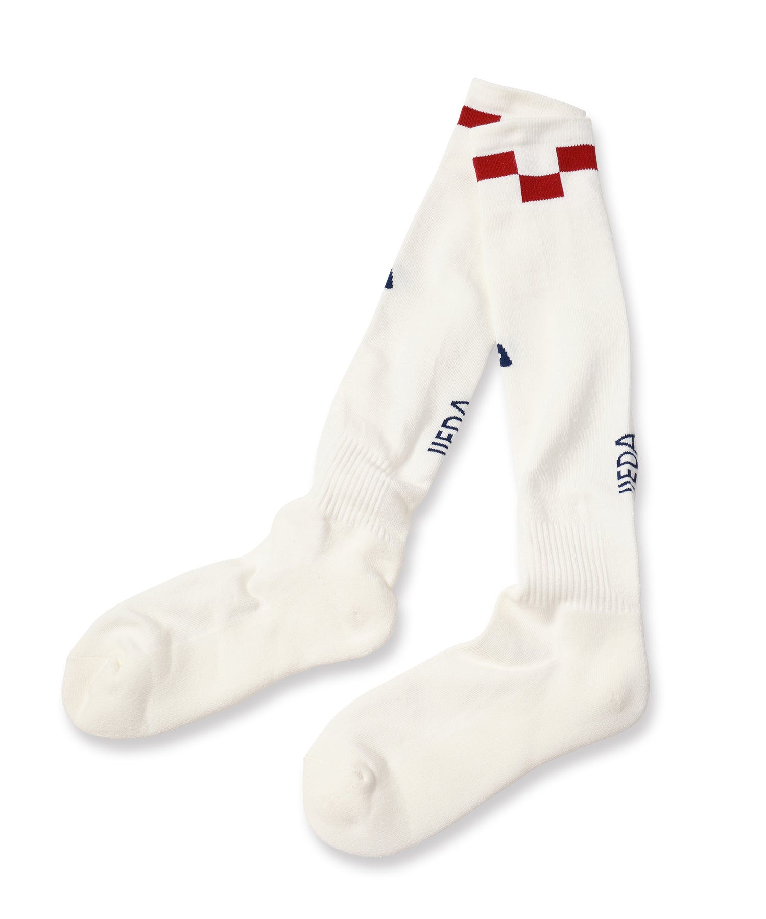 フットボールソックスをモチーフとした膝下までのロングソックス.
