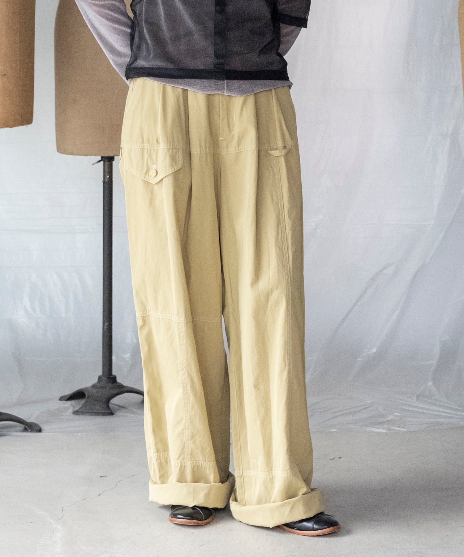 ブランドで使用している色んなボタンやポケットの形を見本のように取り入れたデザインパンツ。