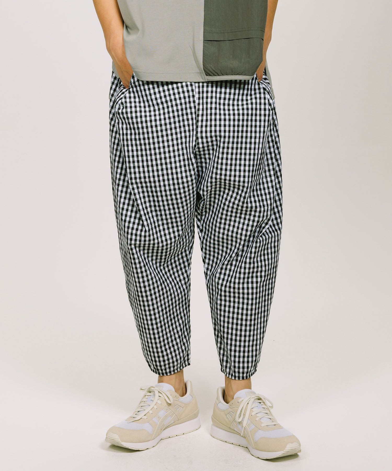 リサイクルポリエステルを使用した、薄手でシボ感のある軽やかなギンガムチェック生地でできたsneeuw定番のコクーンシルエットのパンツ。