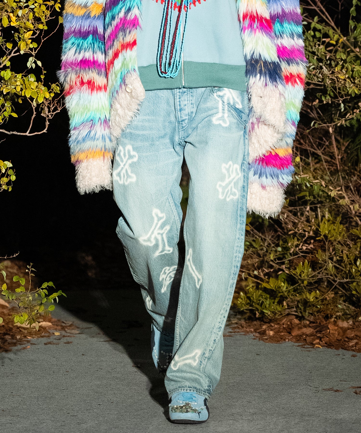 多種多様な“モンスター”たちを立体的にあしらったニット。レインボーカラーが鮮やかなオーバーサイズのシャギーニットは、長めの毛足がモンスターの体表を覆う“毛”を思わせるディテールに。