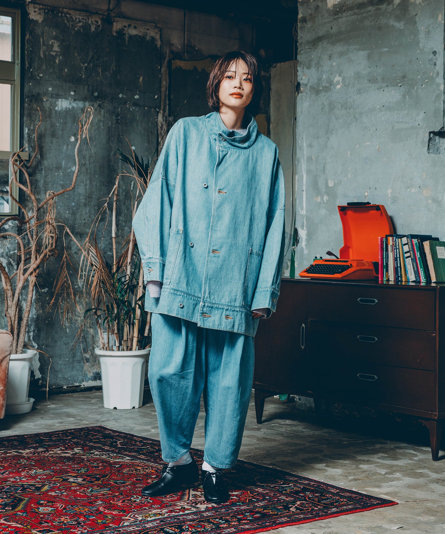 セットアップでデニムパンツも展開。トータルでのスタイリングもおすすめです。