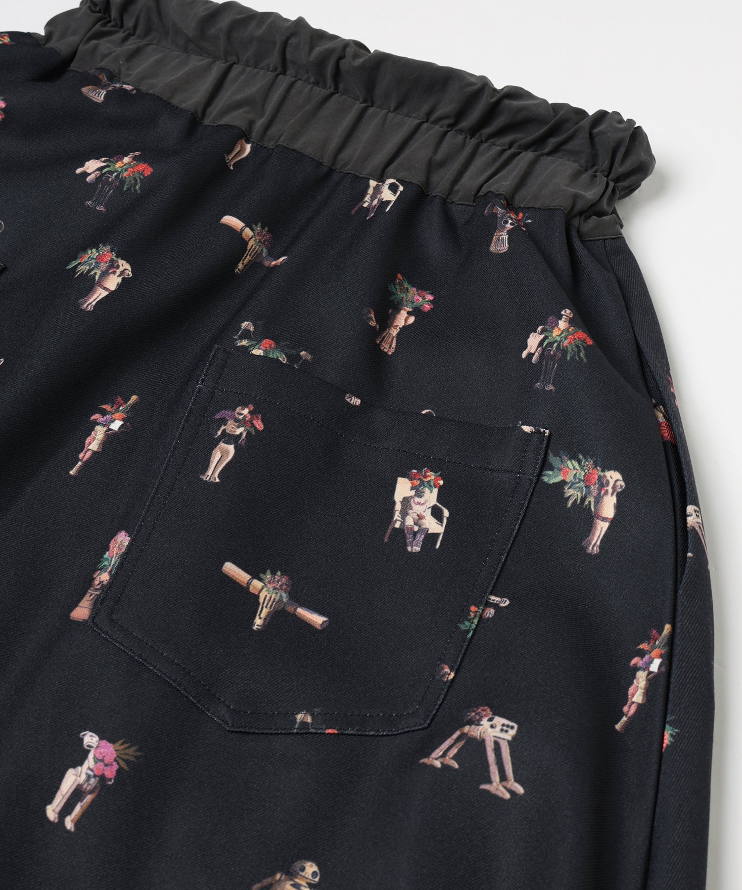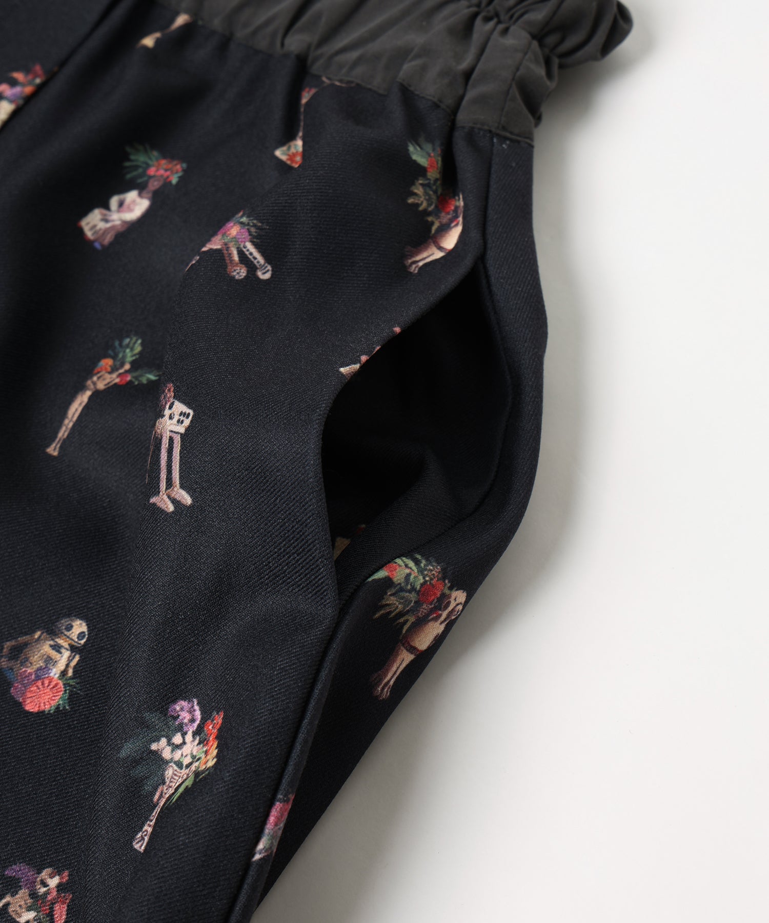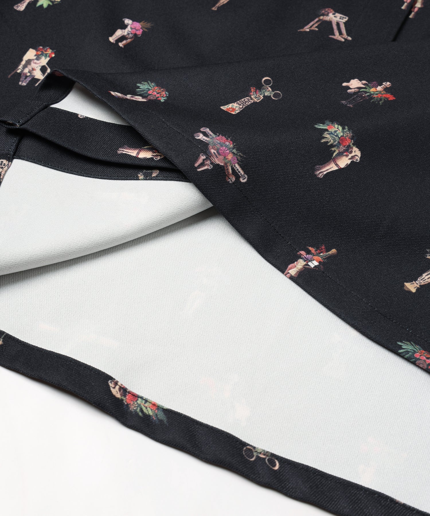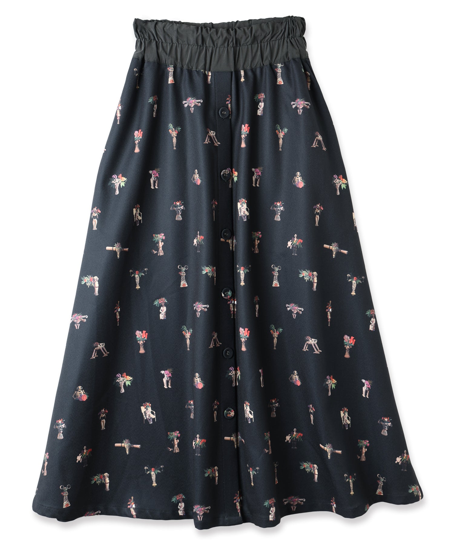 現世とは違う世界線で出土した無数のSF土偶がプリントされたクリエイティビティ溢れるユニークな総柄が印象的なマキシスカートです。