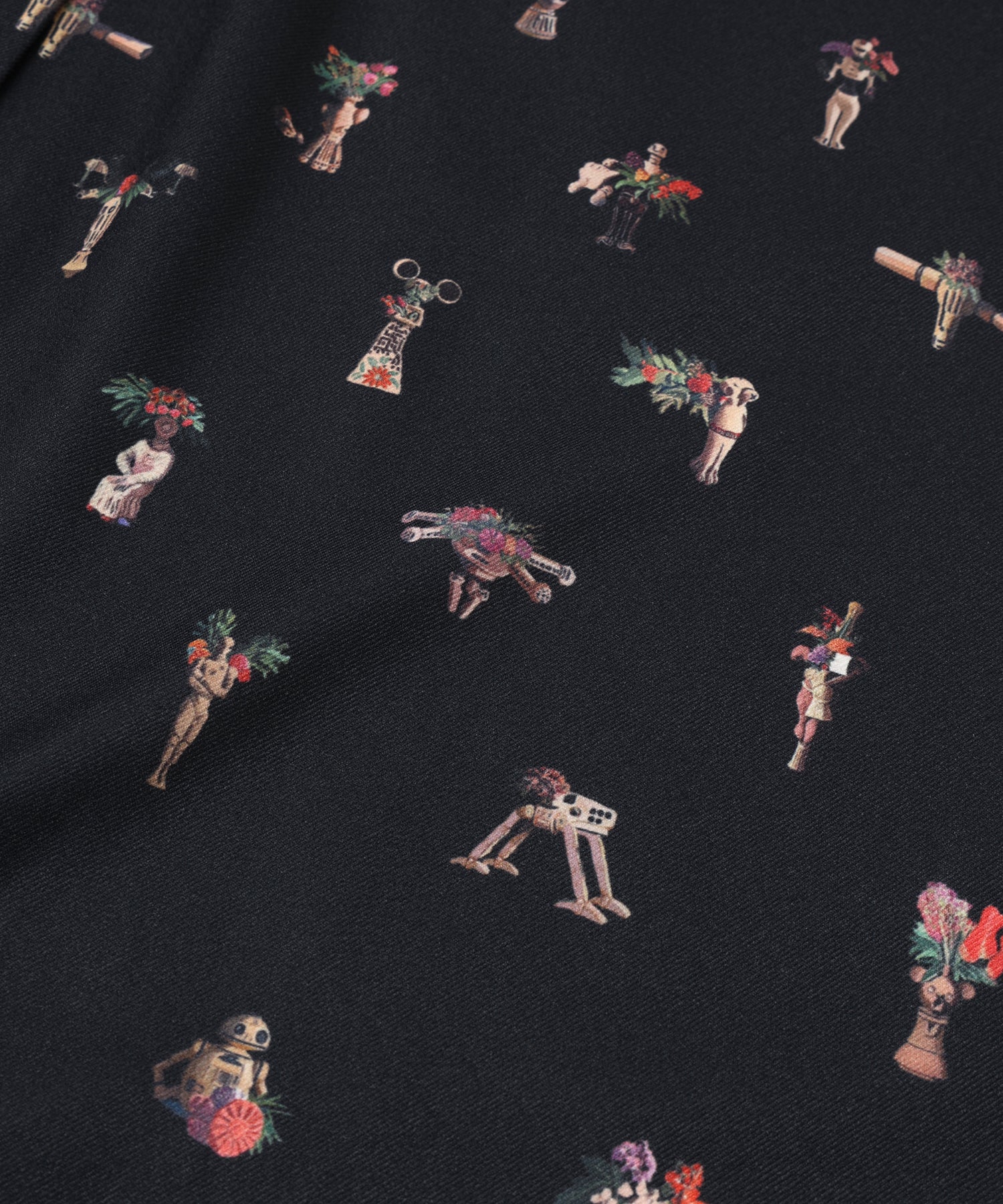 現代とは違うベクトルの世界から出土した架空の土偶を総柄で描いたプリントや、新しく描いた縄文様やシルエットを展開