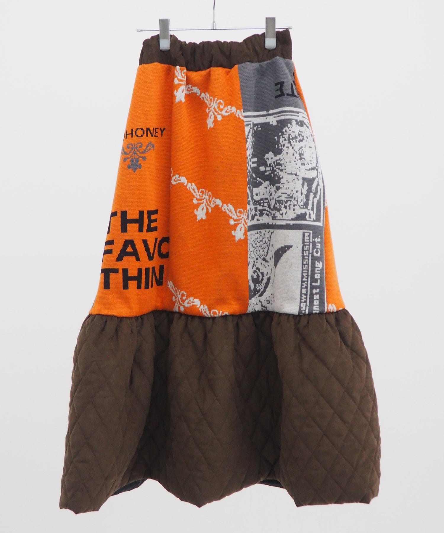 今季登場したオリジナル柄を用いたニットマフラーと、キルティング生地を使用したマキシ丈のスカート。