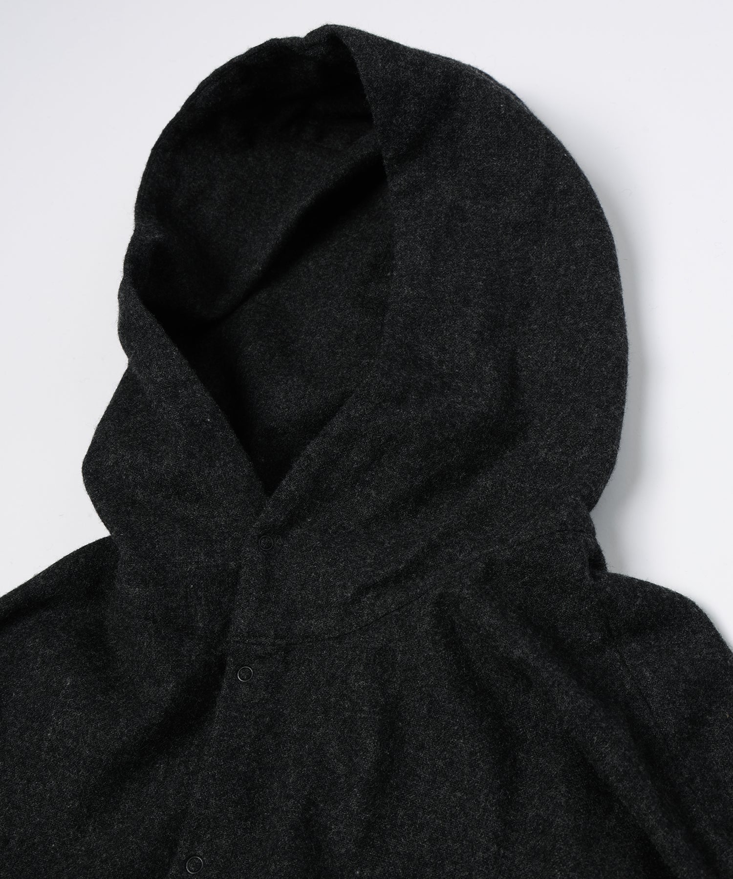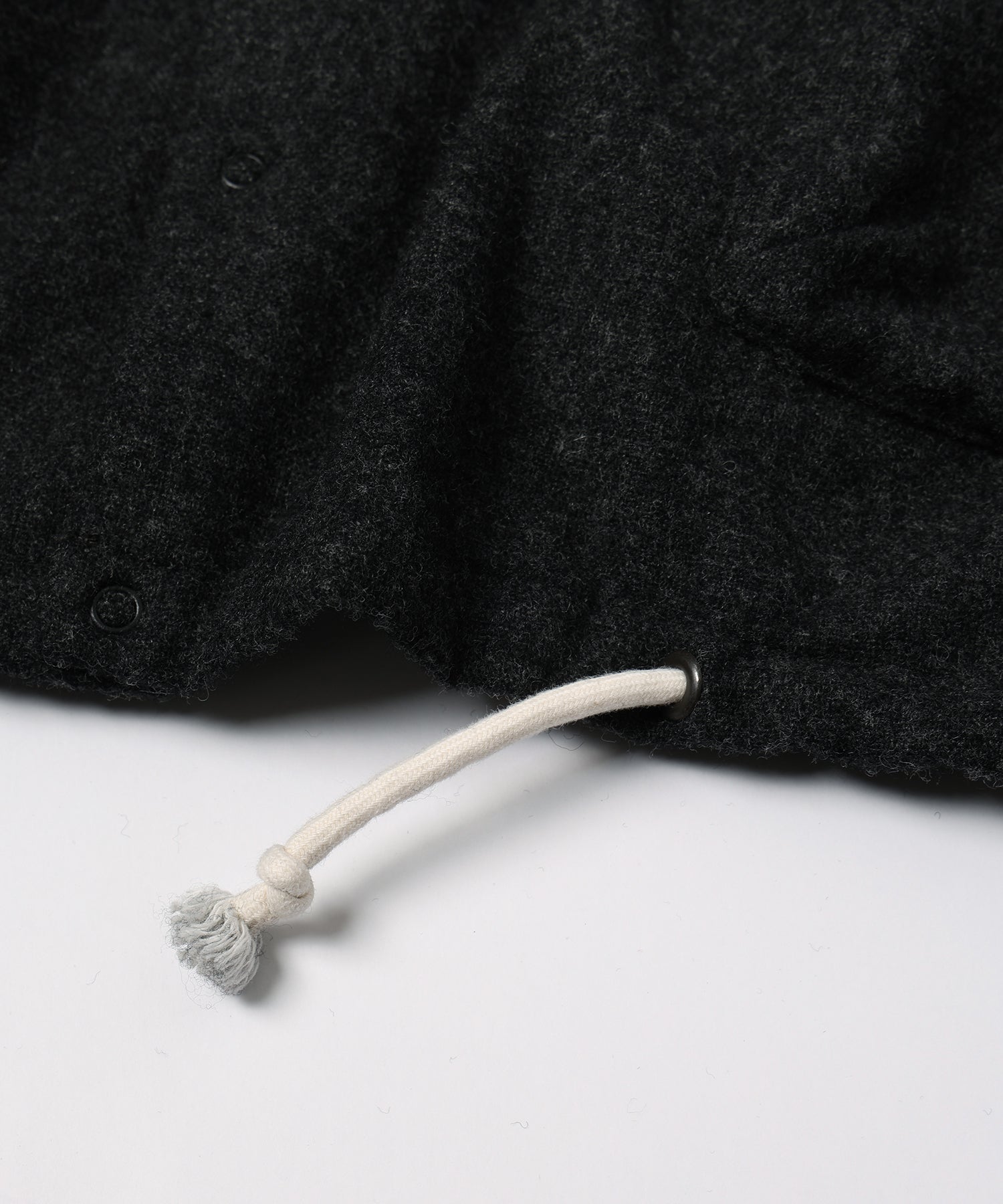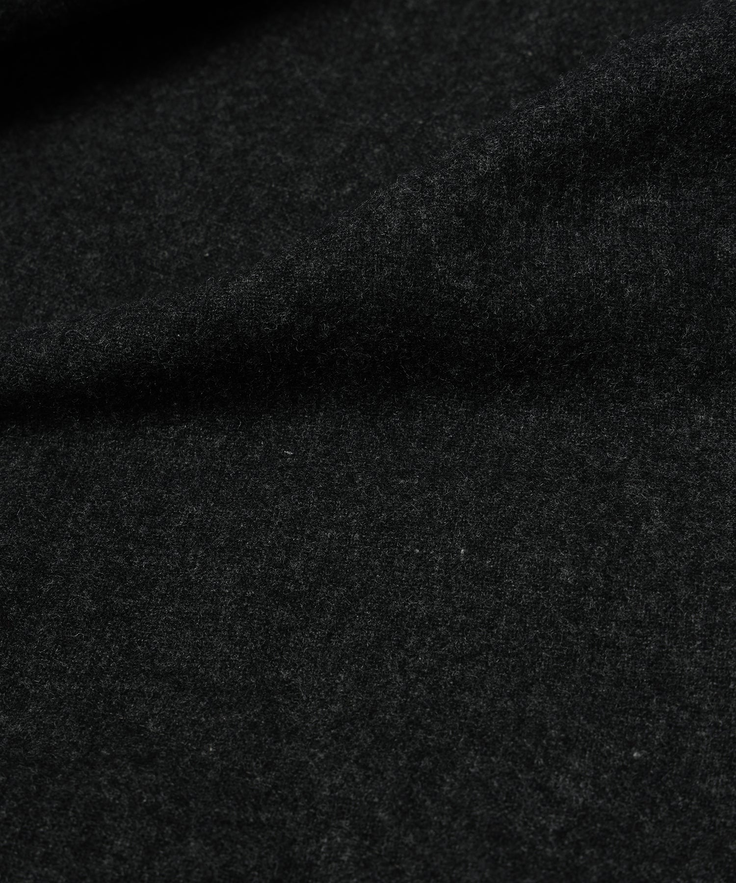 縮絨ウール素材を使用しました。やわらかさと肌触りとともに、加工により糸が膨らんでいることで編み目が詰まり防寒性が引き上がっています。