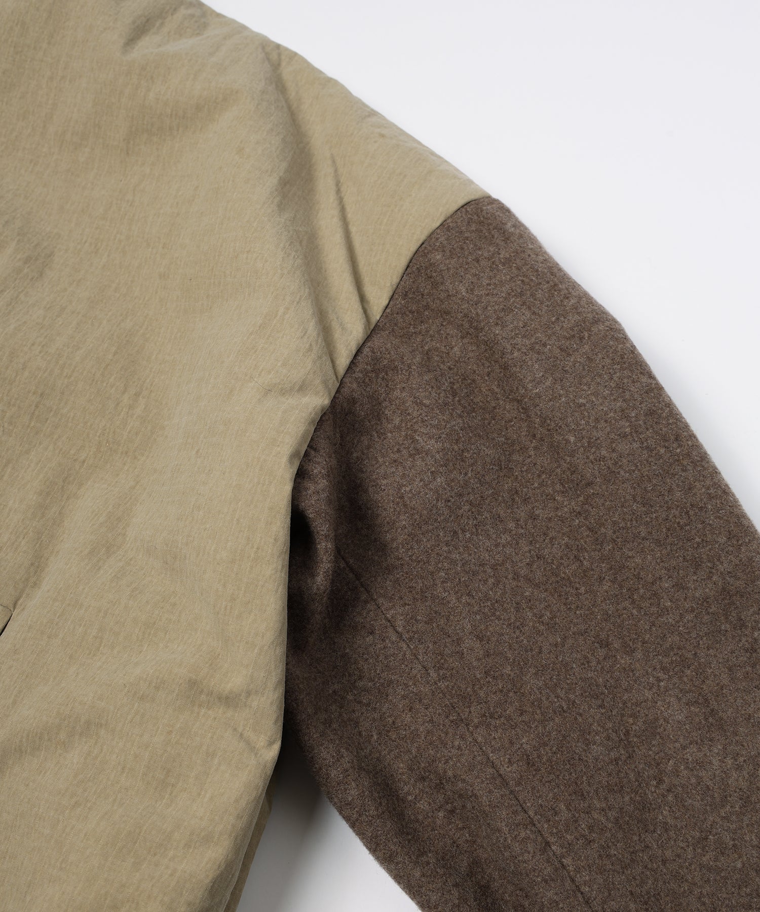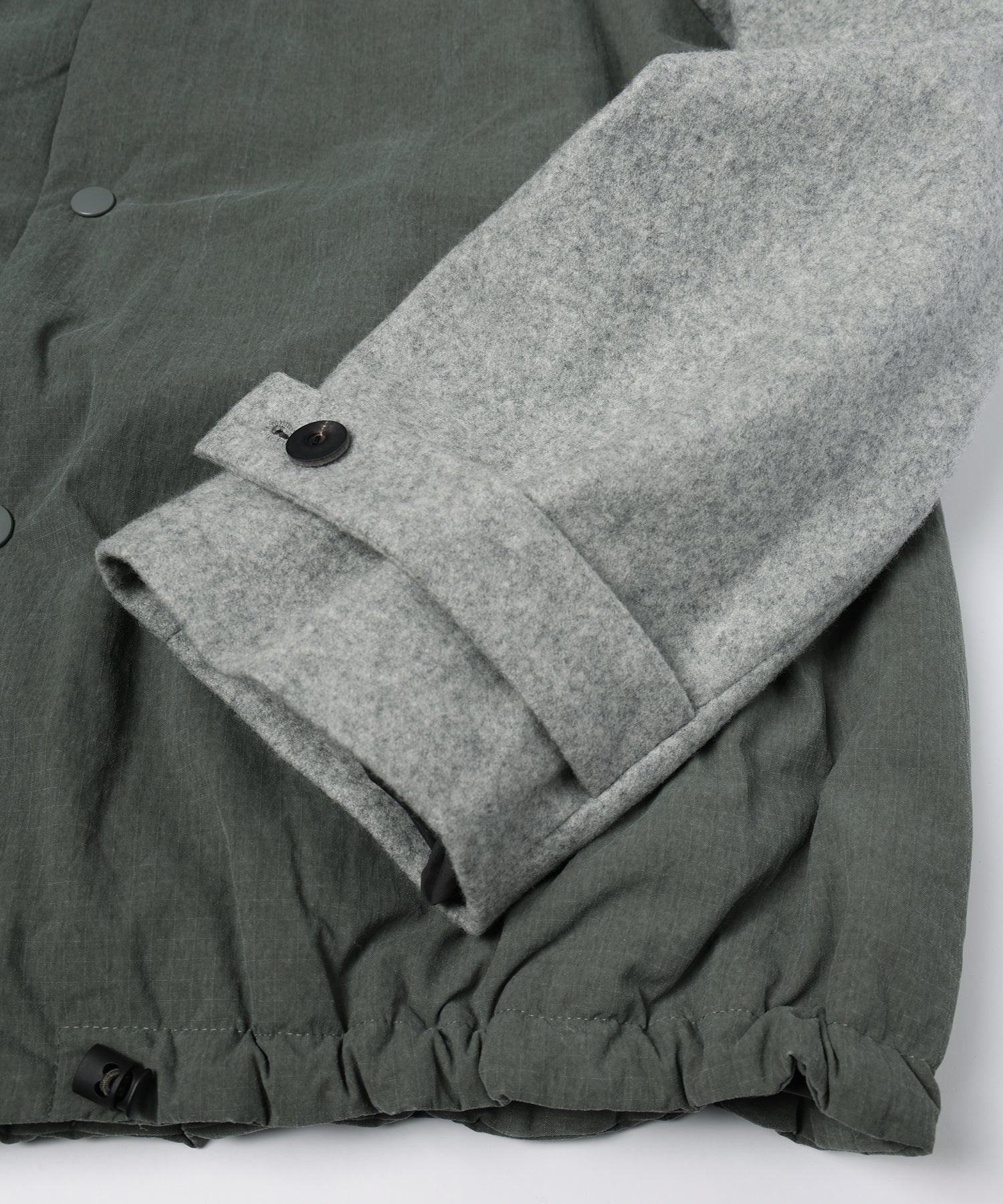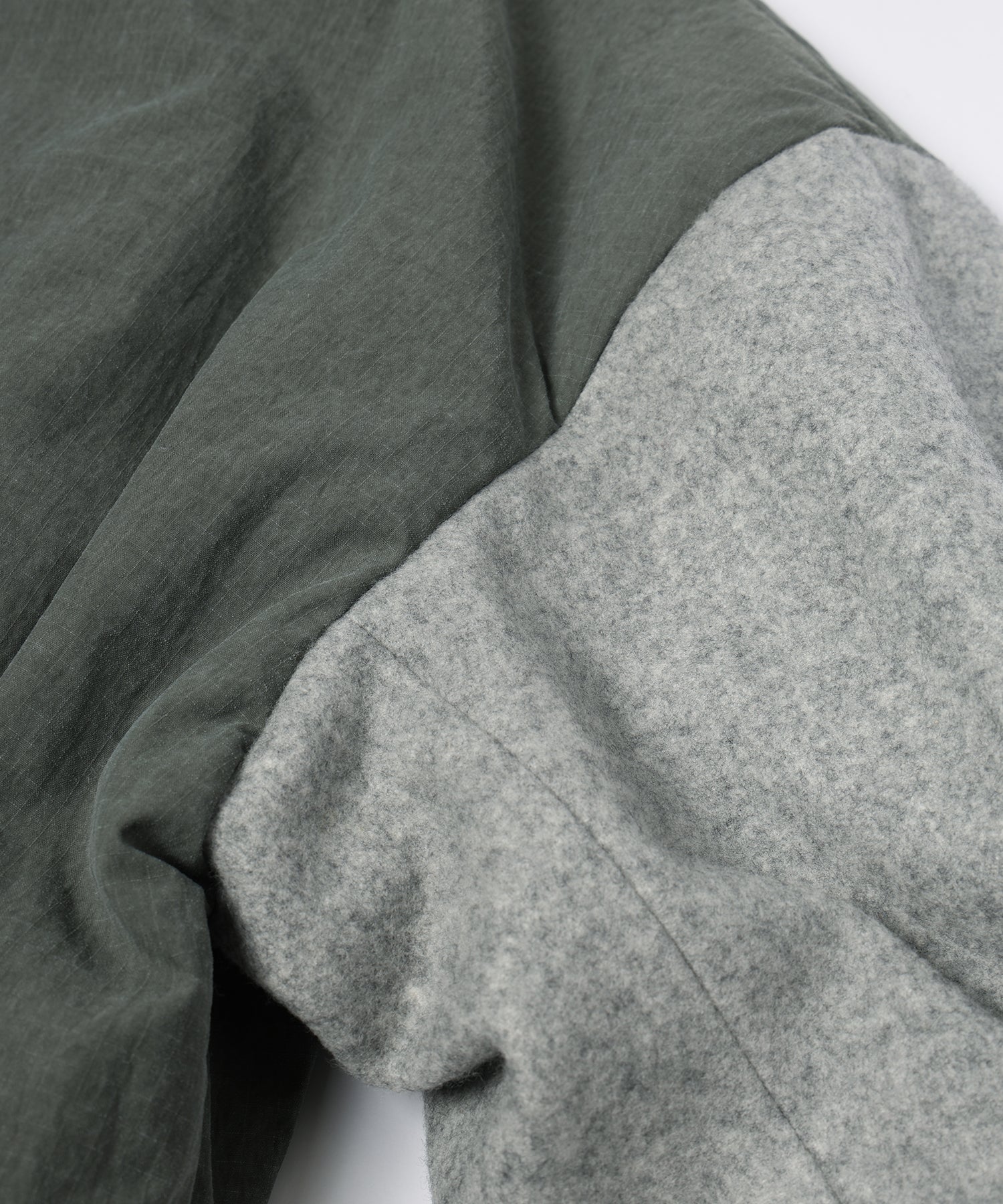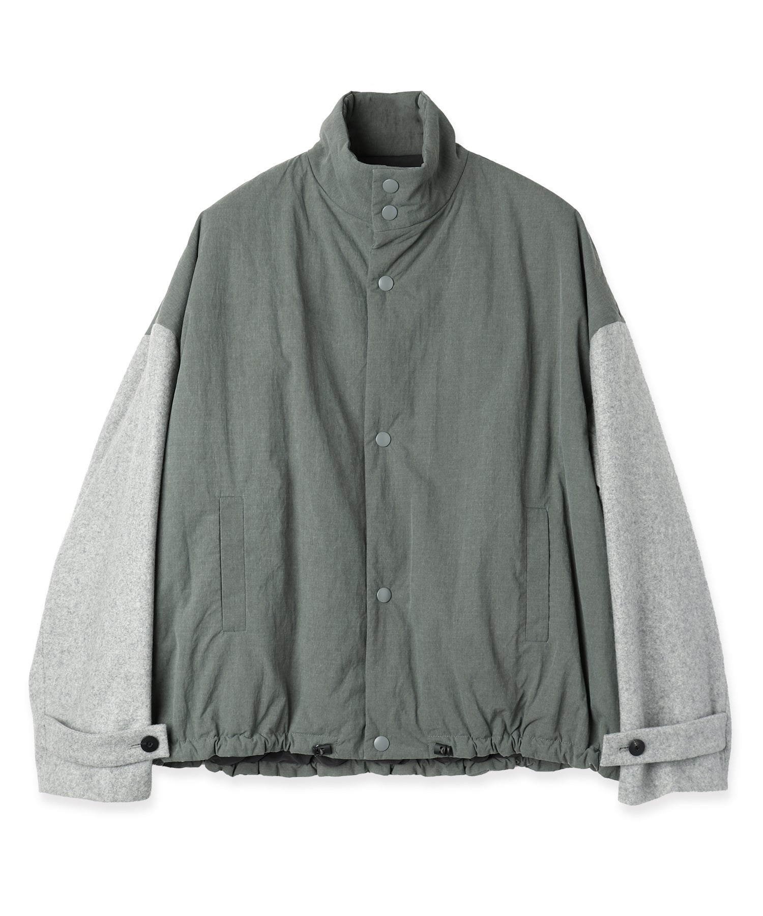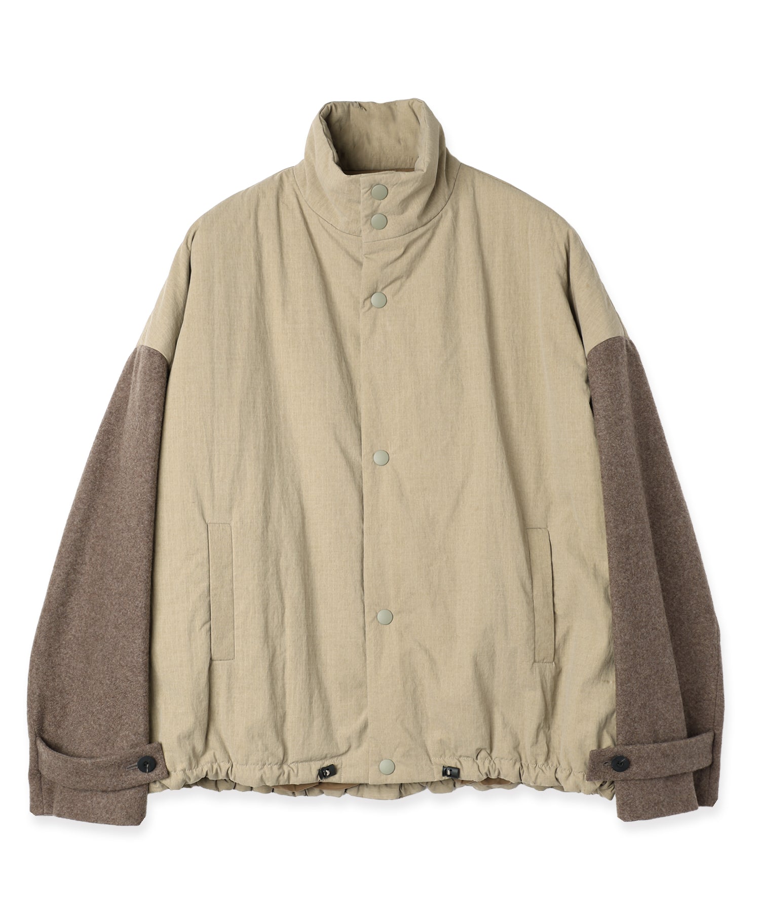 ふたつの異なる素材使用し、切り替えデザインを施したスタンドネックの中綿入りブルゾン。