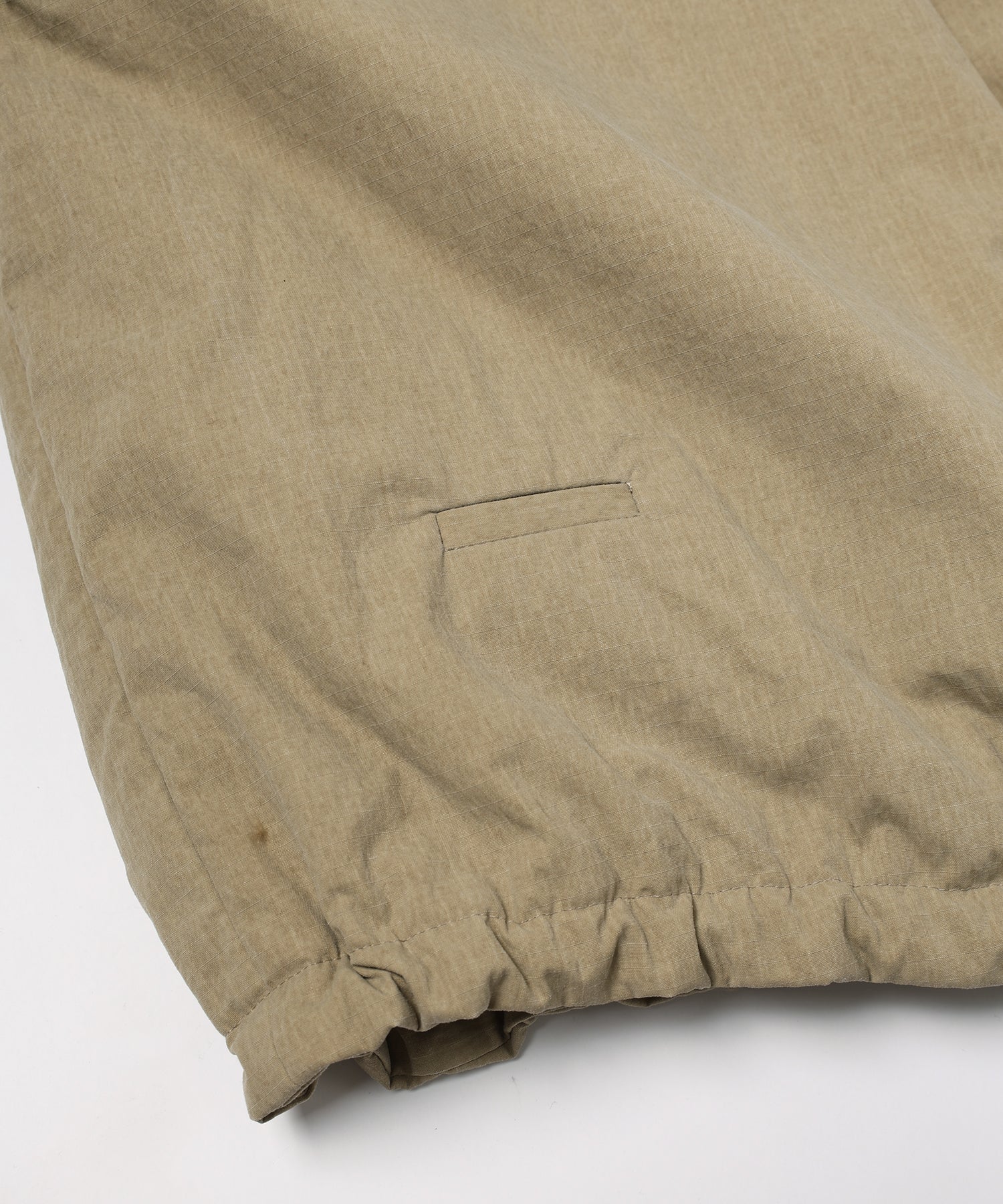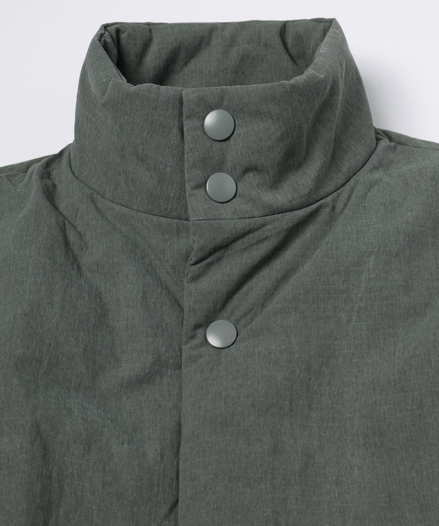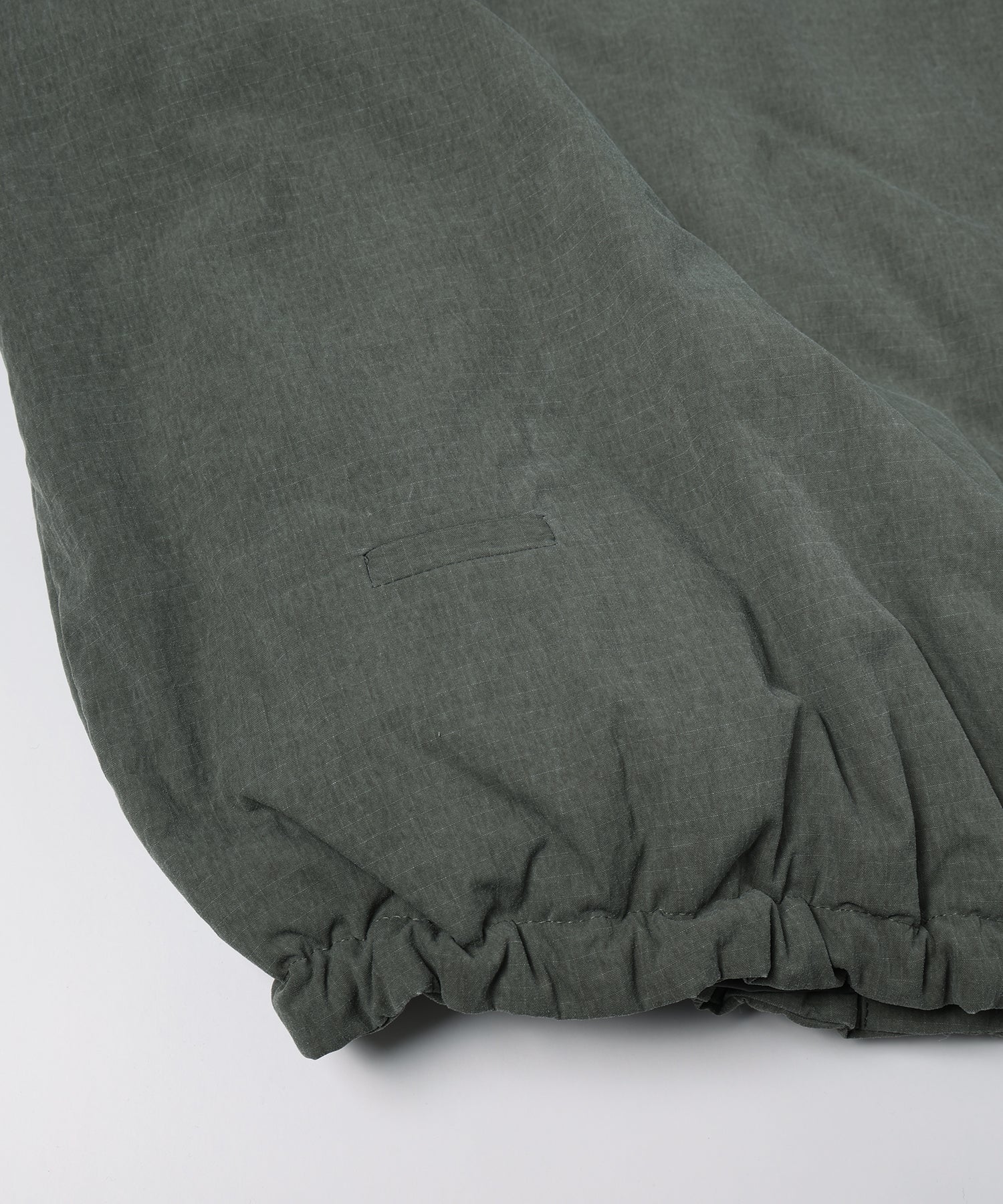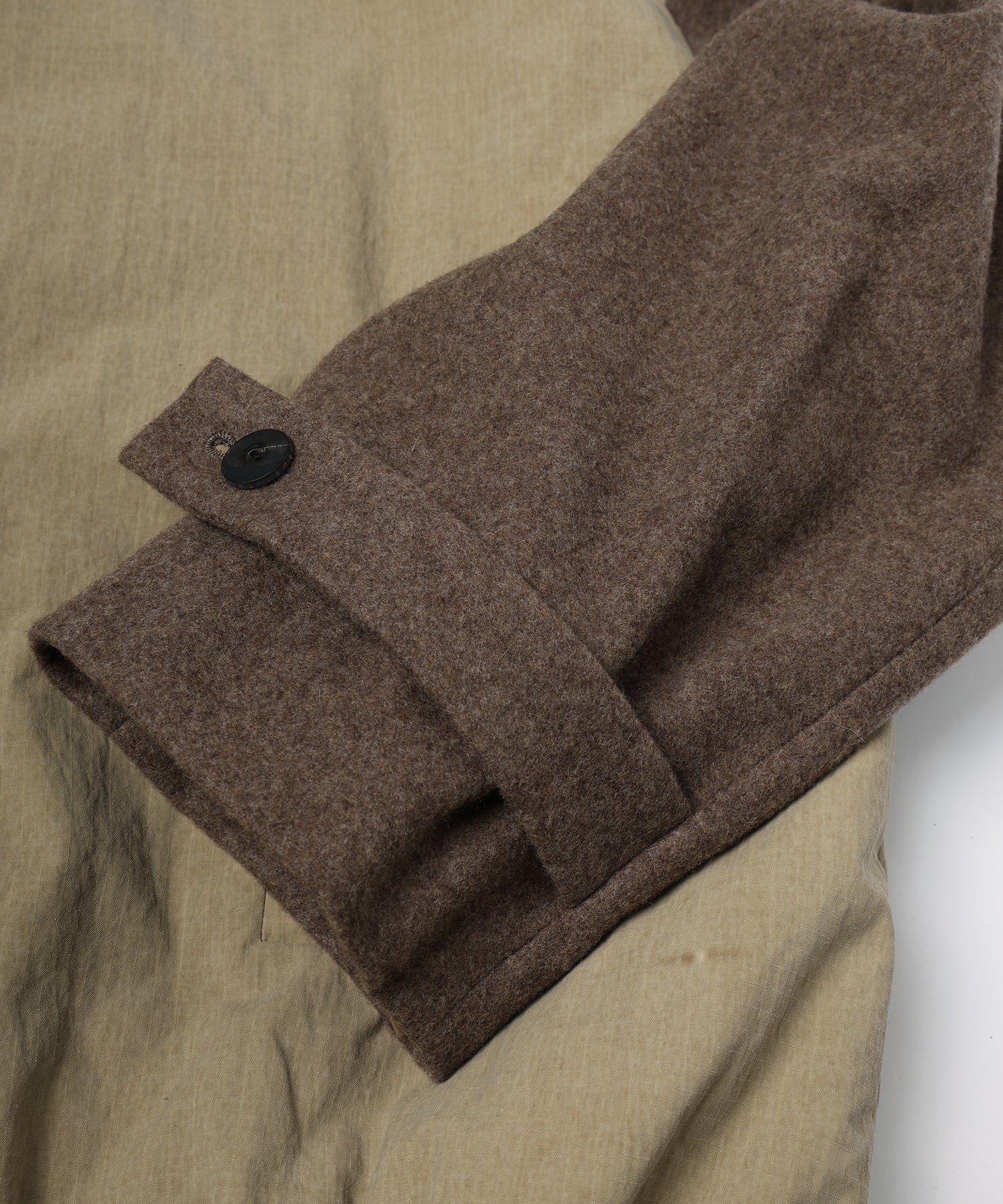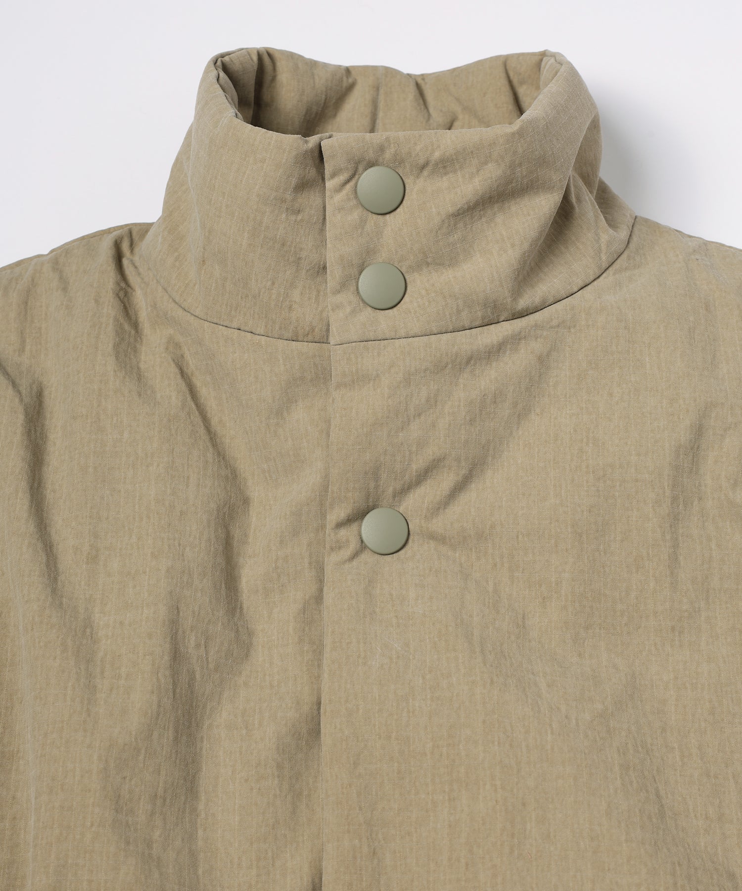 ふたつの異なる素材使用し、切り替えデザインを施したスタンドネックの中綿入りブルゾン。